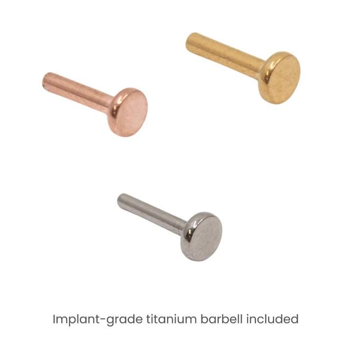 THIS PIECE COMES WITH a matching 16 gauge threadless flatback titanium barbell in either 5mm, 6mm, 7mm or 8mm length with a 3mm flatback. To purchase a Solid Gold Barbell click here: