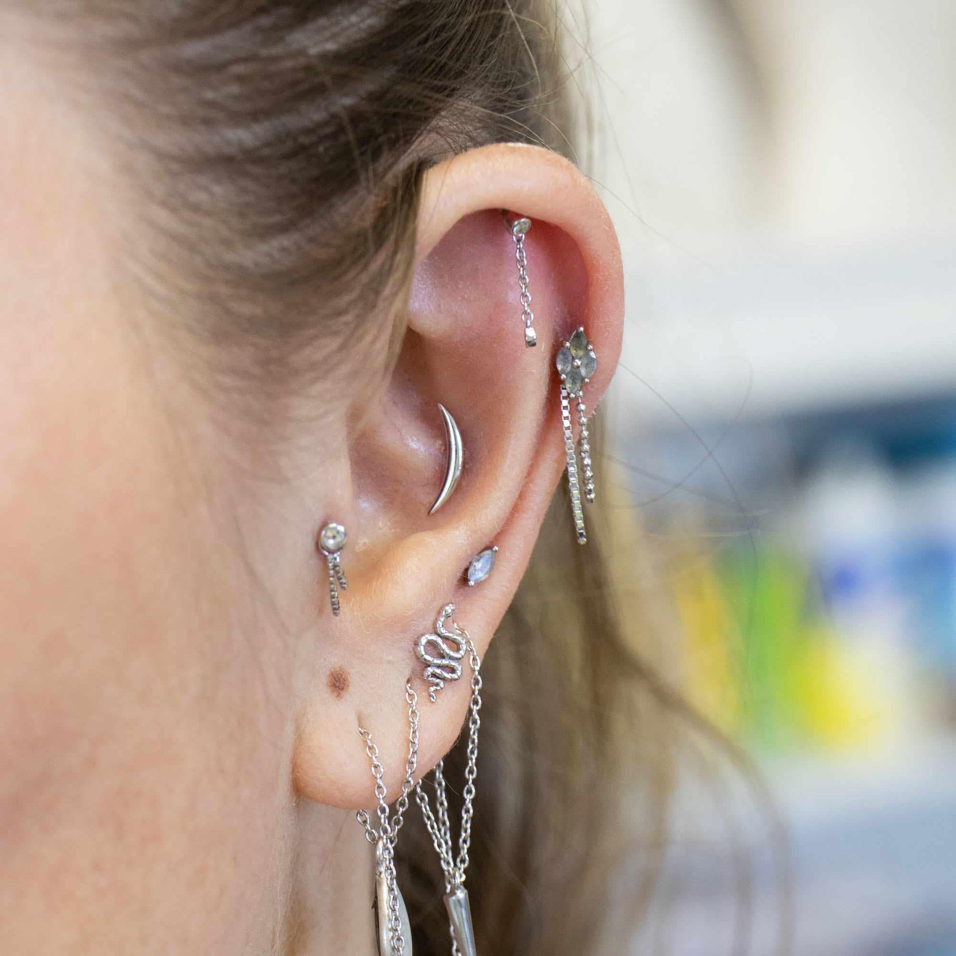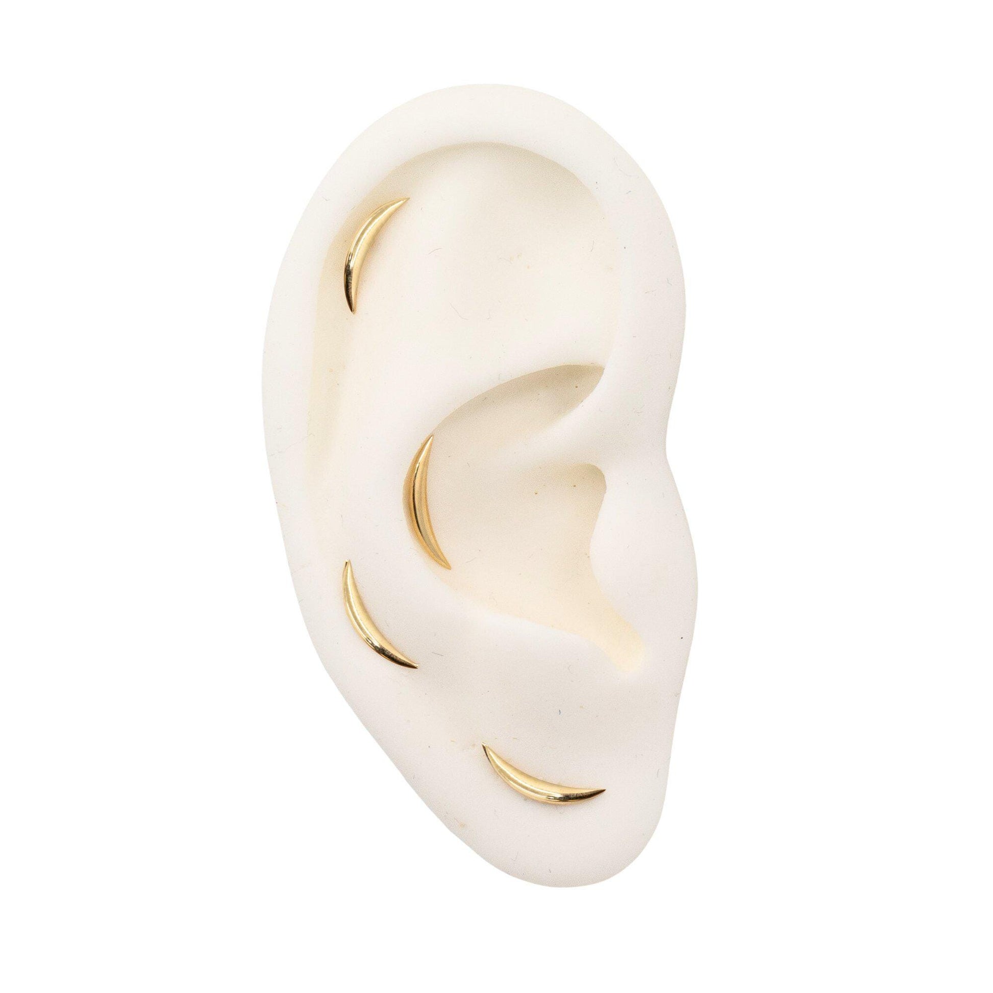 Our curved earring is set in 14k gold and has a gorgeous polished finish and is the perfect piece to fit to a mid-helix, helix or conch piercing. It can also work in the lobe depending on your anatomy and placement of your piercings.