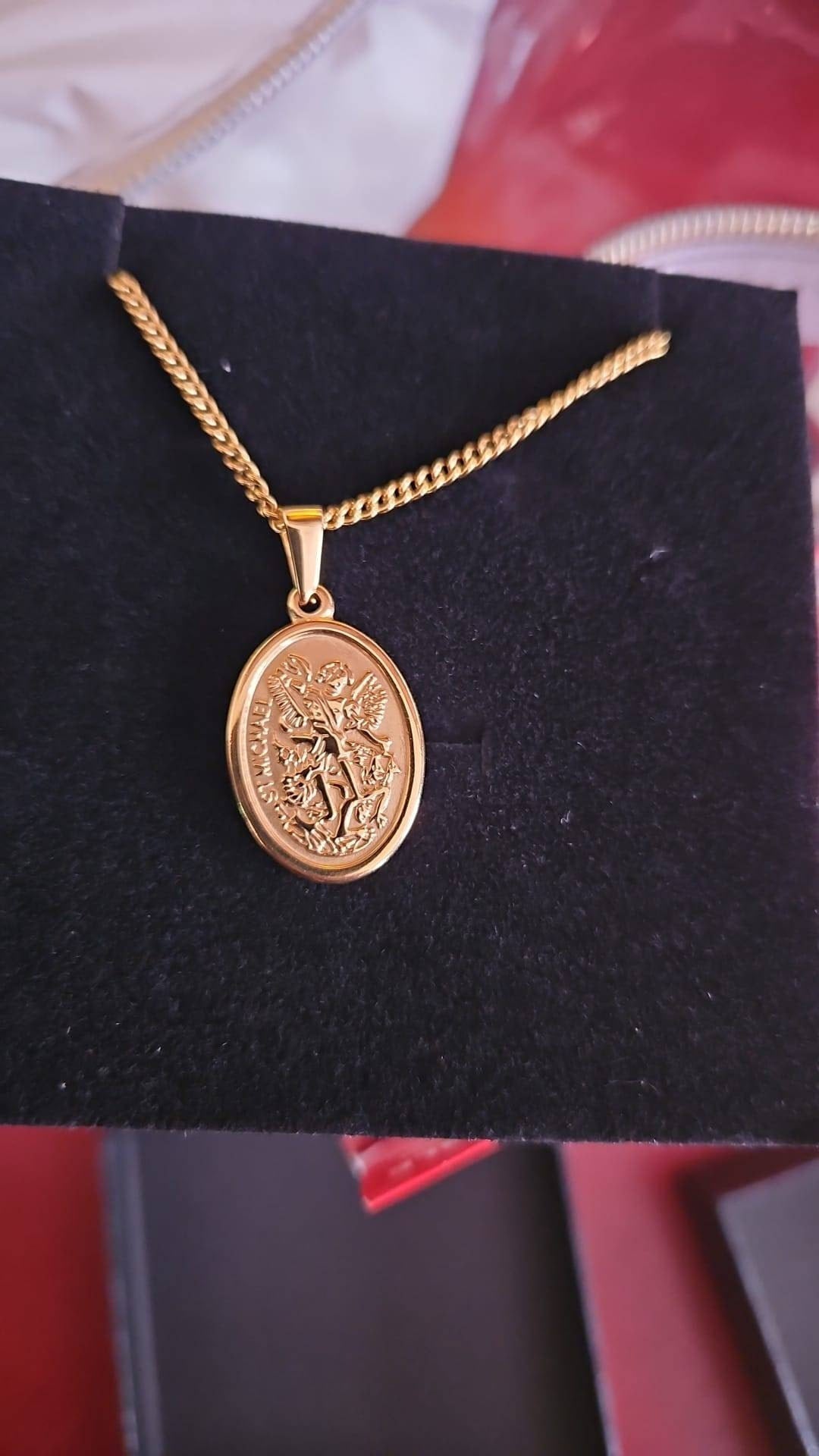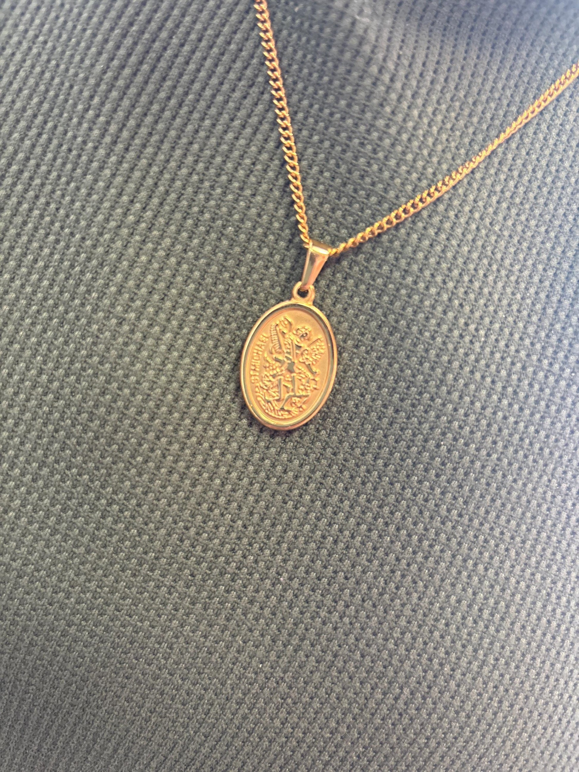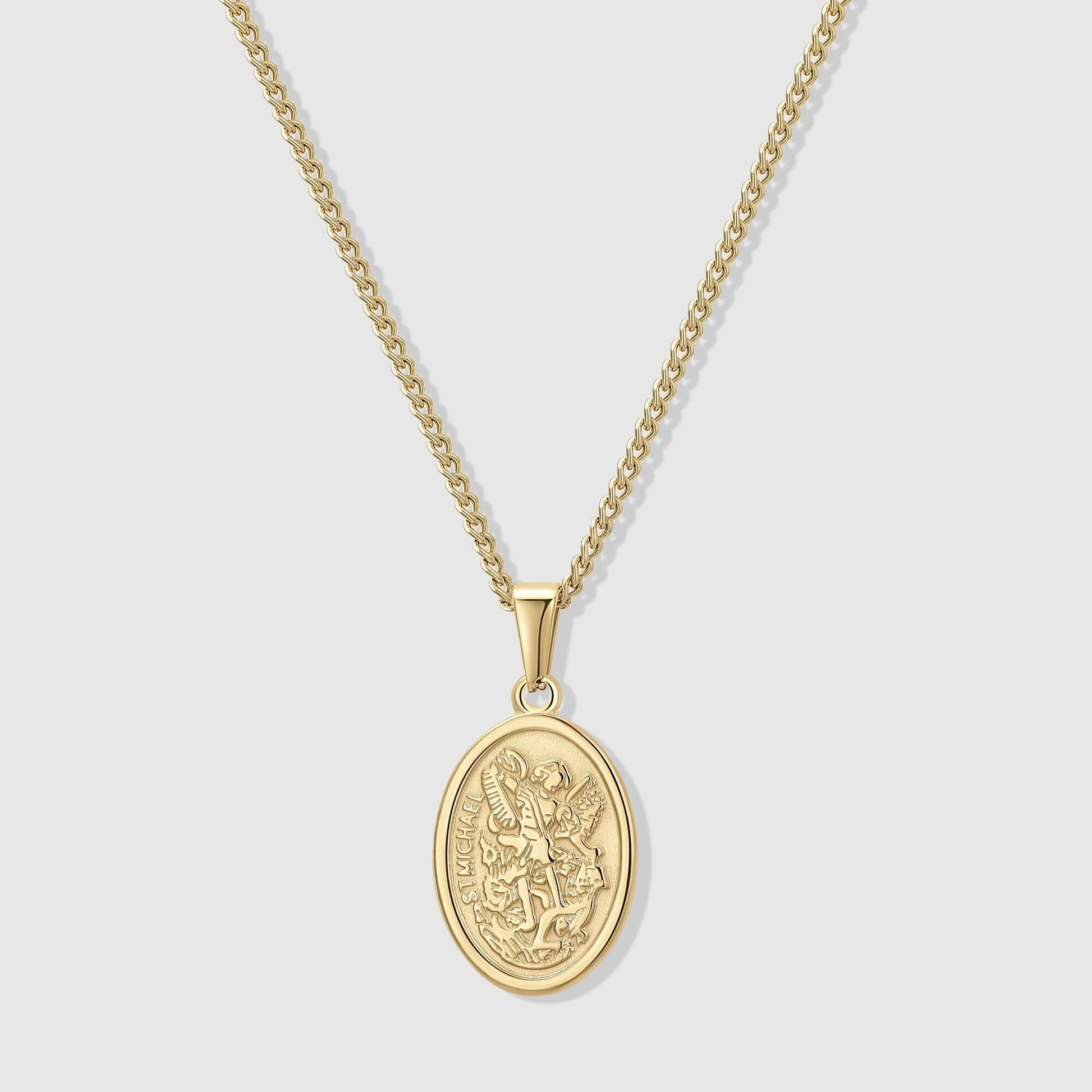 Gold St. Michael pendant, designed for men who appreciate classic style and quality craftsmanship. The pendant features an oval shape with a detailed image of St. Michael, the archangel and protector, in stunning gold. The intricate details of the image, including St. Michael's wings, sword, and shield, are accentuated by raised edges. The pendant hangs from a sturdy, matching gold chain, ensuring a comfortable and secure fit. This pendant is perfect for adding a touch of sophistication and spirituality to any outfit, whether it's for everyday wear or a special occasion. It's a symbol of faith and protection, making it a meaningful gift for yourself or someone special.