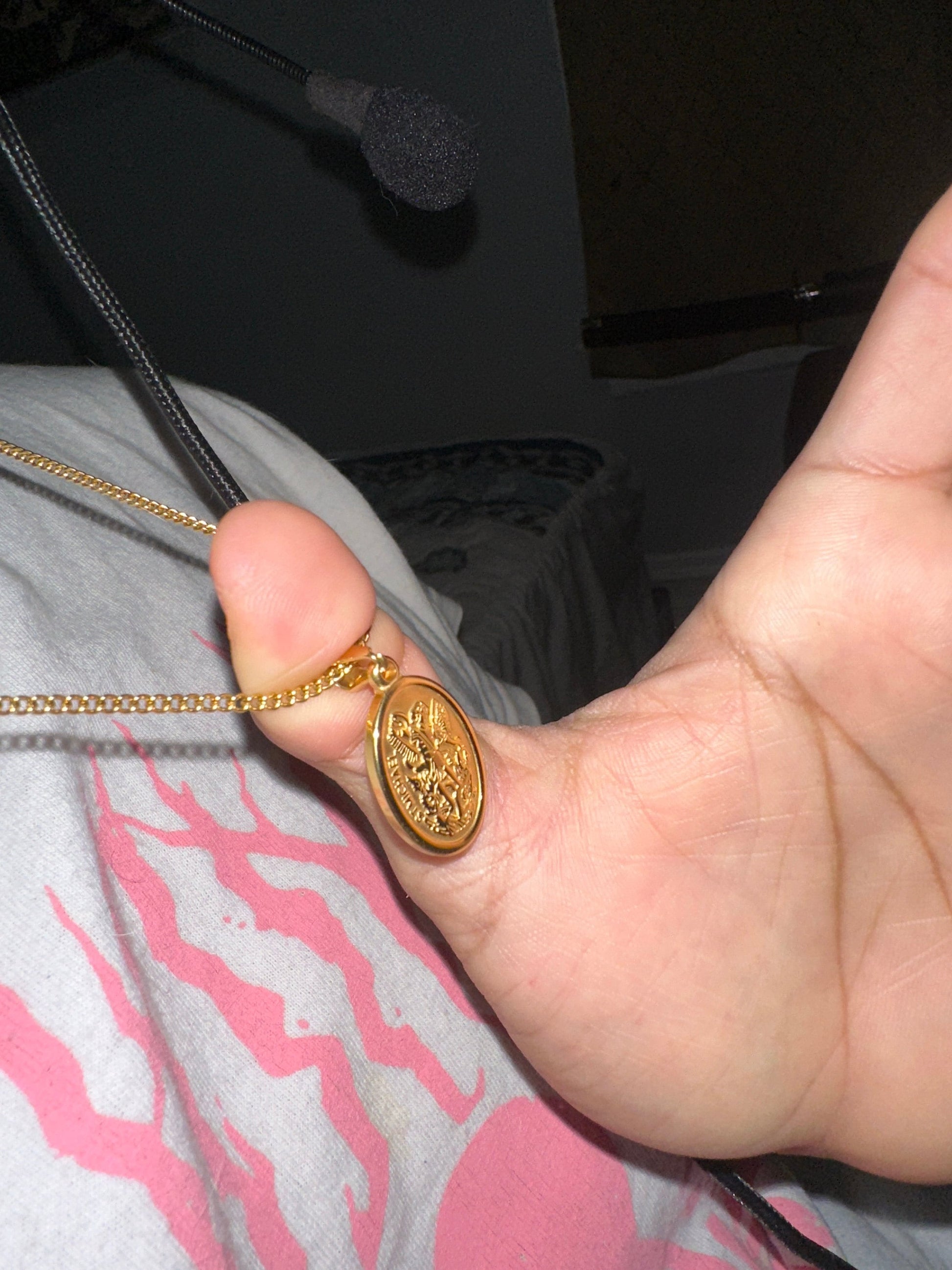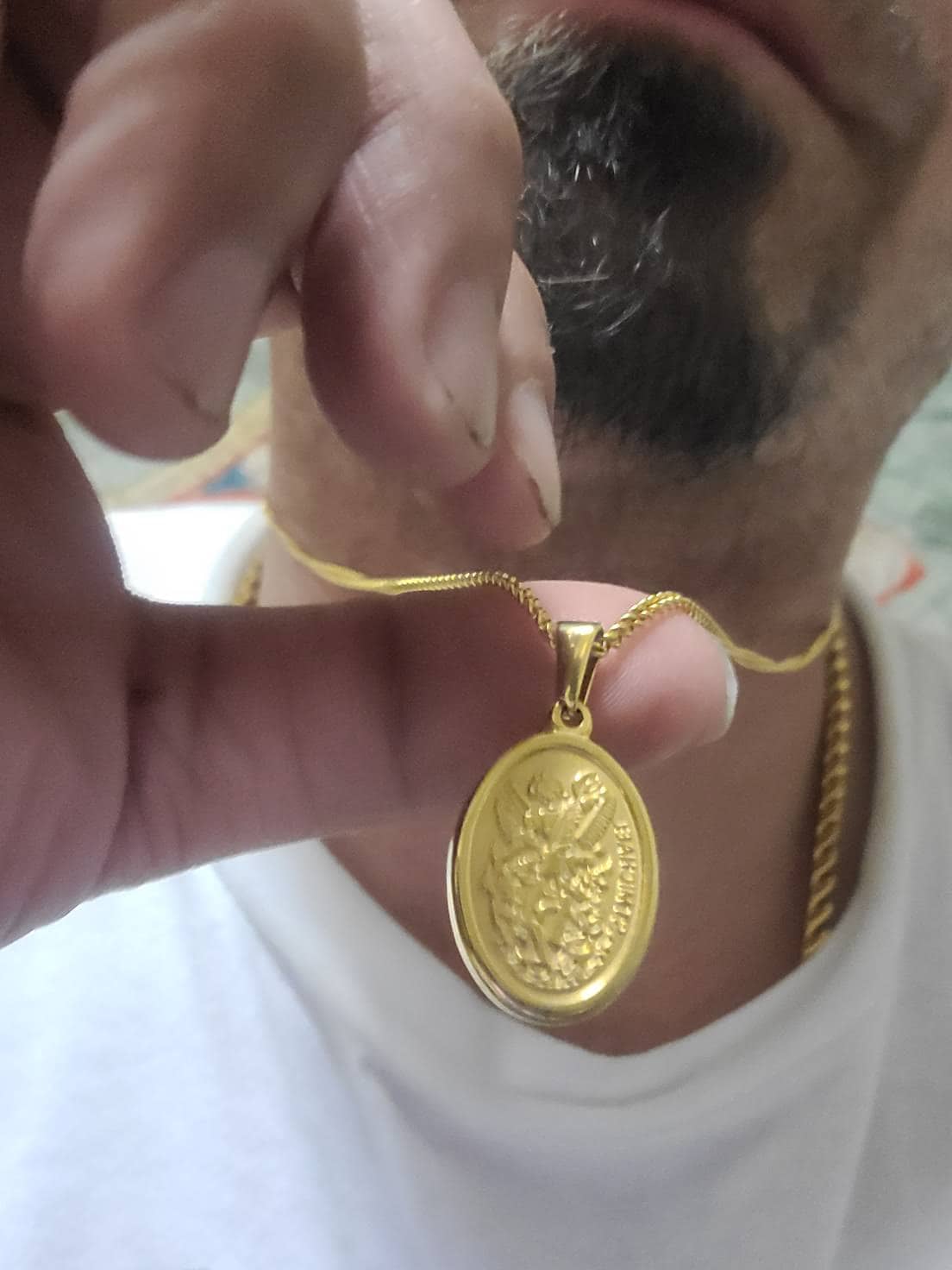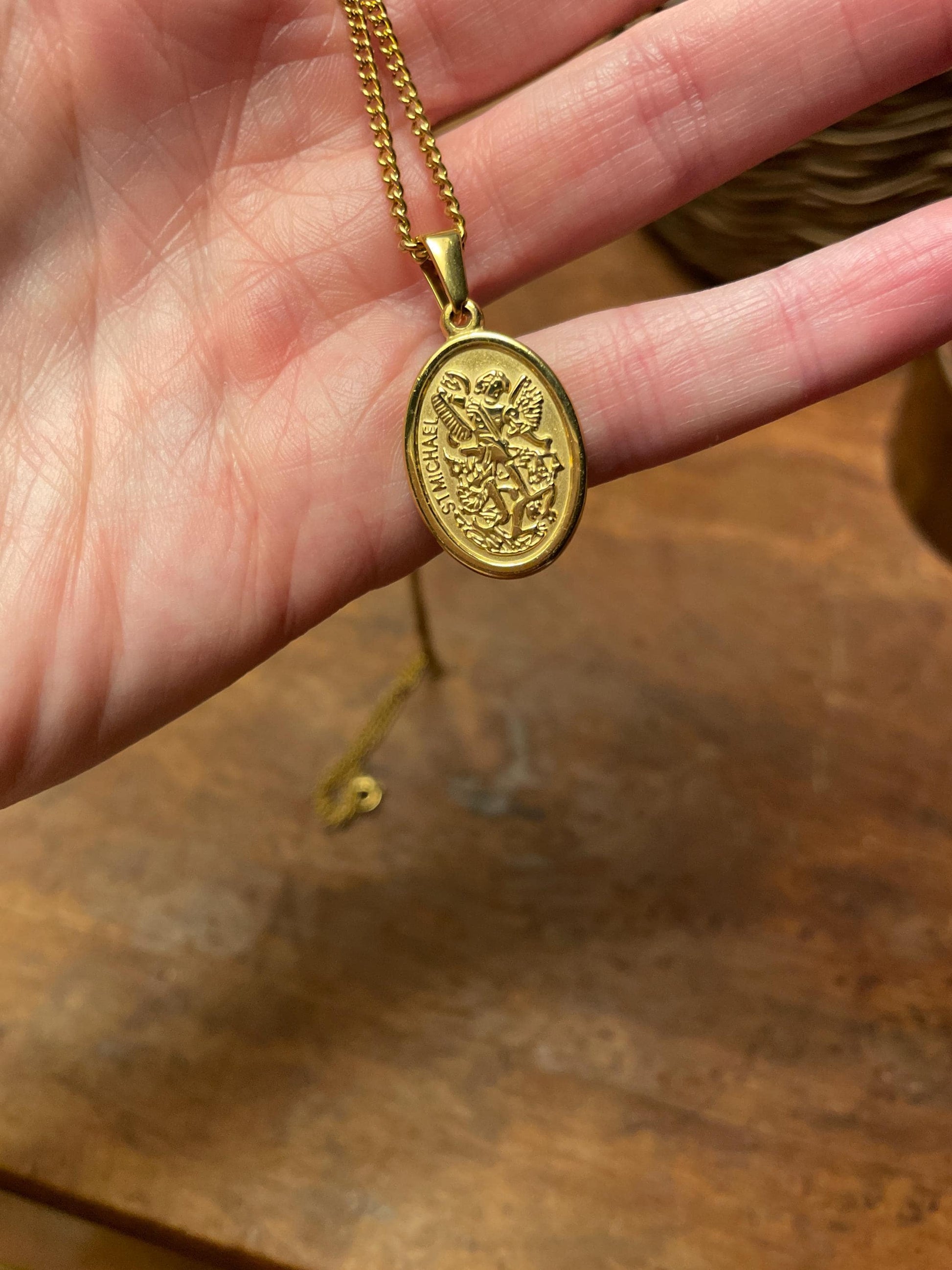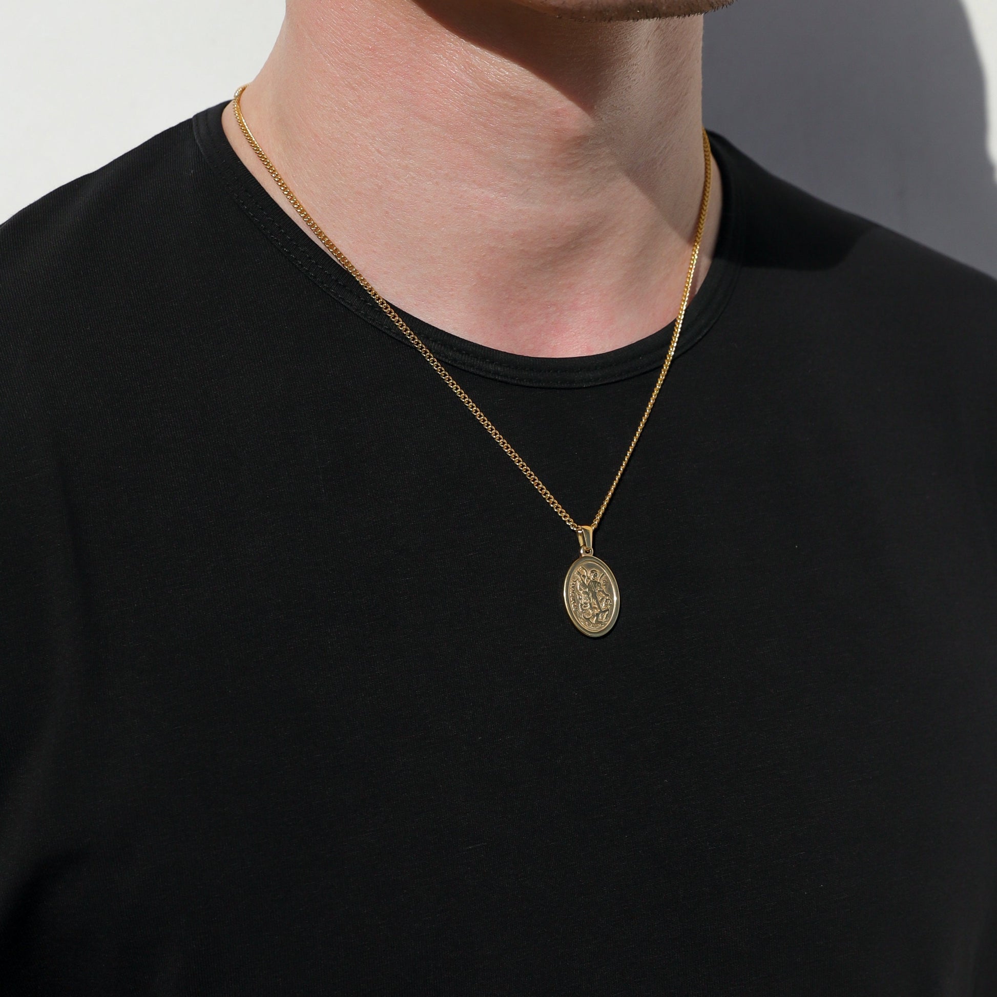 Gold St. Michael pendant, designed for men who appreciate classic style and quality craftsmanship. The pendant features an oval shape with a detailed image of St. Michael, the archangel and protector, in stunning gold. The intricate details of the image, including St. Michael's wings, sword, and shield, are accentuated by raised edges. The pendant hangs from a sturdy, matching gold chain, ensuring a comfortable and secure fit. This pendant is perfect for adding a touch of sophistication and spirituality to any outfit, whether it's for everyday wear or a special occasion. It's a symbol of faith and protection, making it a meaningful gift for yourself or someone special.