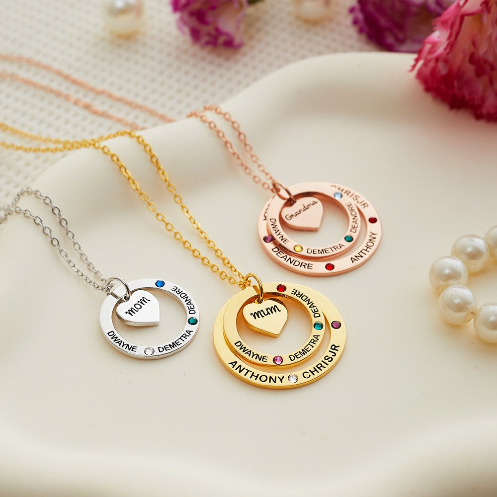 Birthstone Necklace with Heart & Ring Pendant, Necklace with Custom 1-7 Birthstones & Names, Jewelry for Grandma/Mother