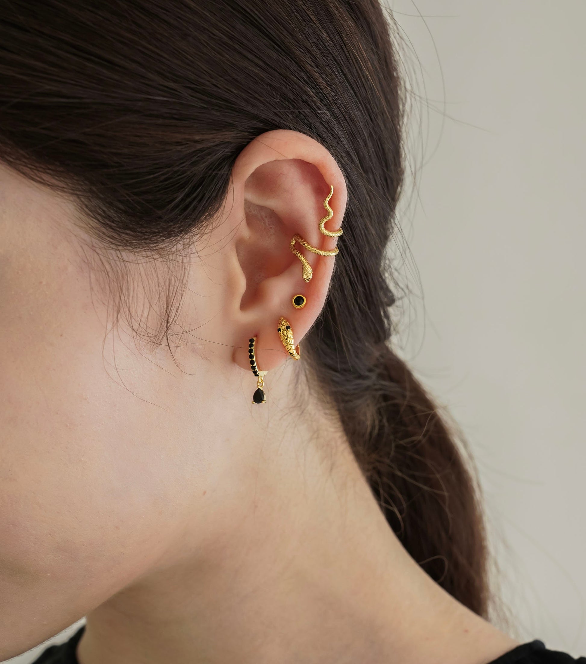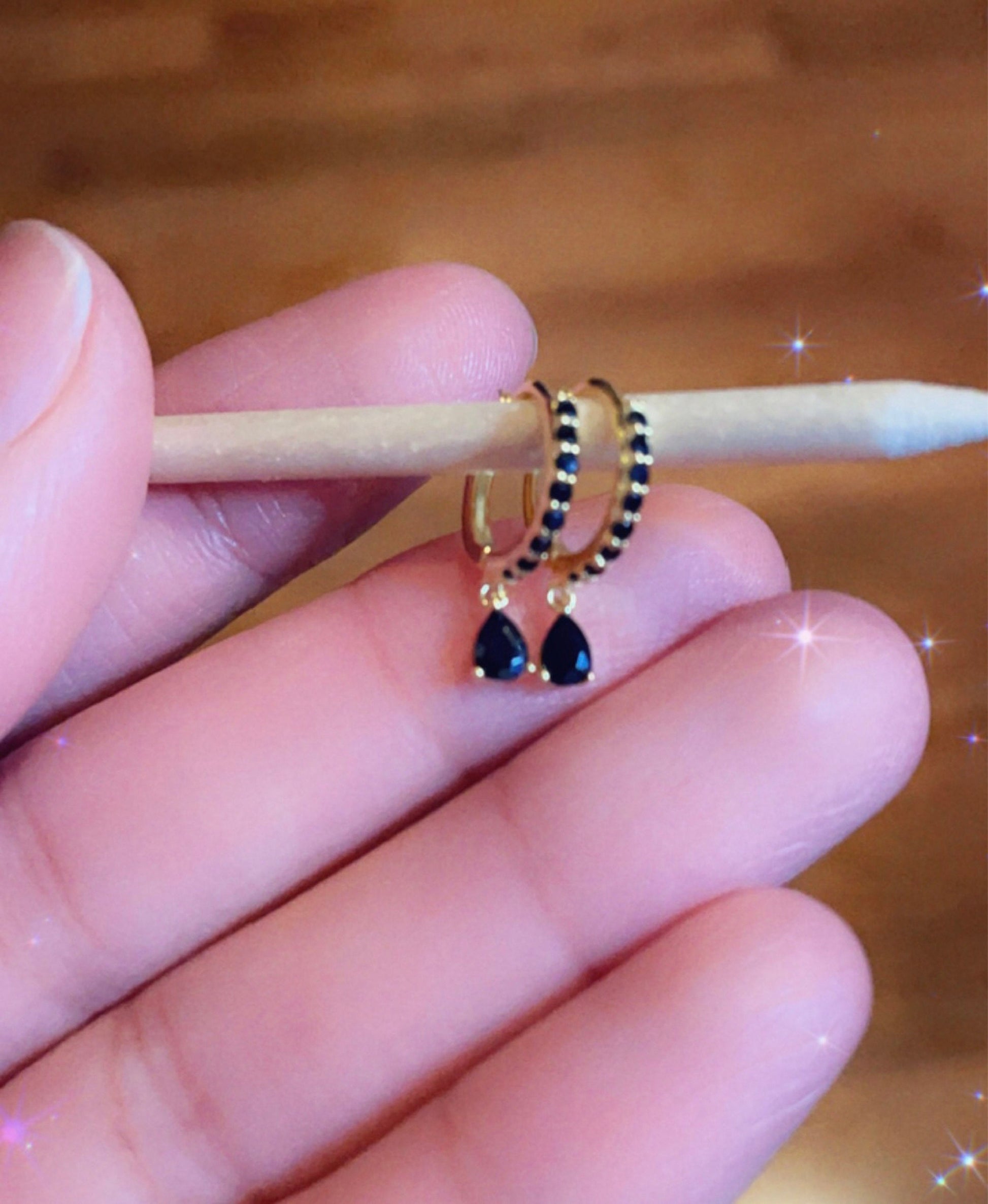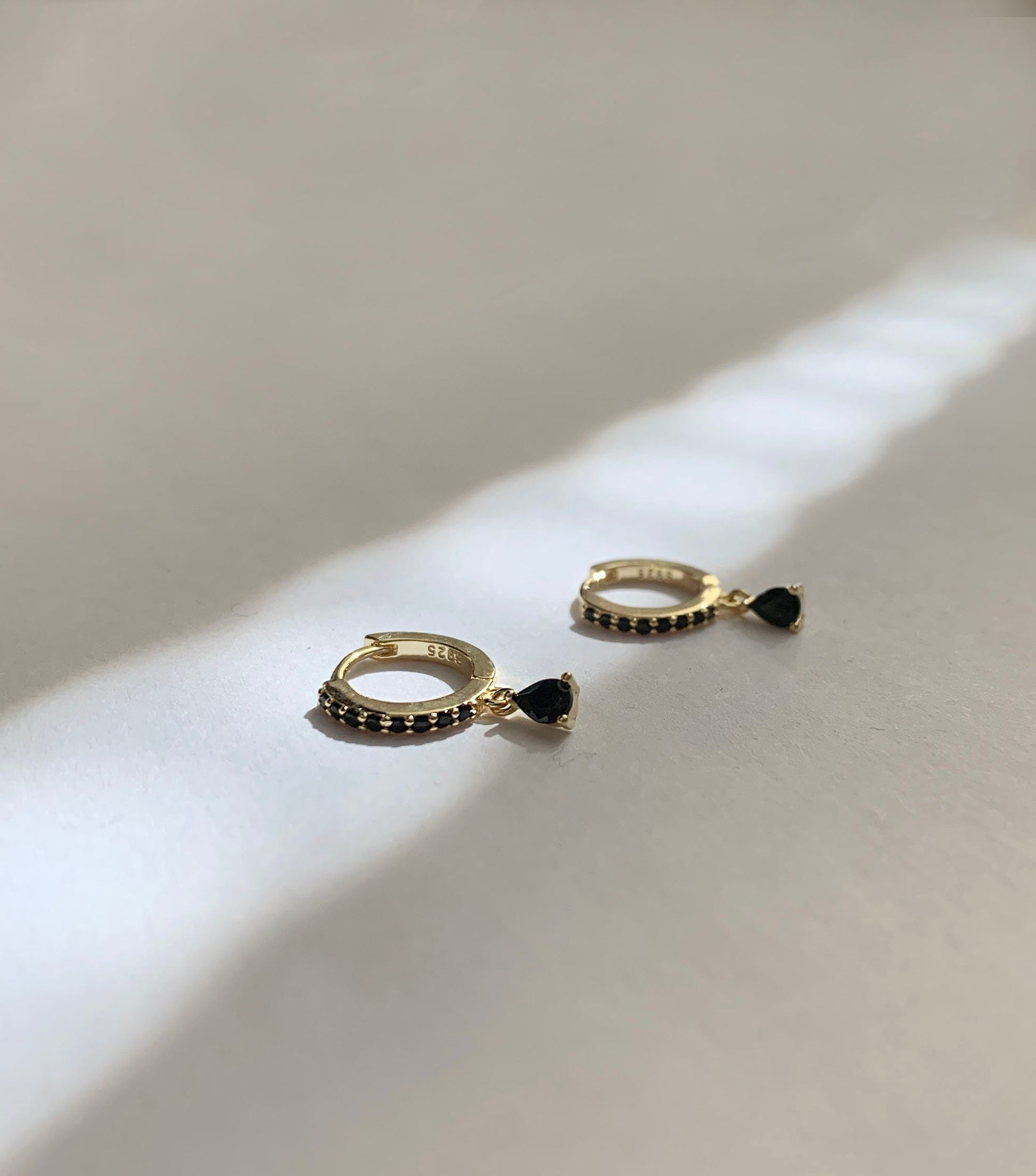 Black cz charm hoops - Dangle hoop earrings - Sterling Silver Minimalist earrings - Tiny Huggie hoop earring
