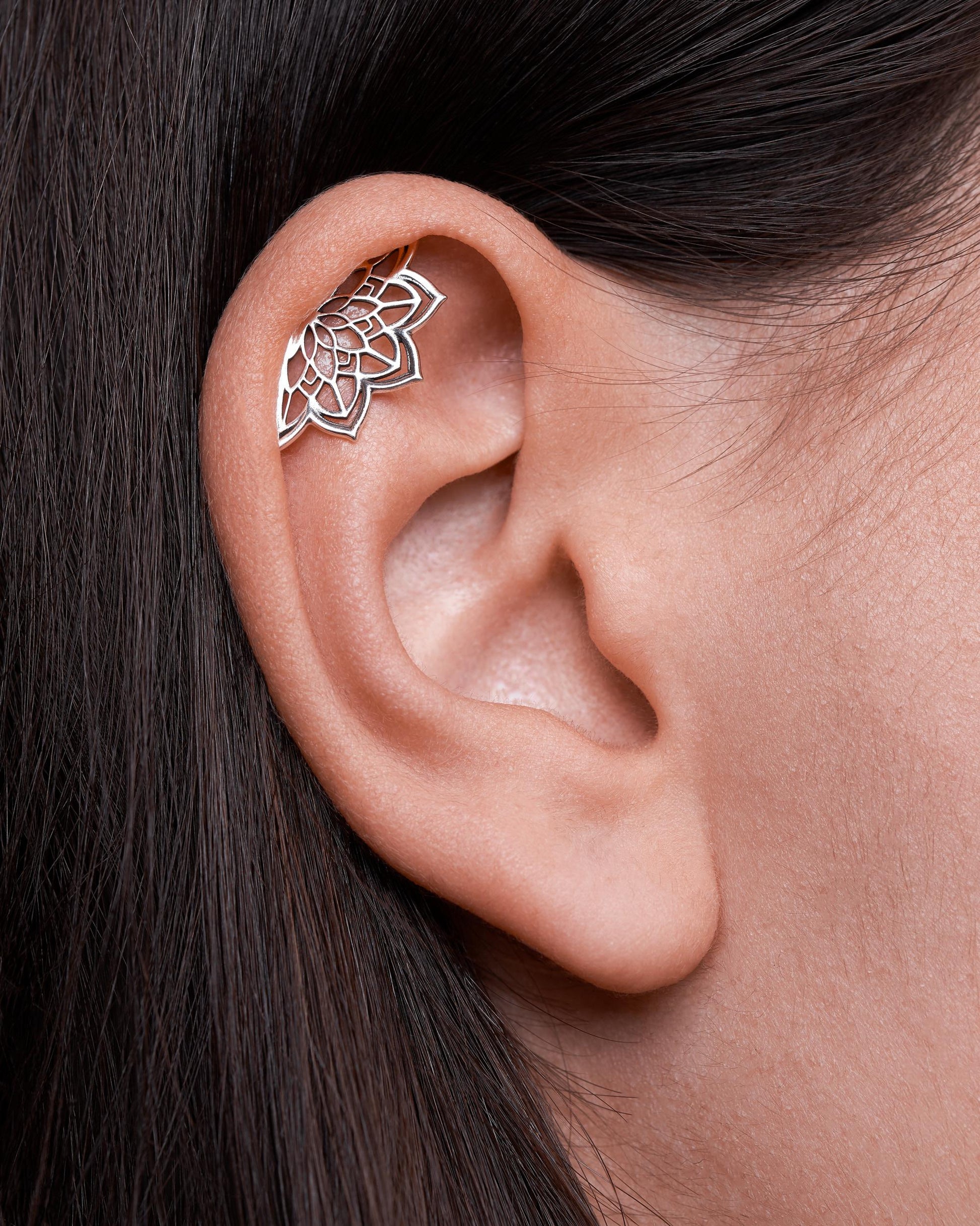 Boho Helix Earring • Geometric Mandala Lotus Flower Hidden Helix • Piercing 18G 16G • Cartilage Bohemian Silver Spiritual Jewelry • CRT023