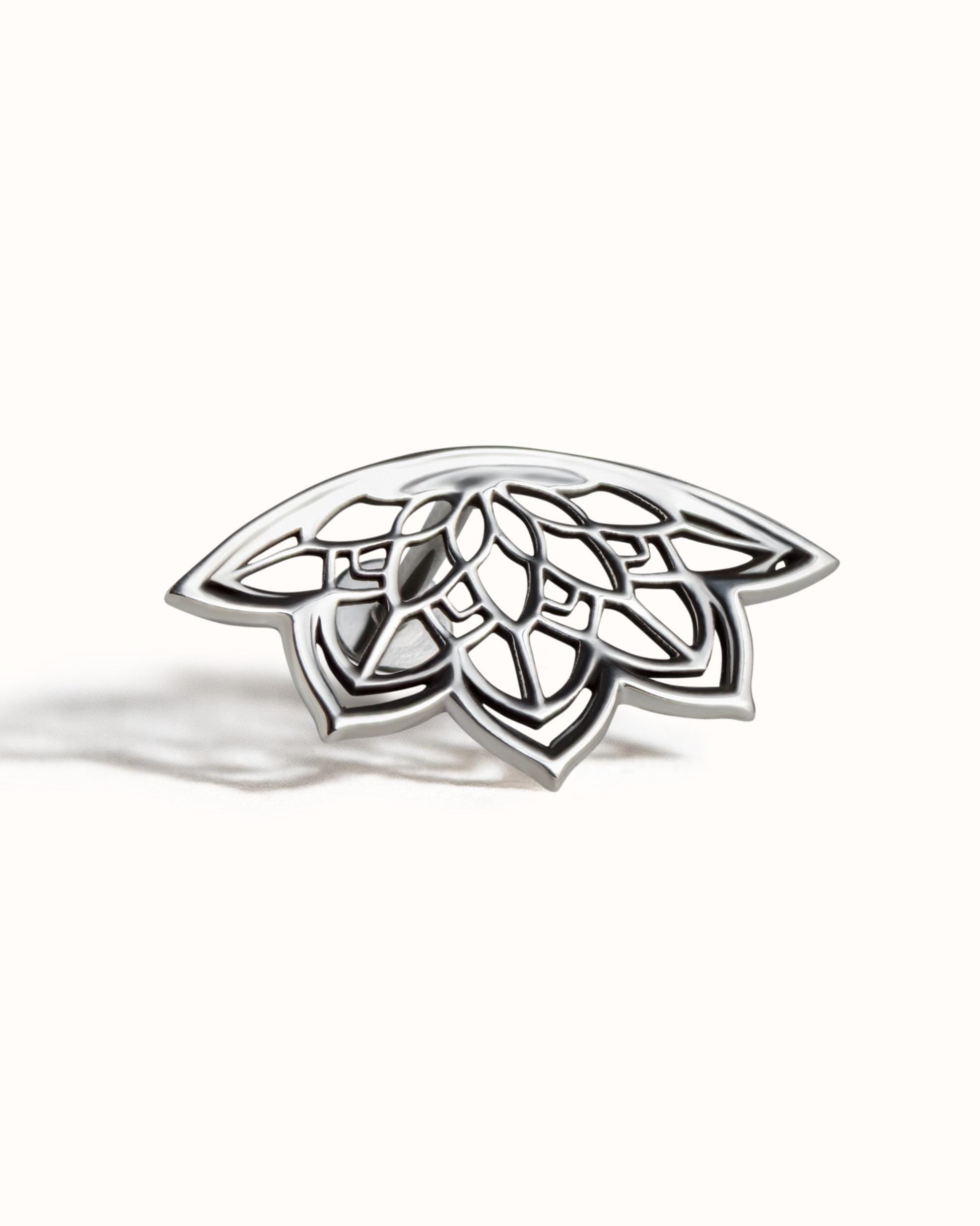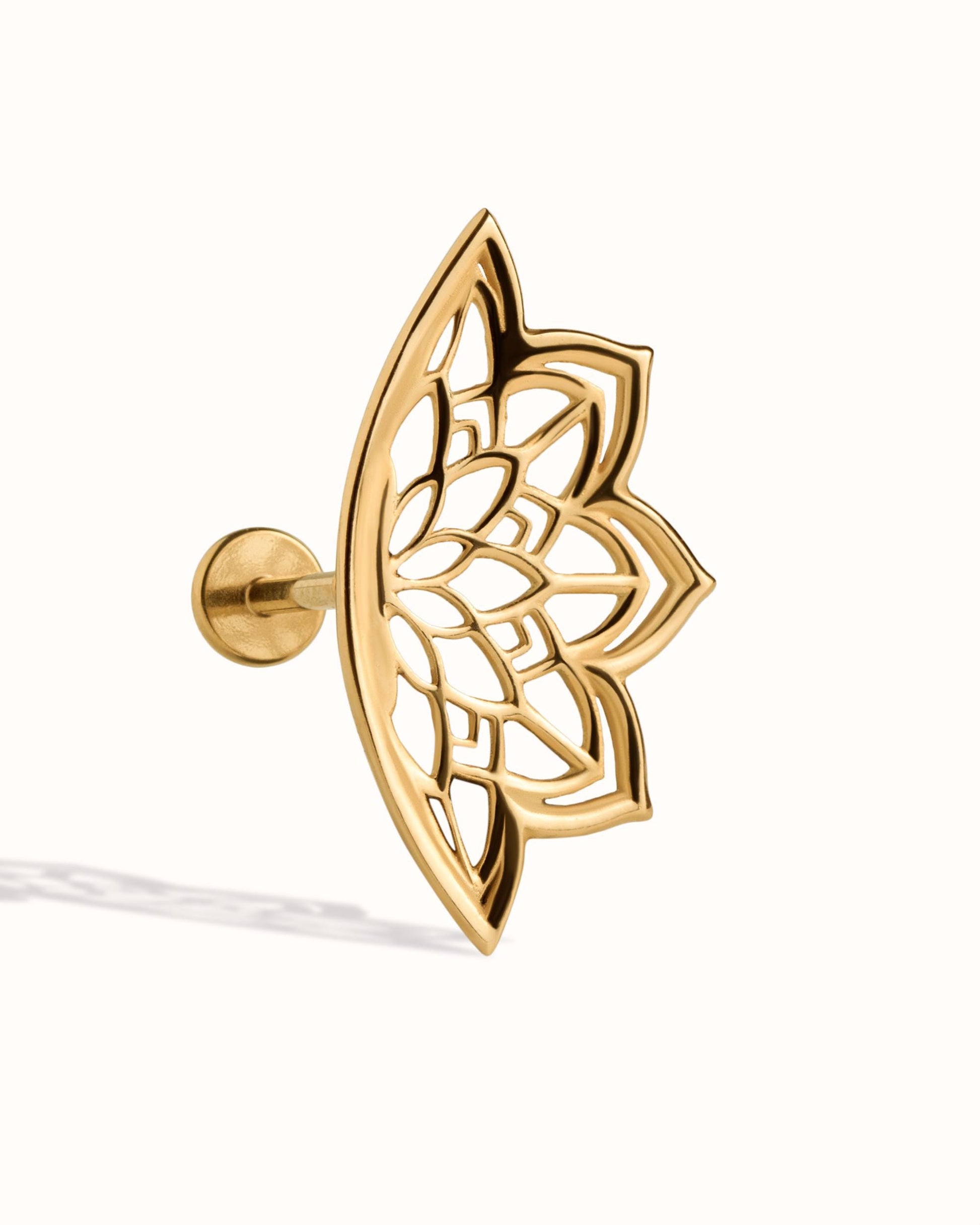 Lotus Flower Hidden Helix Earring. This design is made of solid 925 Sterling Silver and 316L Surgical Steel. It is finished with an oxidized look and 24K gold plating. Sold by the piece.