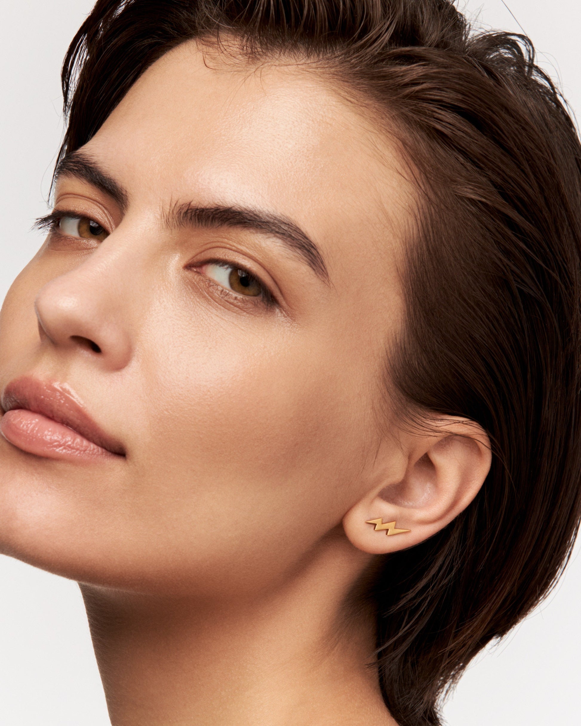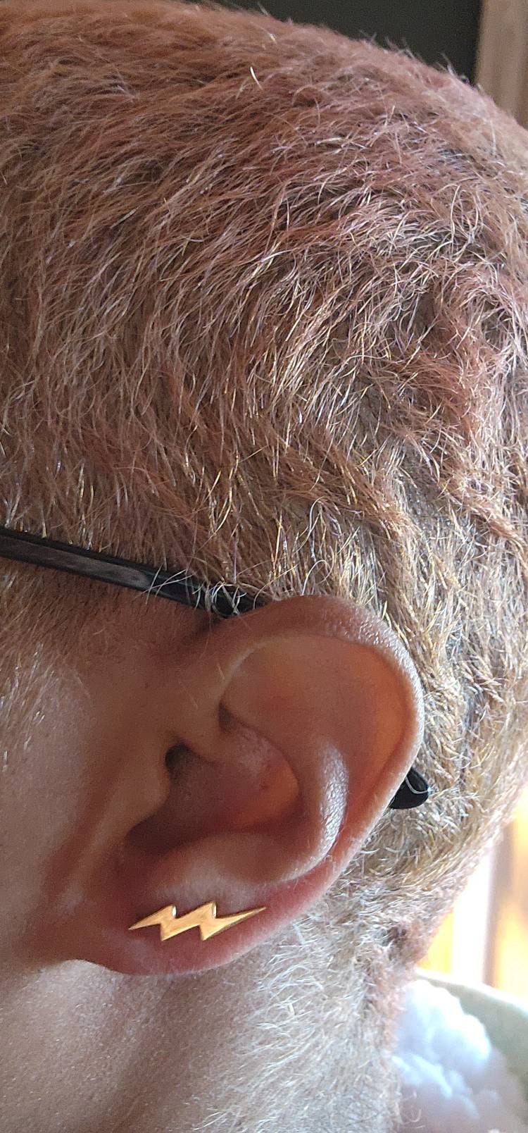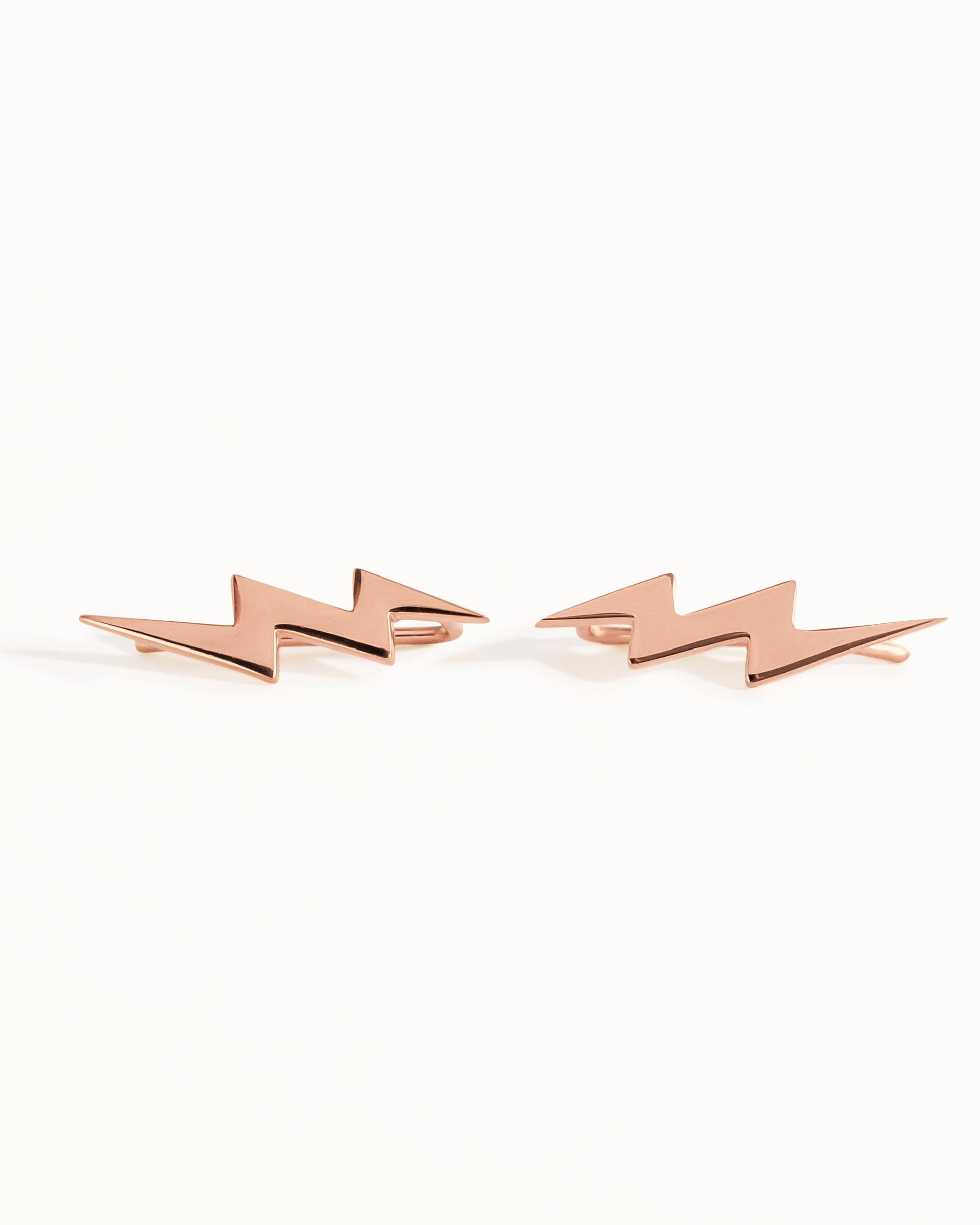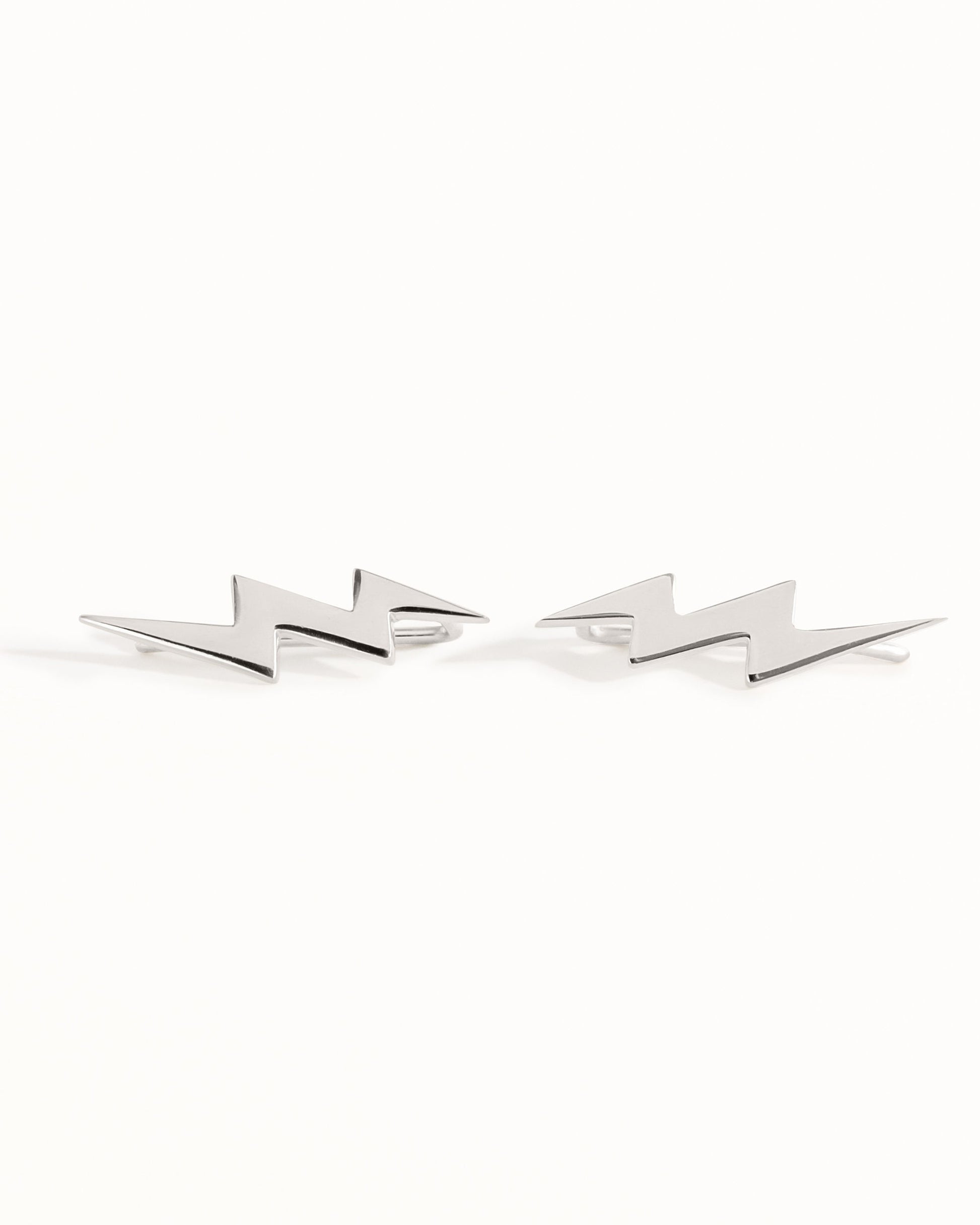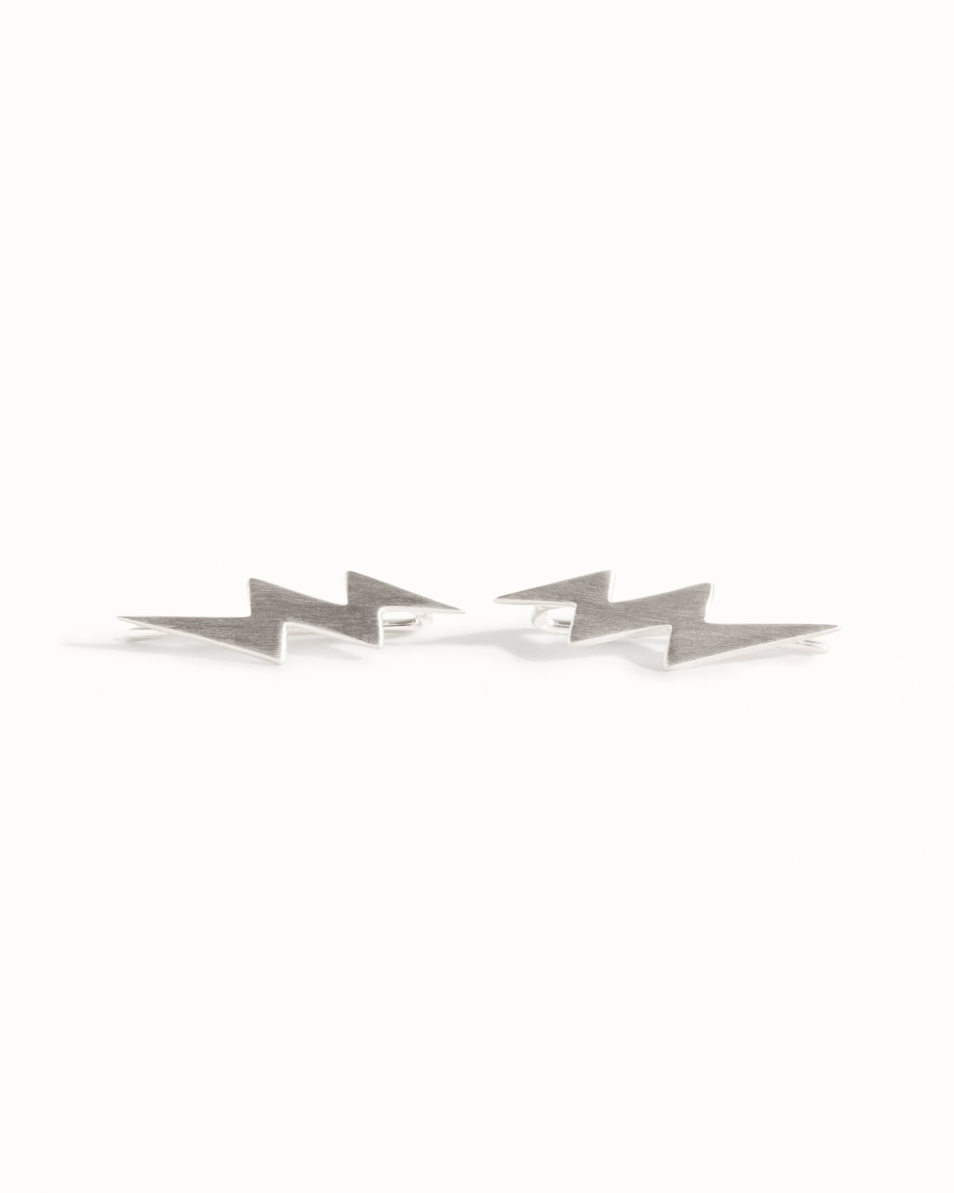 Lightning Bolt Ear Climber cast in solid Sterling Silver. The Earring measures 3/4" (20mm) long. This design is available in four styles: Shiny Sterling Silver, Matte Sterling Silver, Yellow Gold plated and, Rose Gold plated