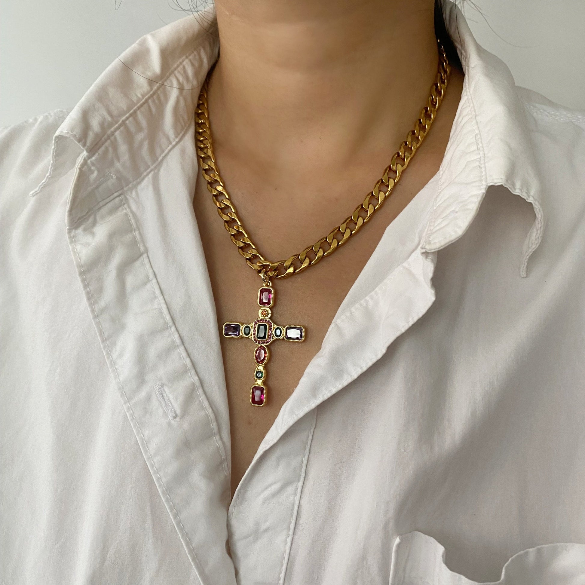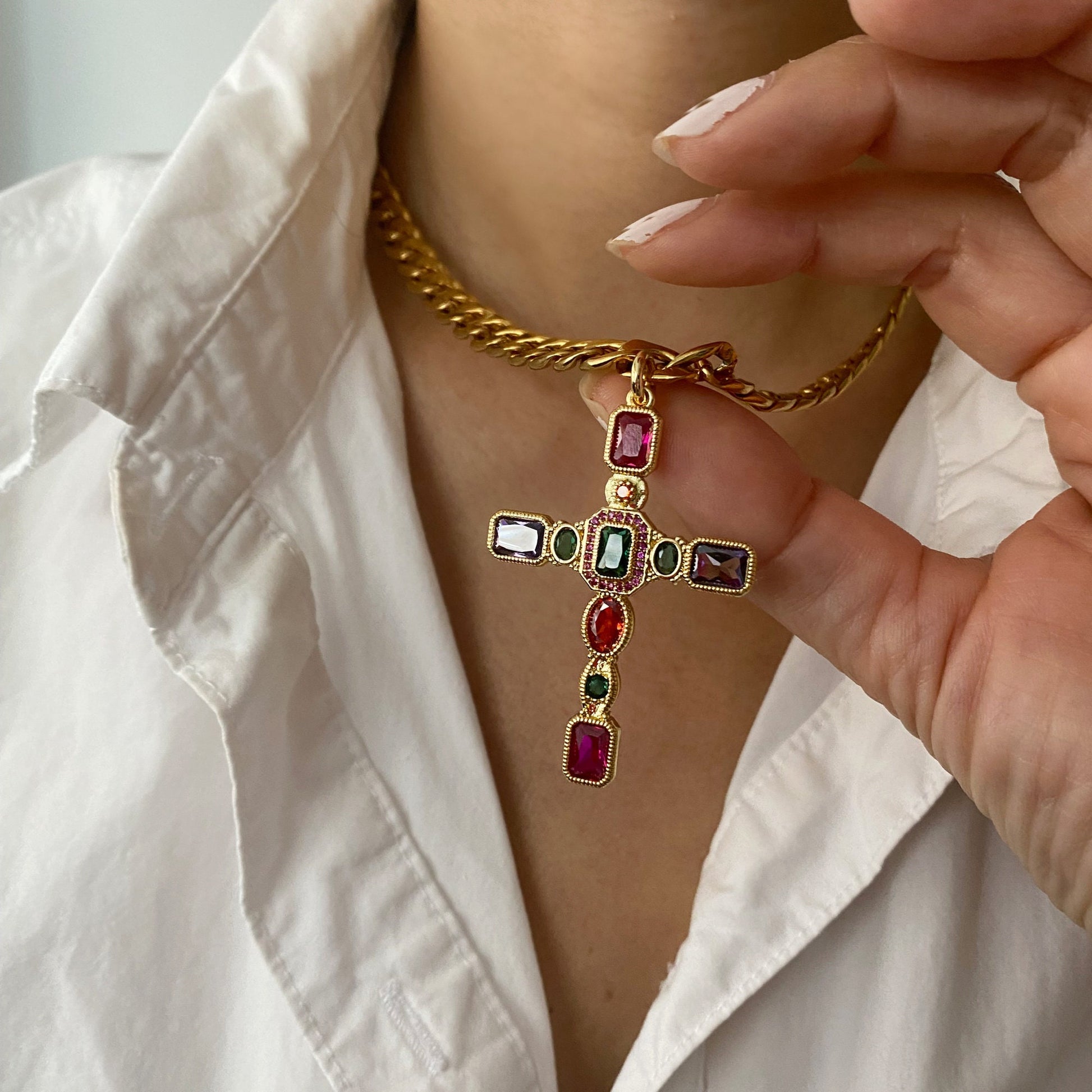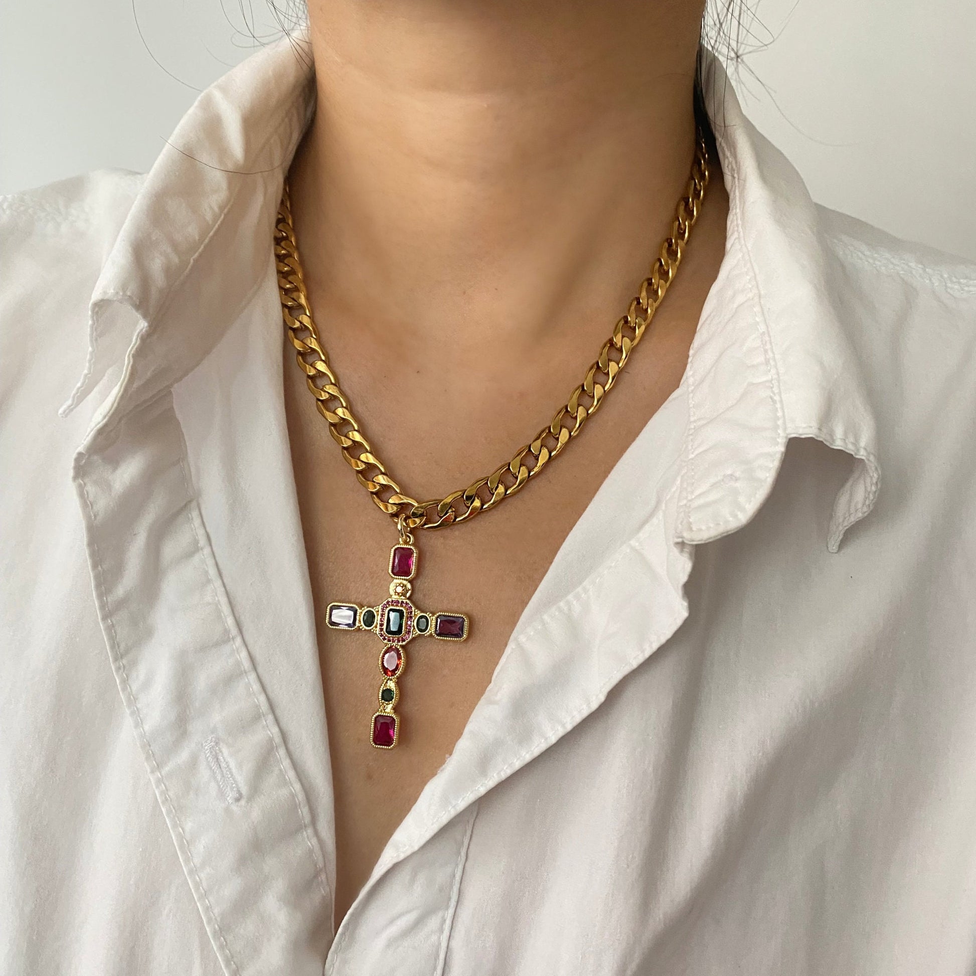 Colorful Gem Cross Necklace | Large Oversized Cross Necklace | Chunky Gold Chain Layering Necklace | Statement Choker