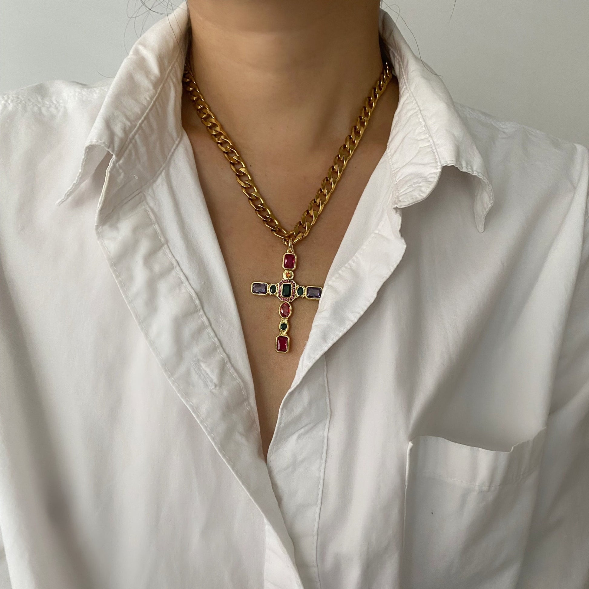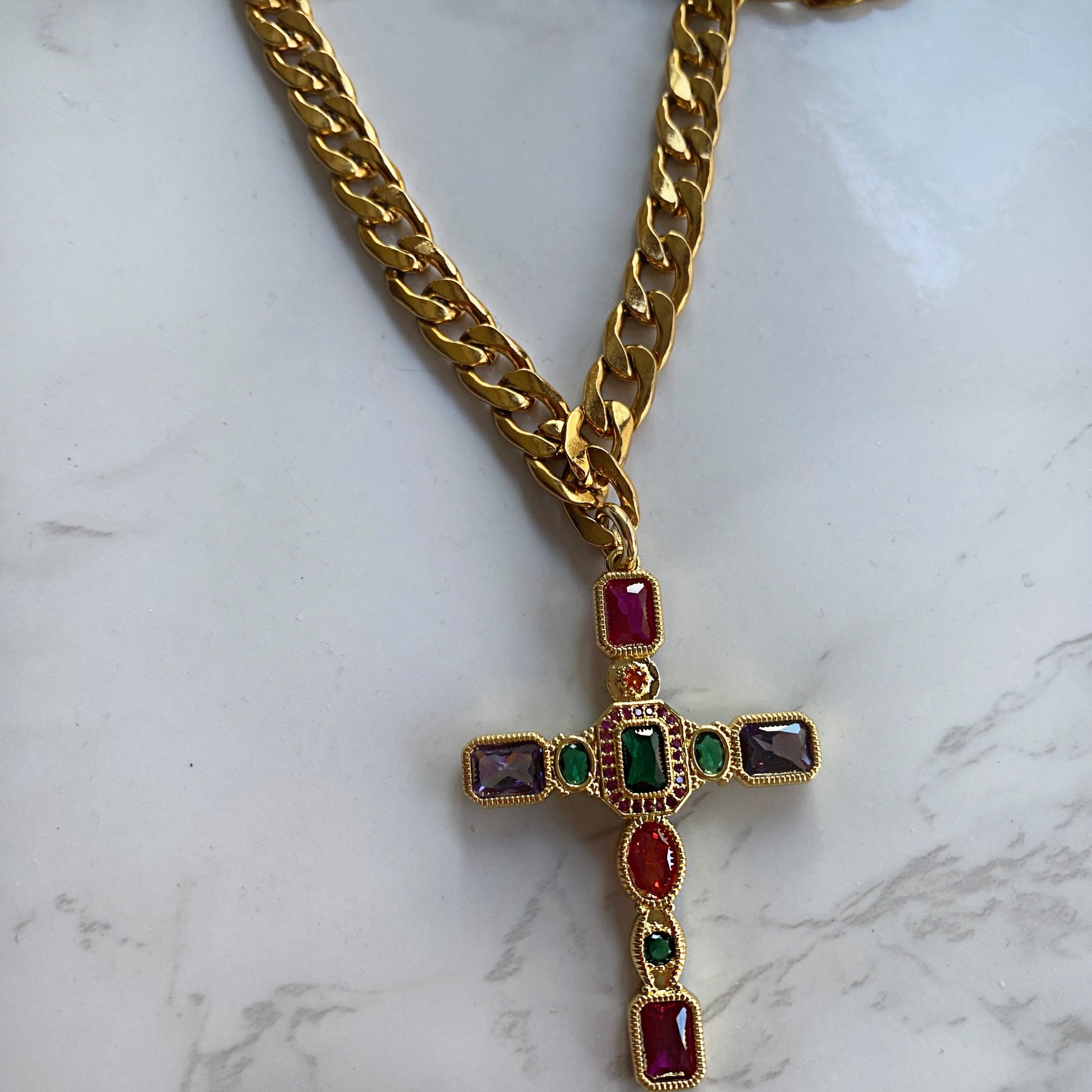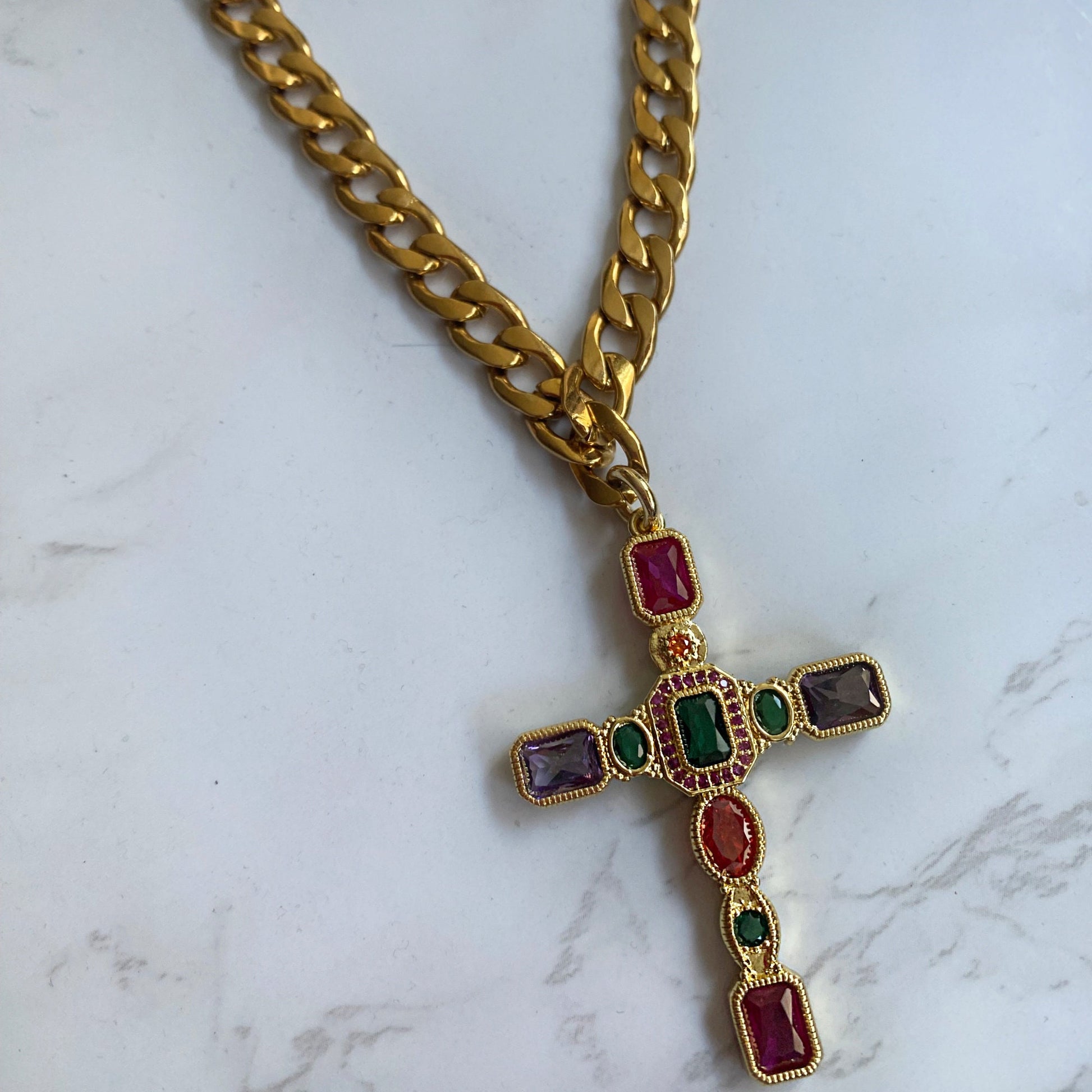 Colorful Gem Cross Necklace | Large Oversized Cross Necklace | Chunky Gold Chain Layering Necklace | Statement Choker