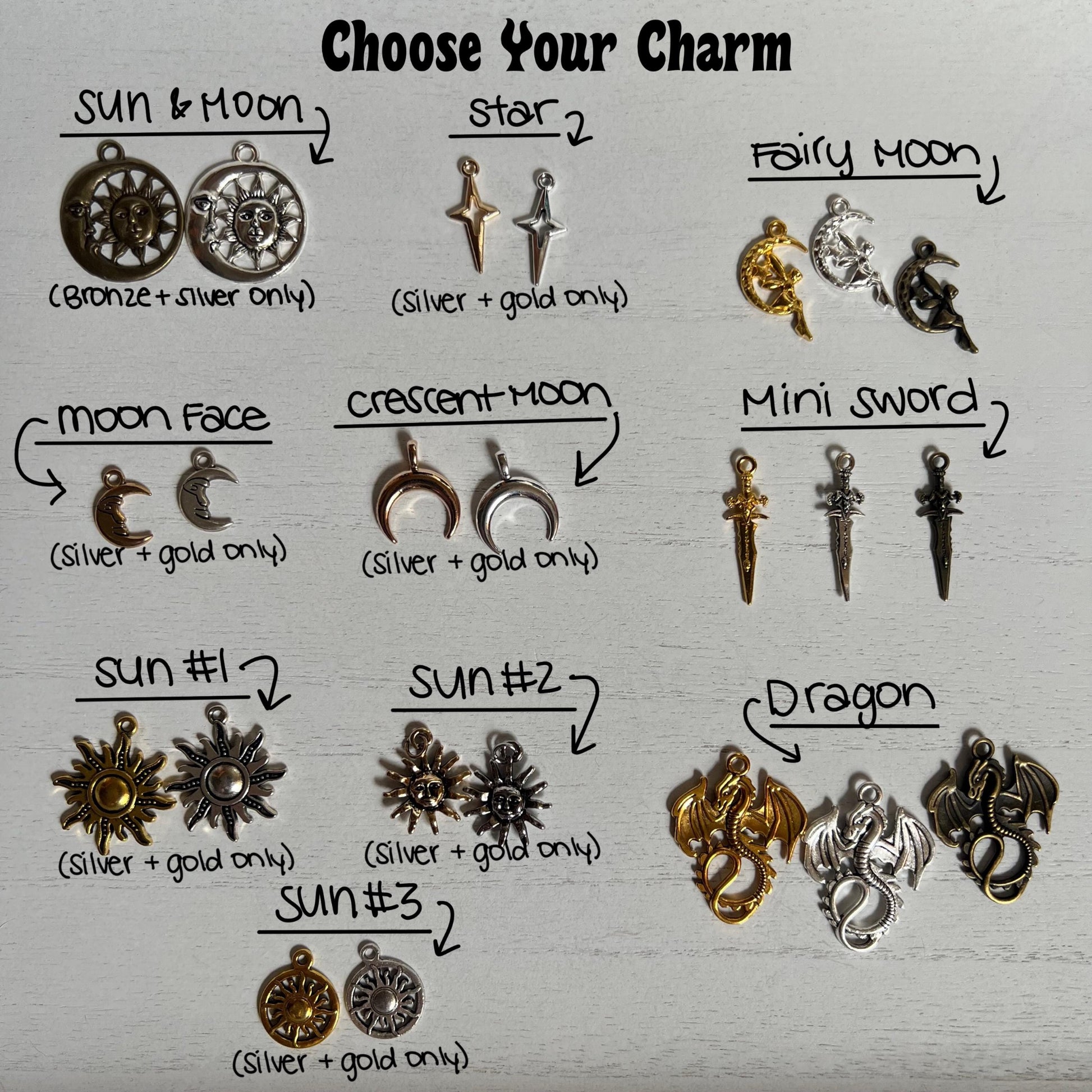 You may choose the color of the bookmark as well as the charm and type of crystal.