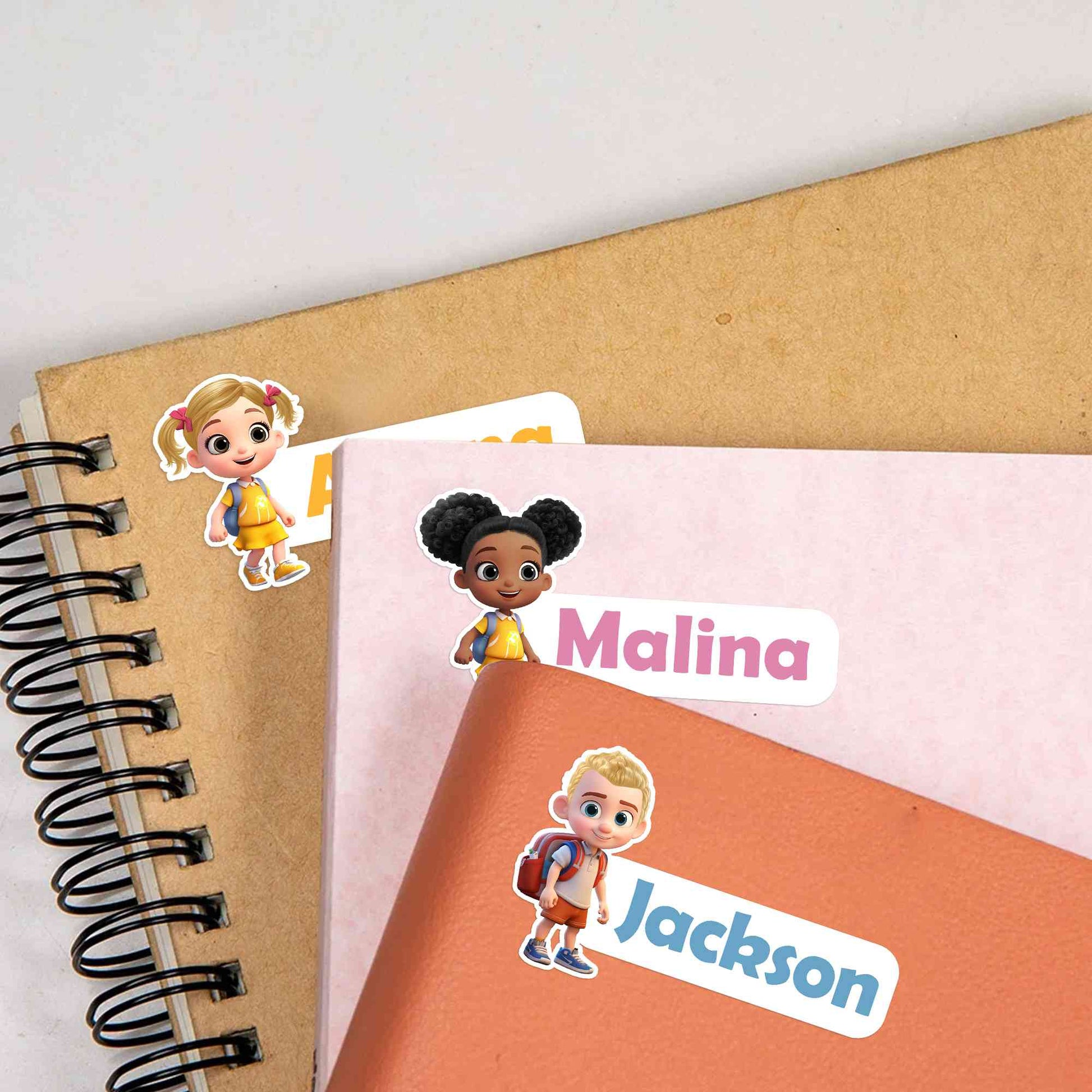 Custom Cartoon Character School Name Labels Set of 12, Cute Stickers for Notebooks, Water Bottles & Backpacks, Back to School/Birthday Gift for Kids
