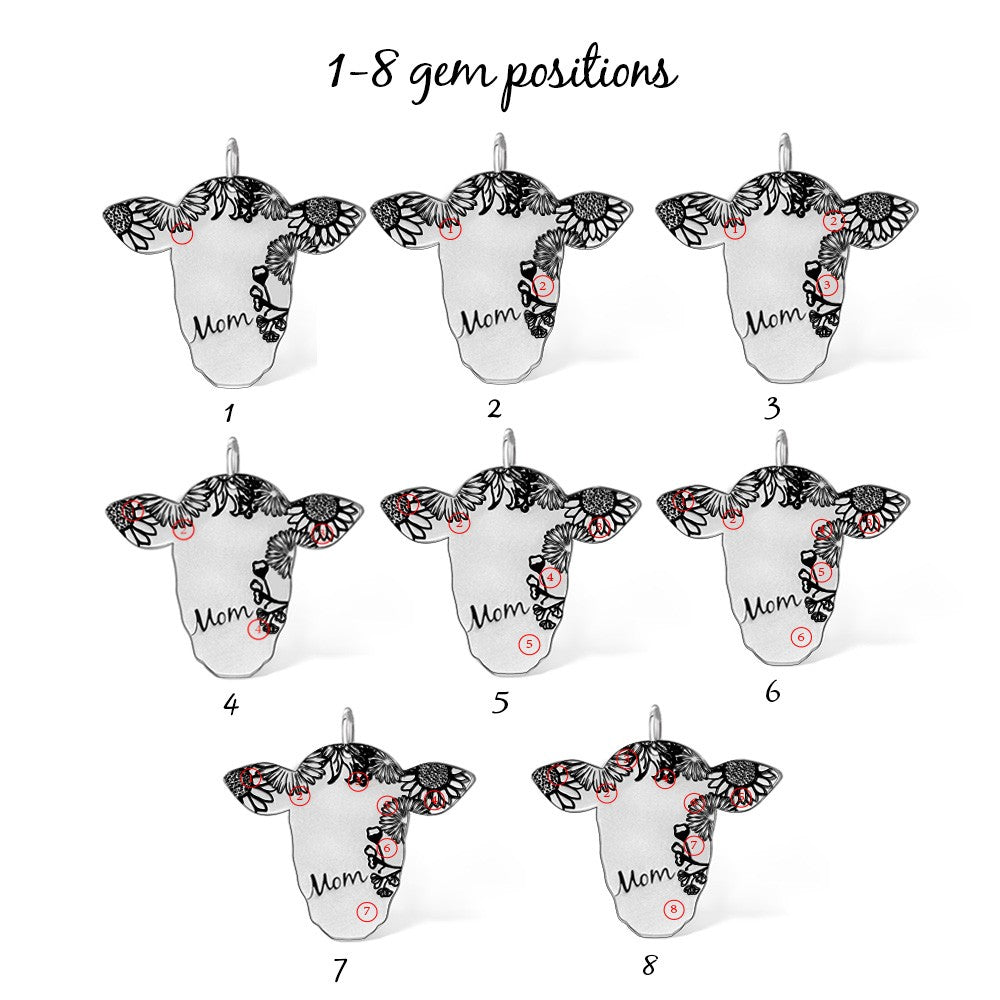 Custom Name and Birthstone Cow Necklace - Aluminum cow head handstamped with daisy, sunflower and leaf stamps. Embedded with 3 crystals.