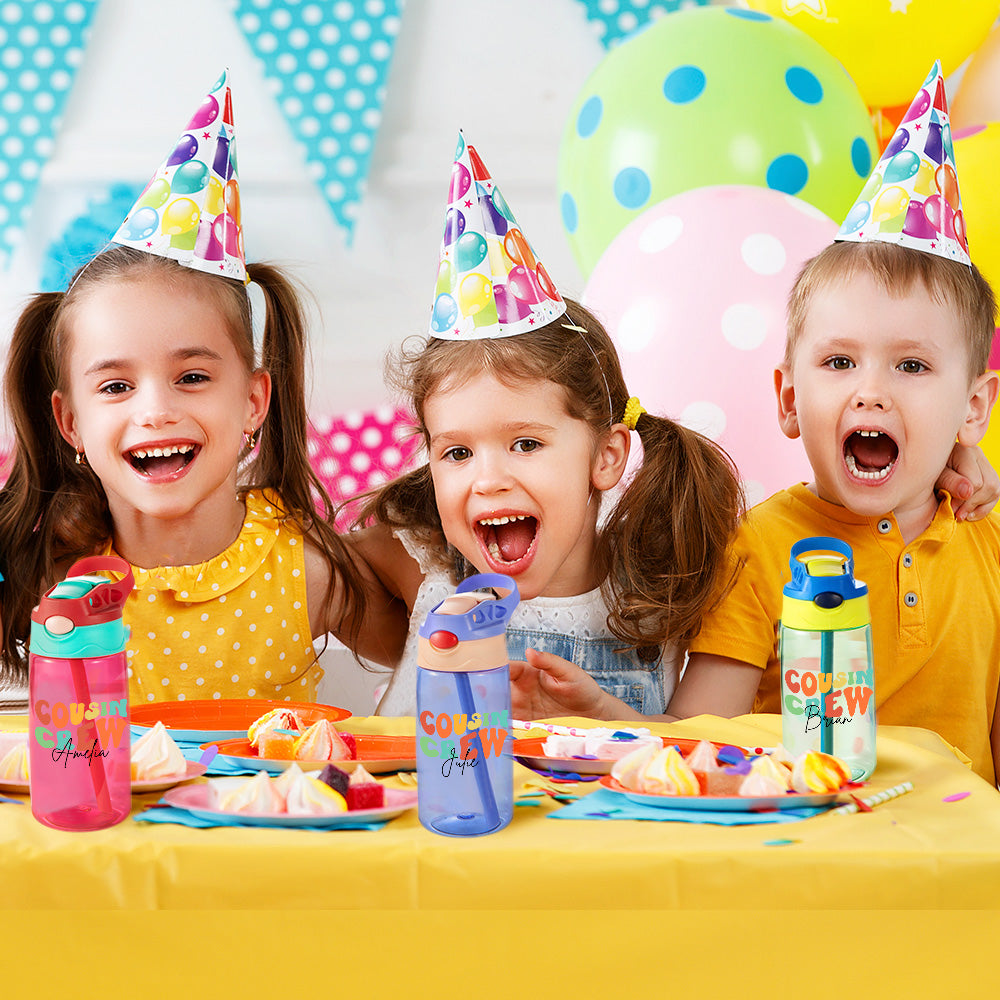 Custom Name Cousin Crew Kids Water Bottle - Made from durable, safe plastic, this bottle features a leak-proof spout and comfortable handle for easy child use.