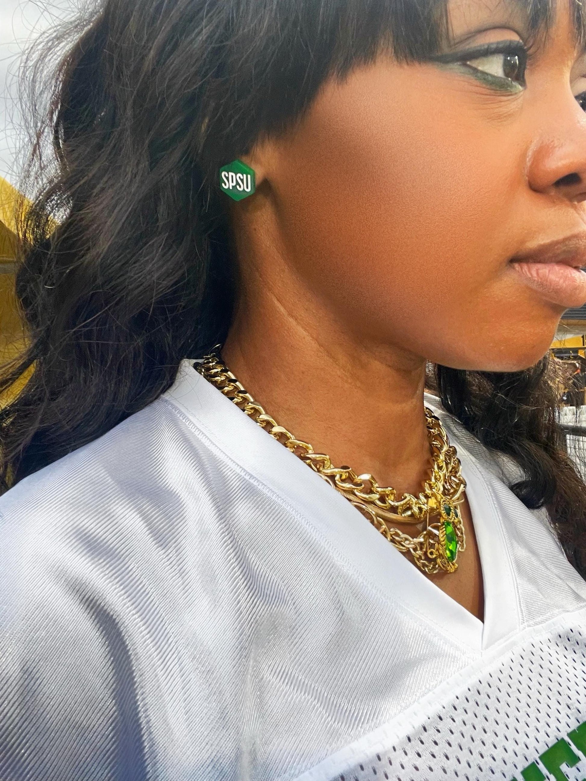 Custom logo earrings for business or fun. Perfect for the family athlete/band/activity fan. Dangle earrings are cut and engraved to order with hand-painted acrylic.