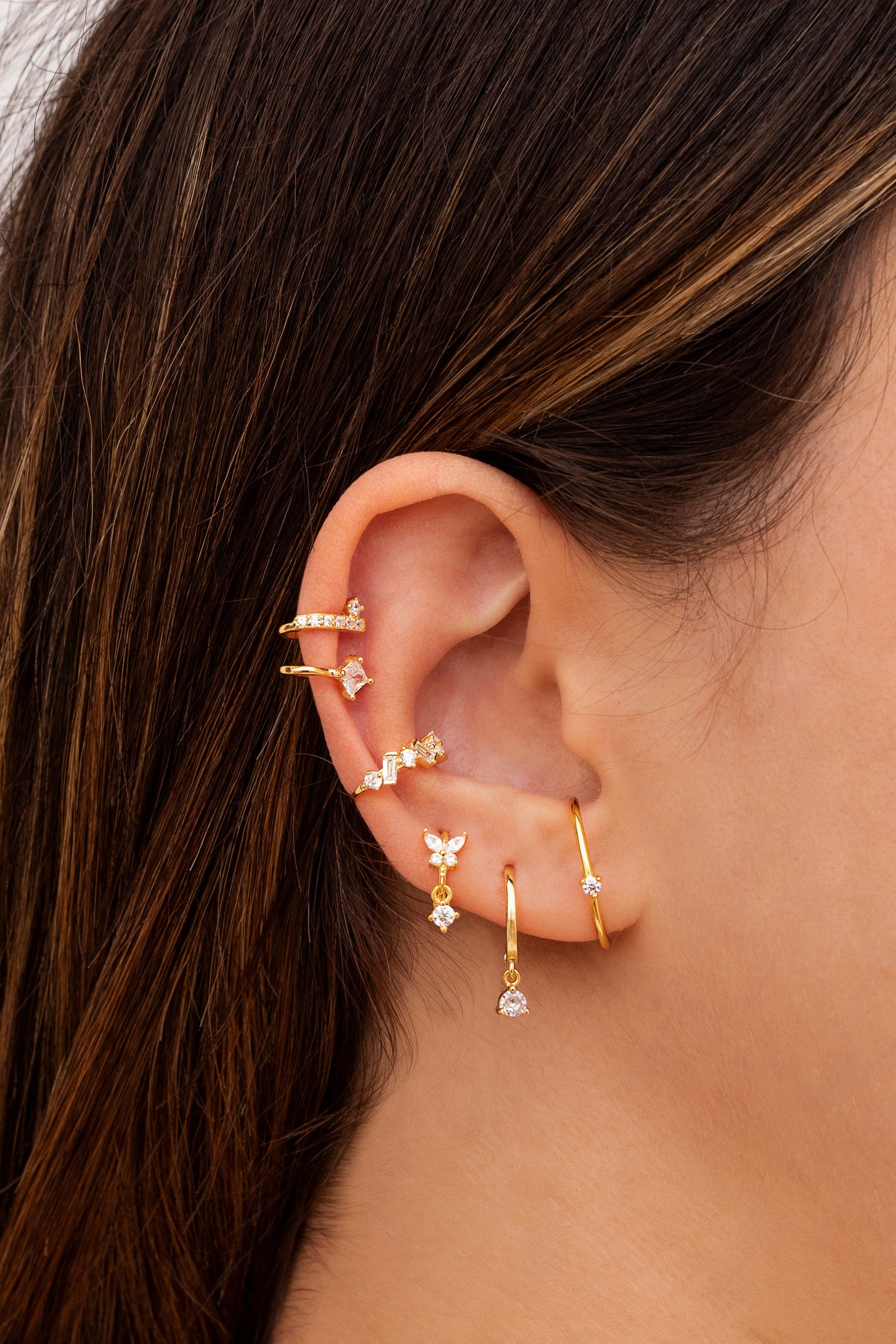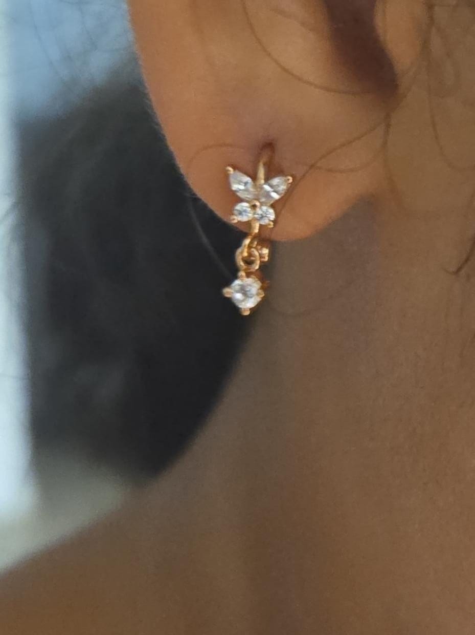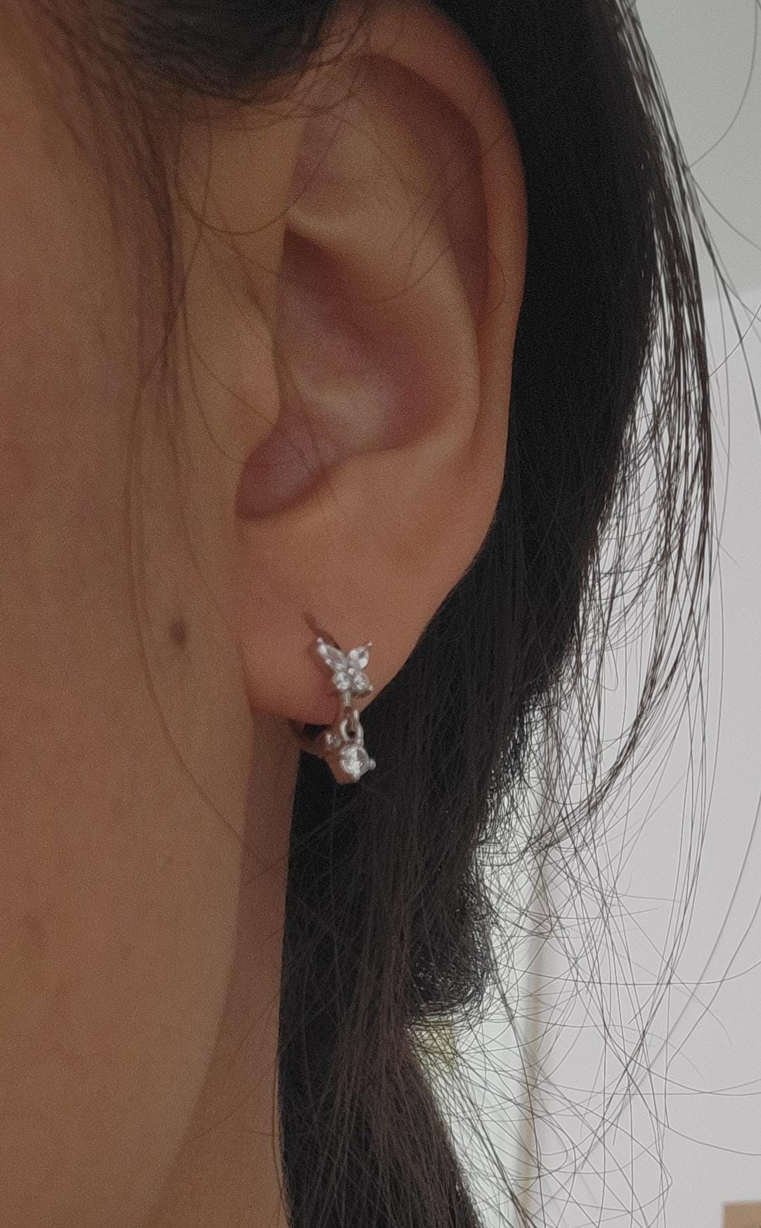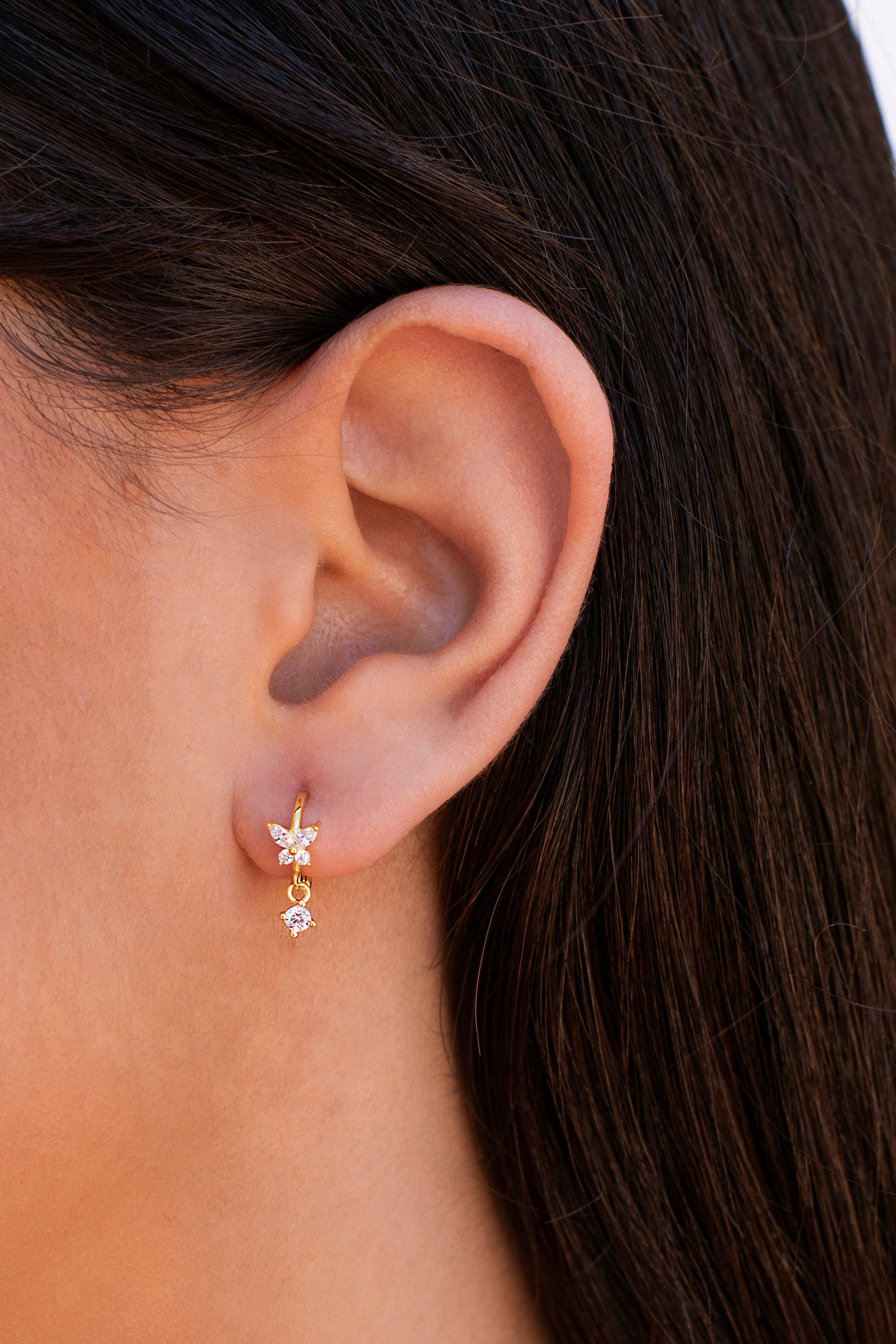 The CZ Butterfly are butterfly shaped huggie hoop earrings with cubic zirconias and a dangling charm. These tiny, modern, minimalist-style earrings can be worn daily as well as on special occasions. Perfect for a gift!