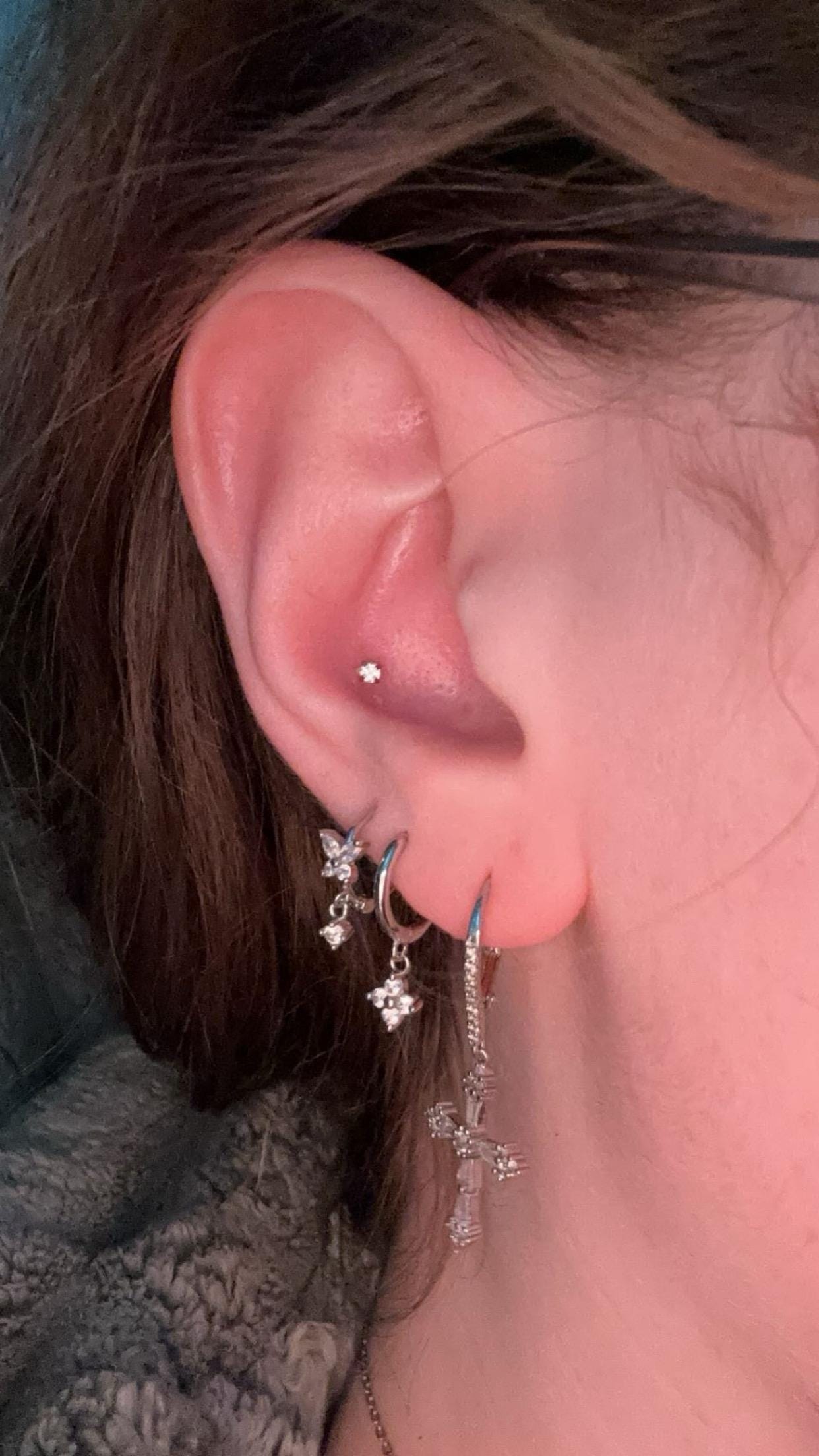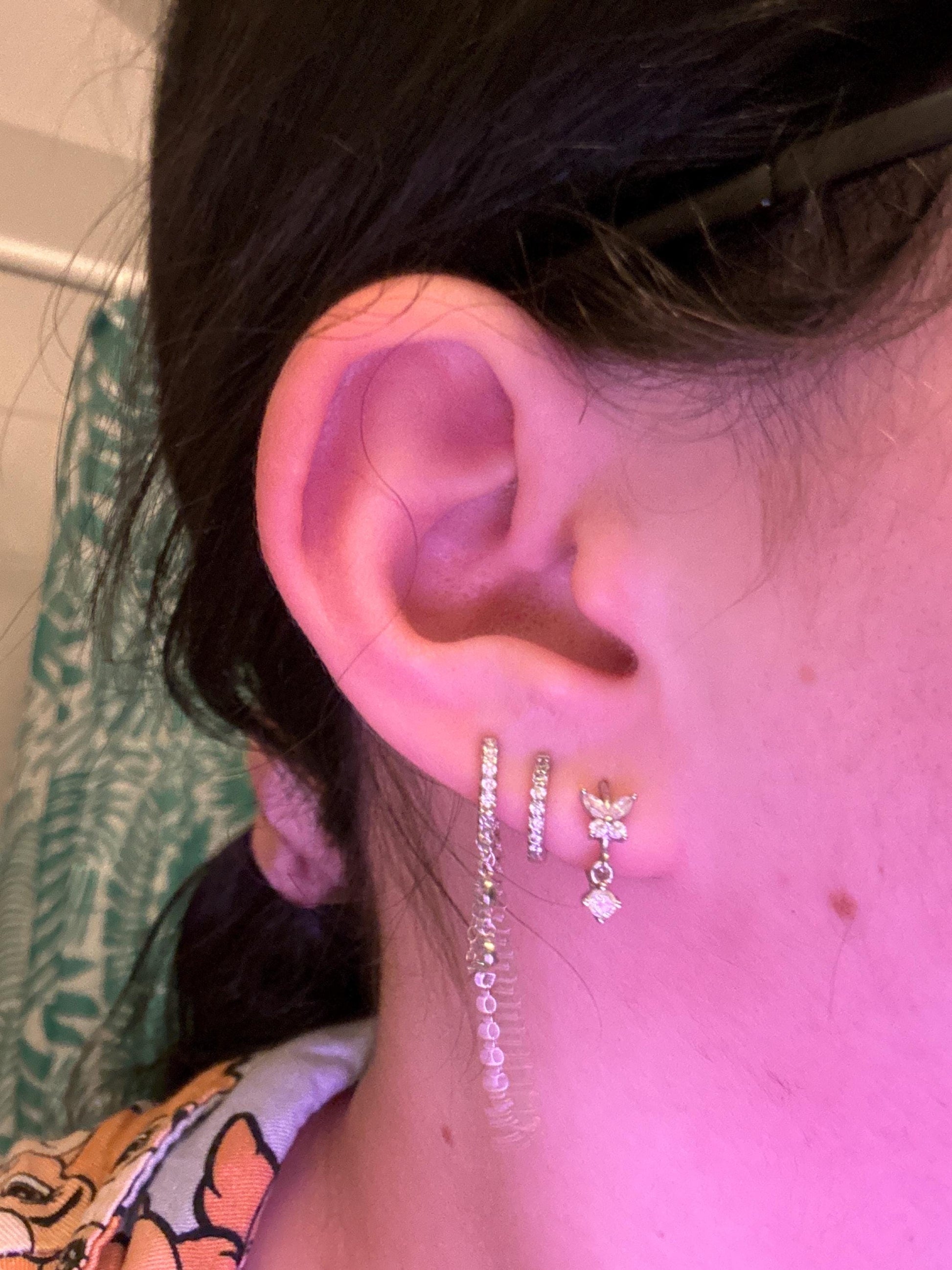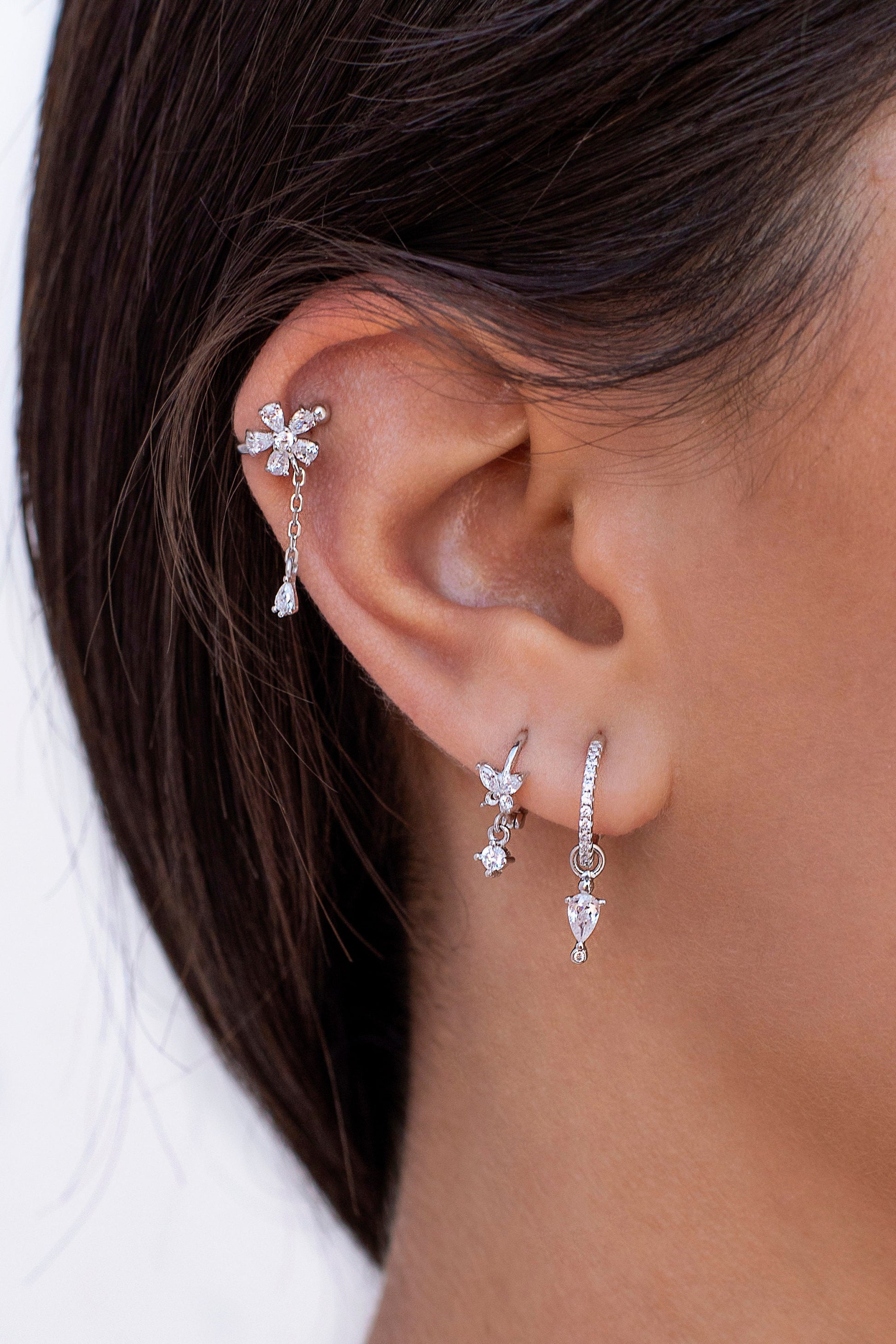 The CZ Butterfly are butterfly shaped huggie hoop earrings with cubic zirconias and a dangling charm. These tiny, modern, minimalist-style earrings can be worn daily as well as on special occasions. Perfect for a gift!