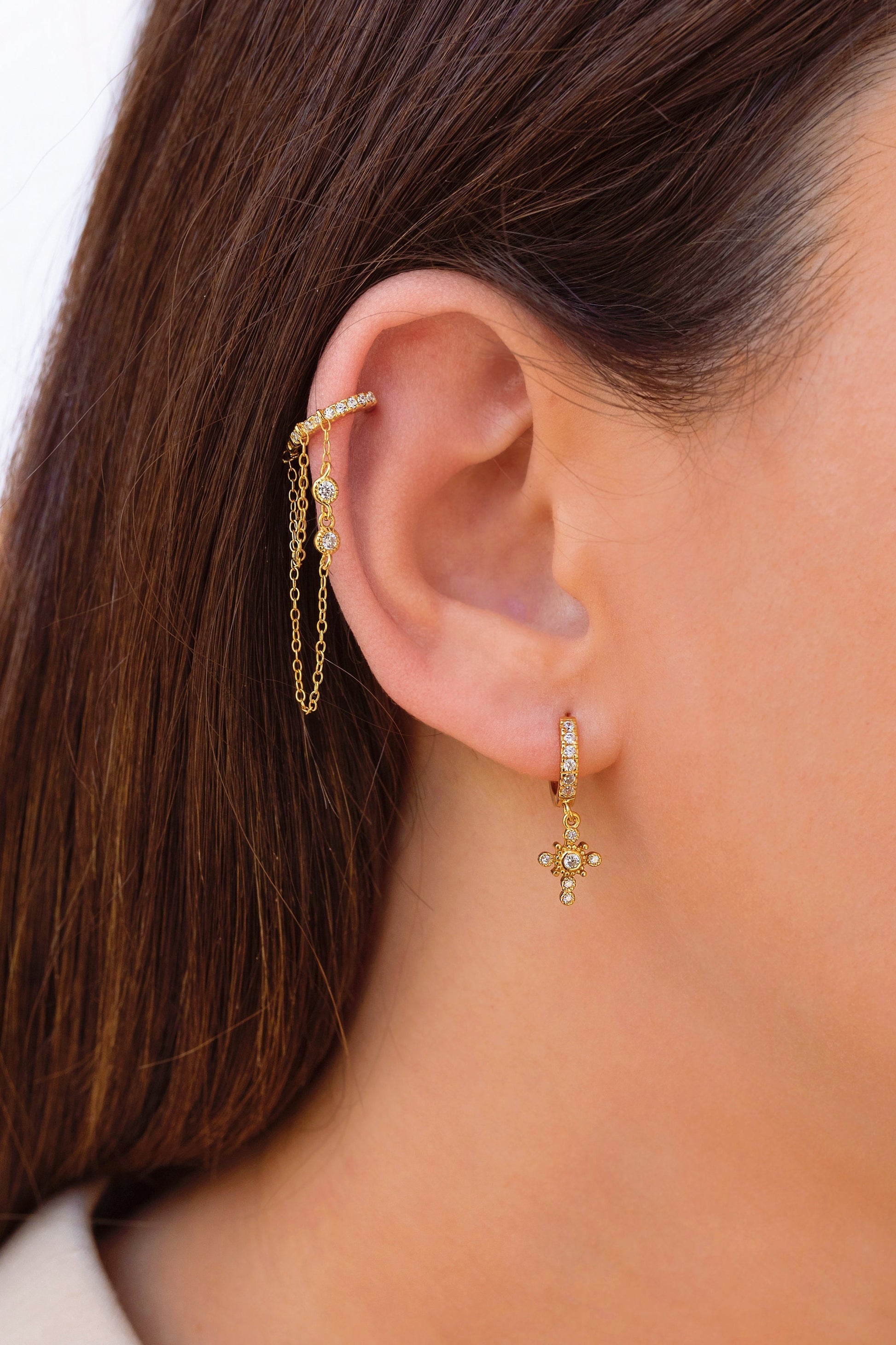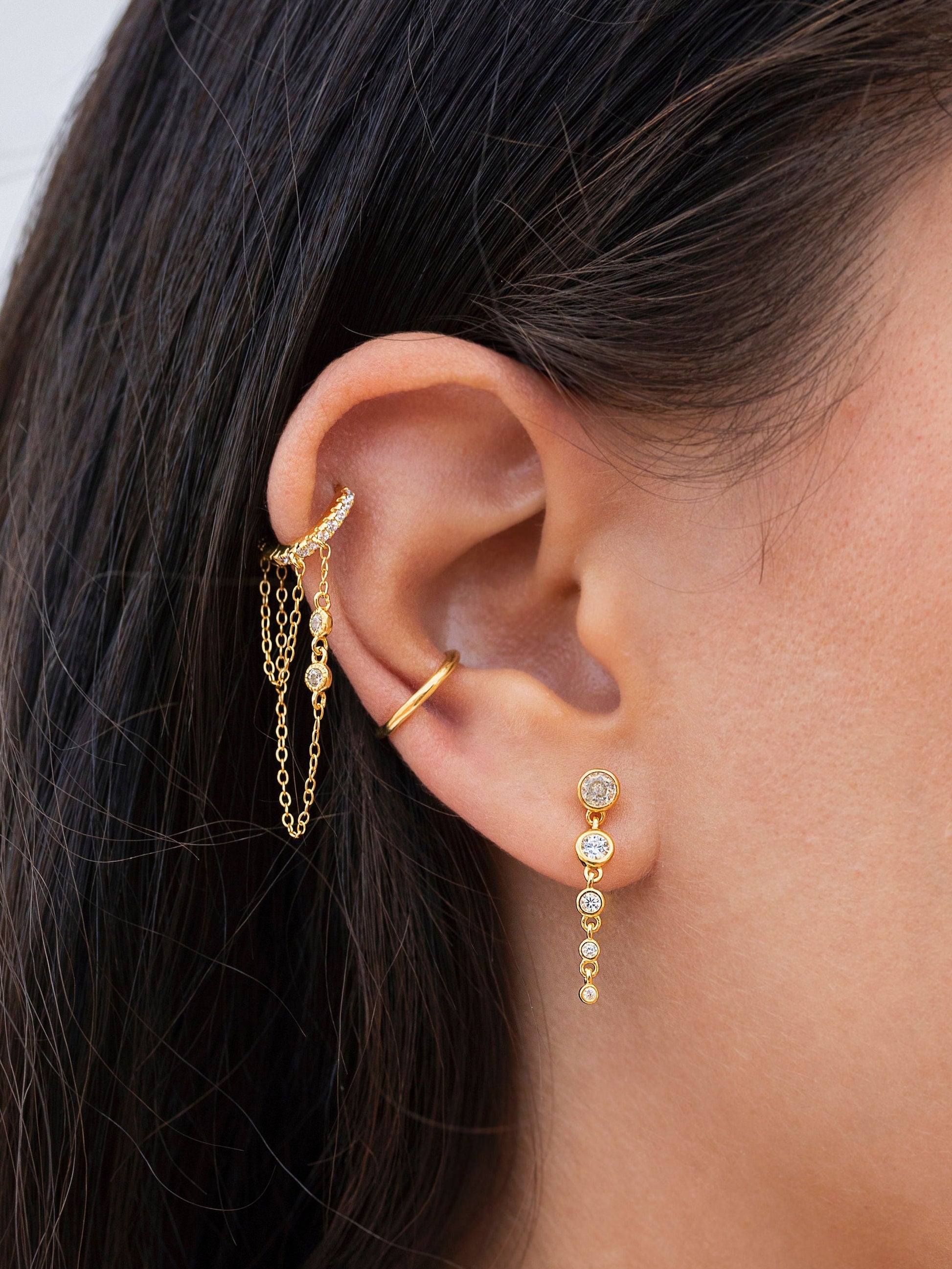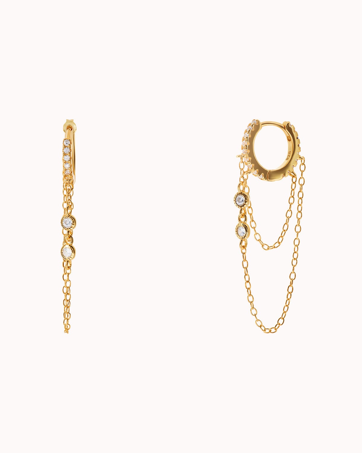 The Kinsey CZ are pave cubic zirconia huggie hoop earrings with 2 dangling chains, one of them with 2 bezel cubic zirconia These dainty, modern, minimalist-style earrings can be worn daily as well as on special occasions. Perfect for a gift!