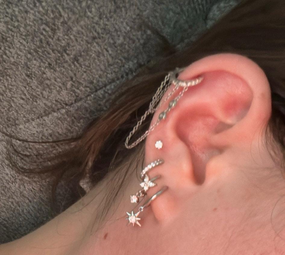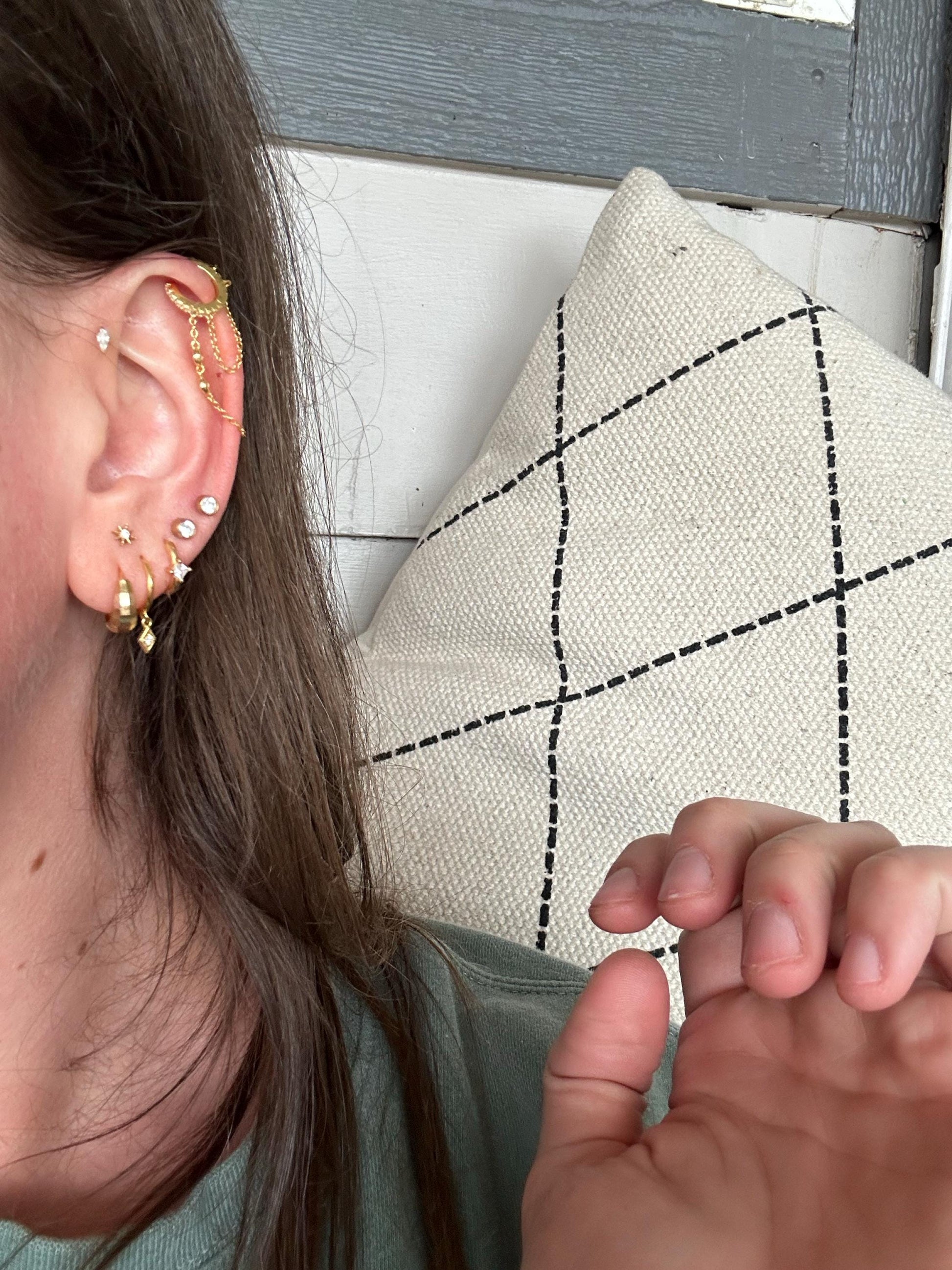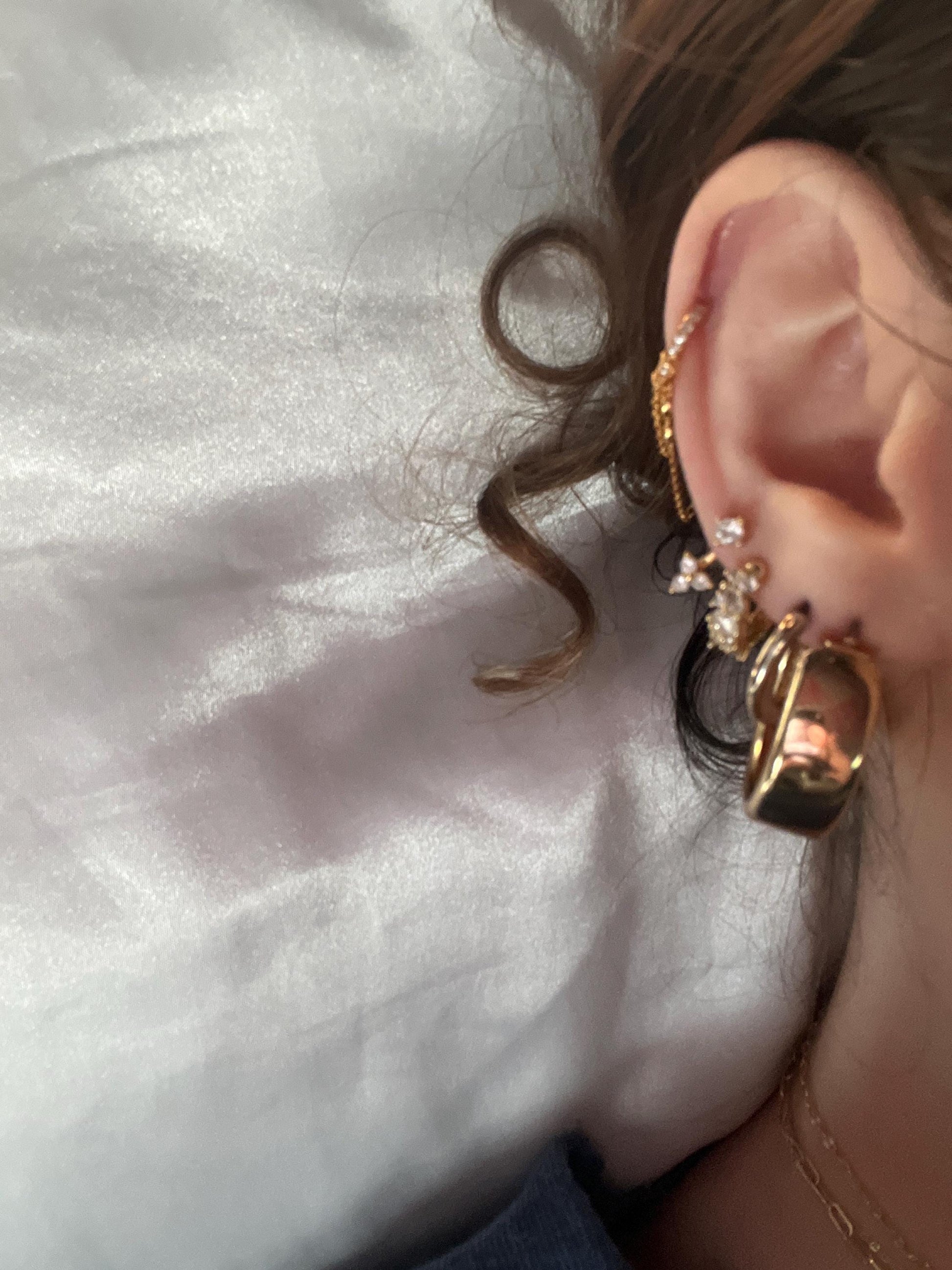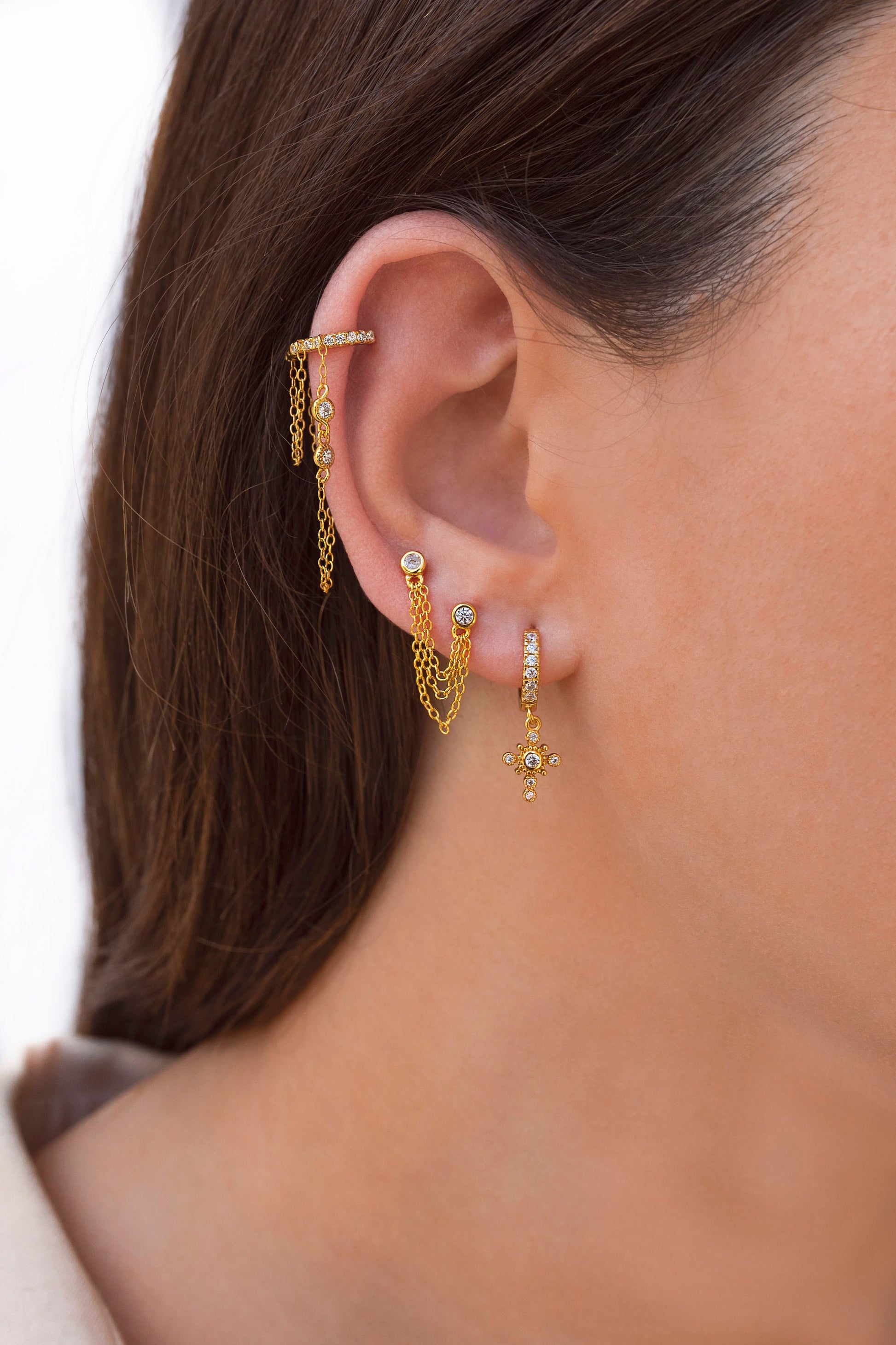 The Kinsey CZ are pave cubic zirconia huggie hoop earrings with 2 dangling chains, one of them with 2 bezel cubic zirconia These dainty, modern, minimalist-style earrings can be worn daily as well as on special occasions. Perfect for a gift!
