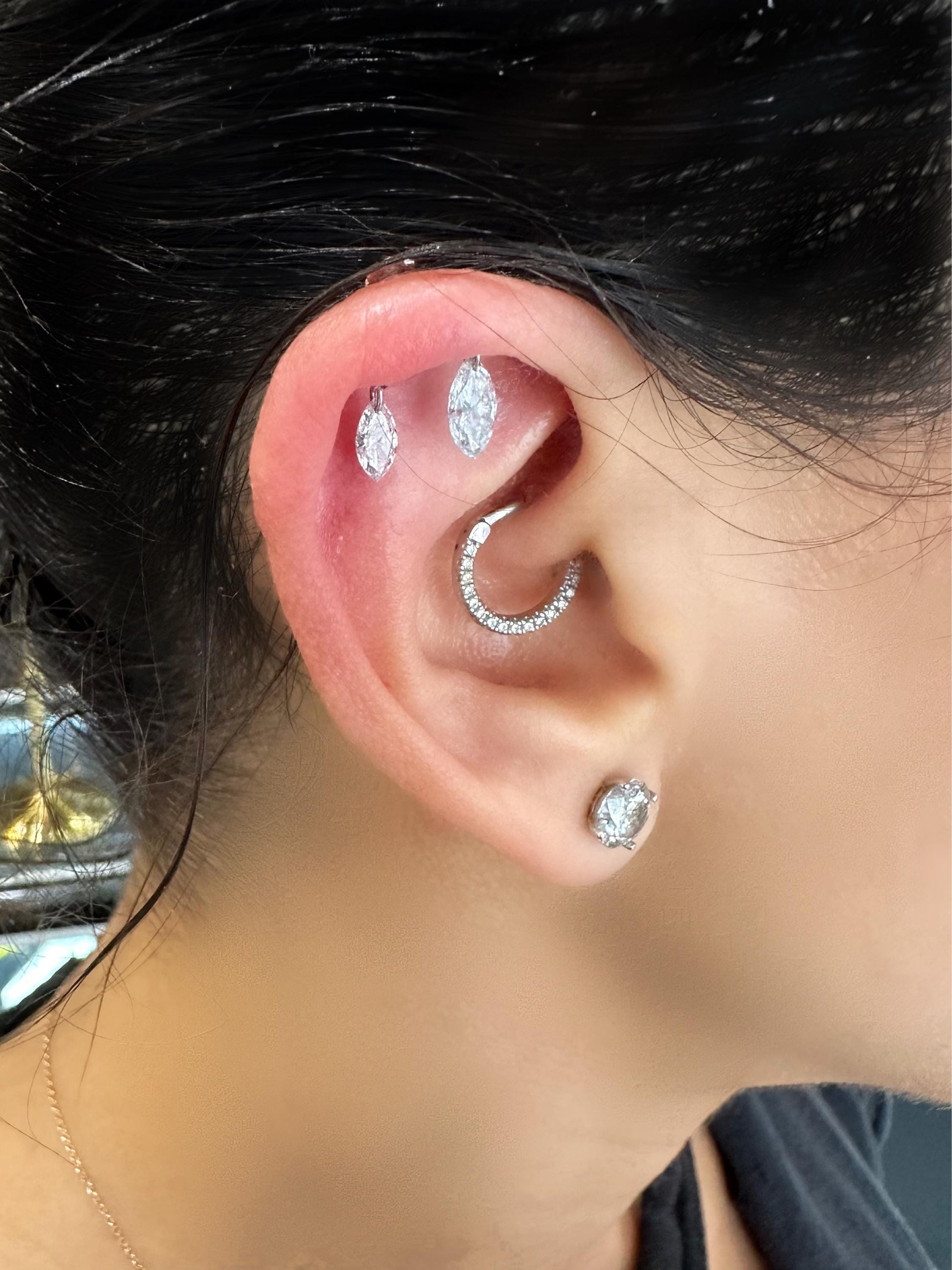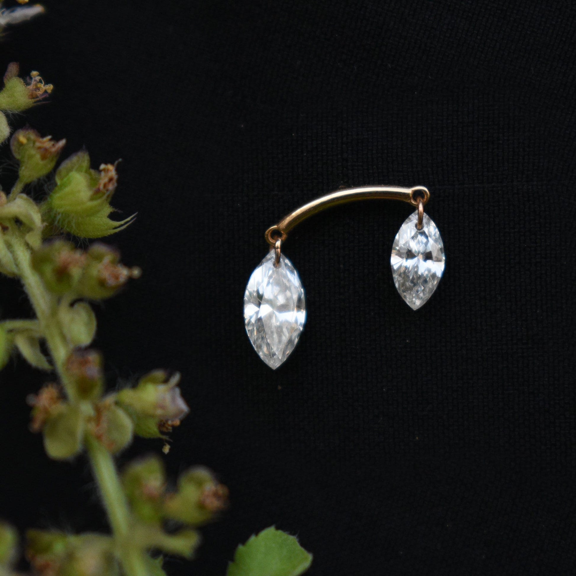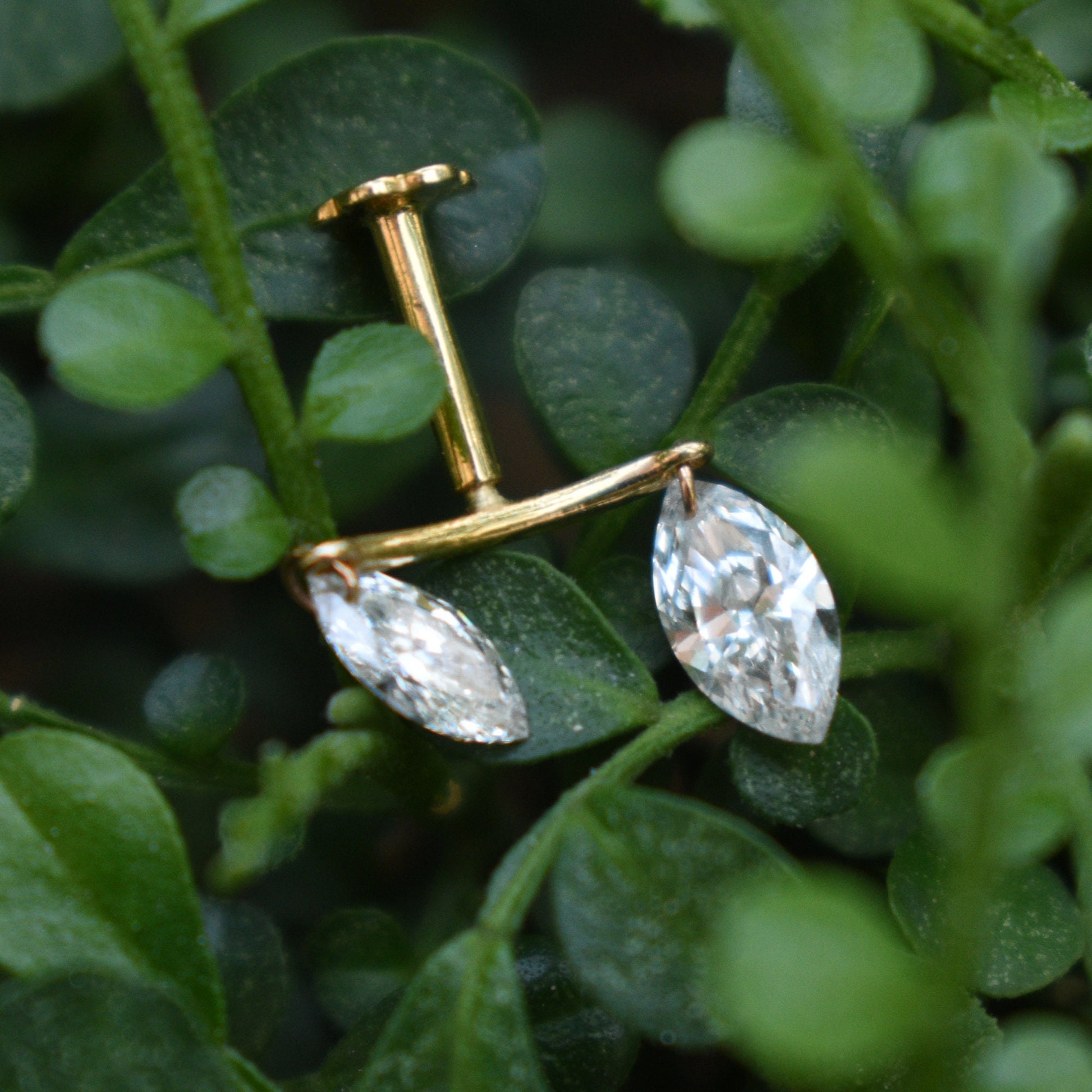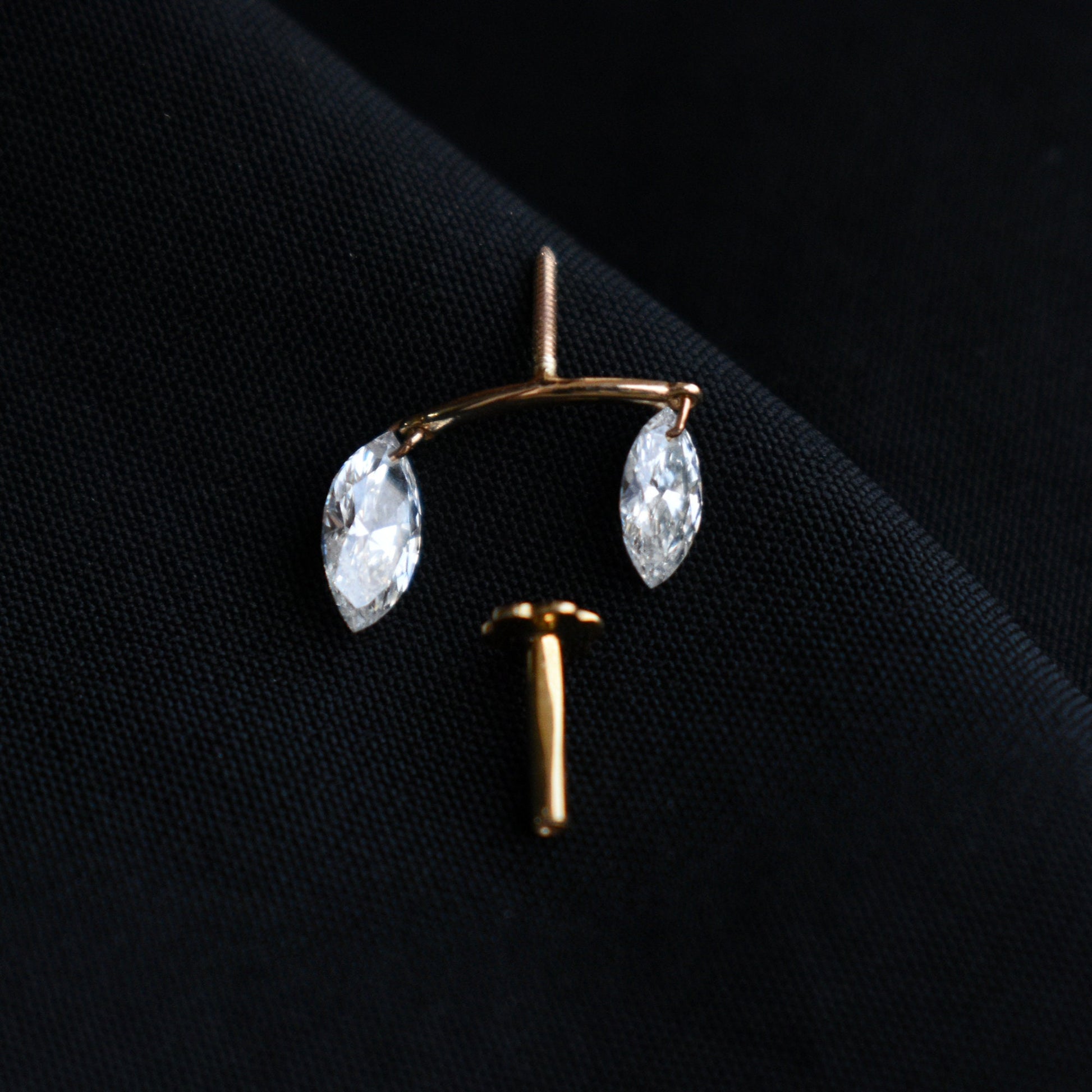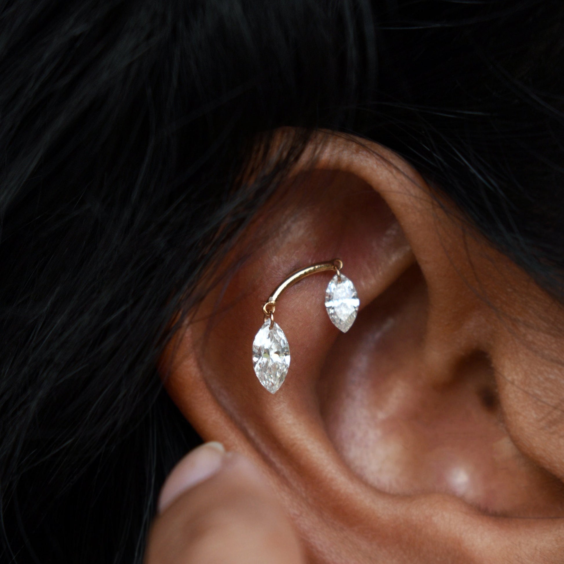 This unique hidden helix piercing showcases two lab-grown marquise cut diamonds, delicately drilled and suspended from a curved gold bar. Crafted in solid 14k or 18k gold, this lab-grown diamond stud is a must-have for every piercing enthusiast. The curved bar can be hidden within the contours of the ear to give the impression of two piercings.