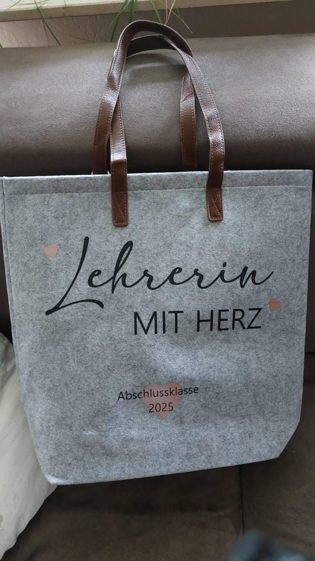 Are you looking for a special way to thank your favorite teacher? Our exclusive felt shopper bag in light gray with brown handles is the perfect choice!