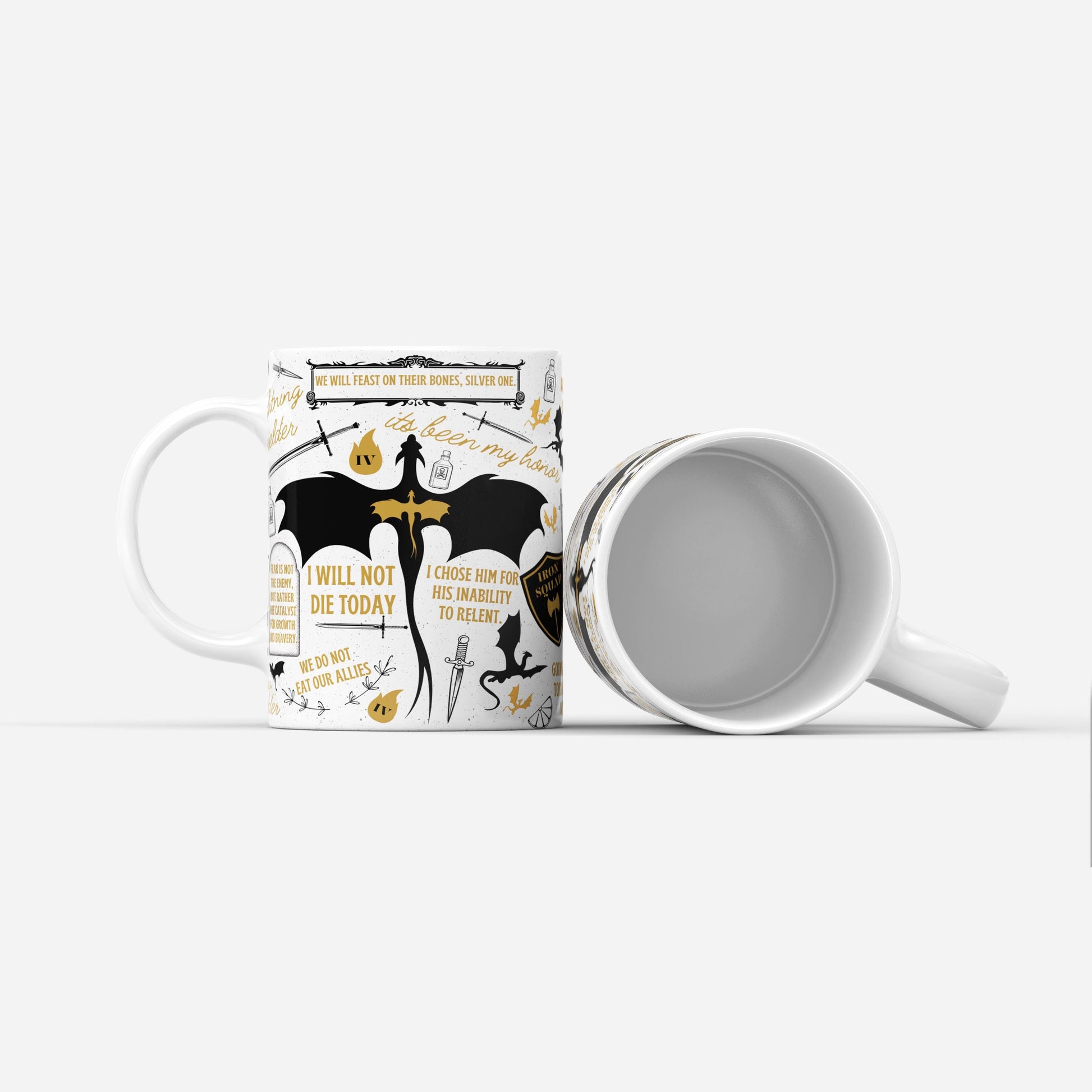 Indulge your love for fantasy with this Fourth Wing-inspired mug, perfect for book lovers and dragon riders. Featuring iconic quotes, this Basgiath War College coffee cup makes a unique gift for fans of Violet Sorrengail and Xaden Riorson.