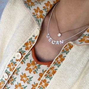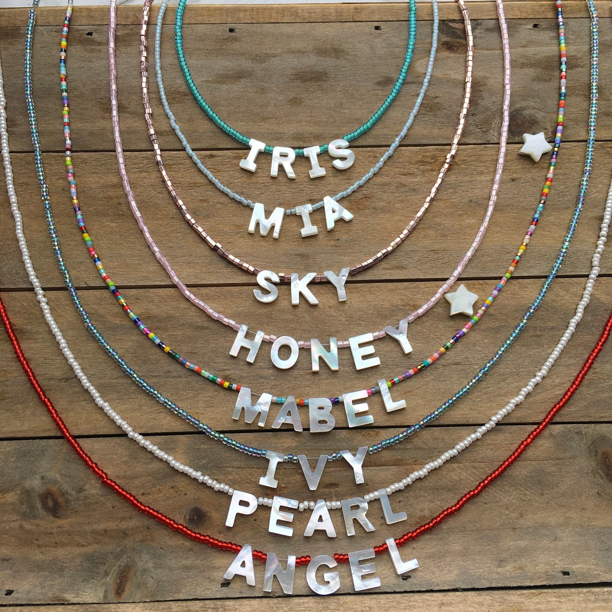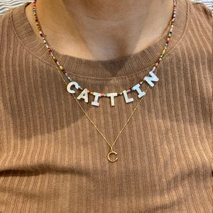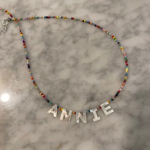 Personalise with your name a favourite word or initials with pretty genuine handmade mother of Pearl letters. These necklaces are handmade to order with only the best materials… genuine miyuki beads natural mother of Pearl strung on designer grade wire with has 19 strands twisted together for ultimate drape like chain…