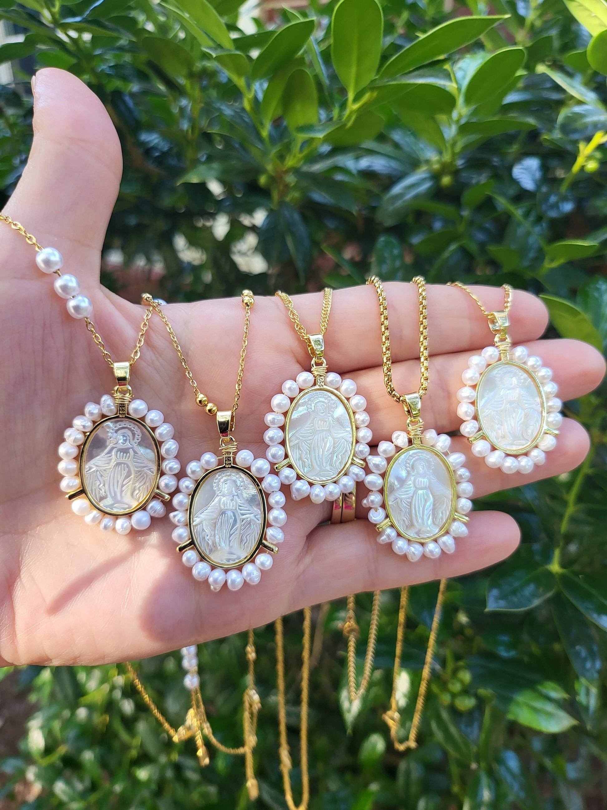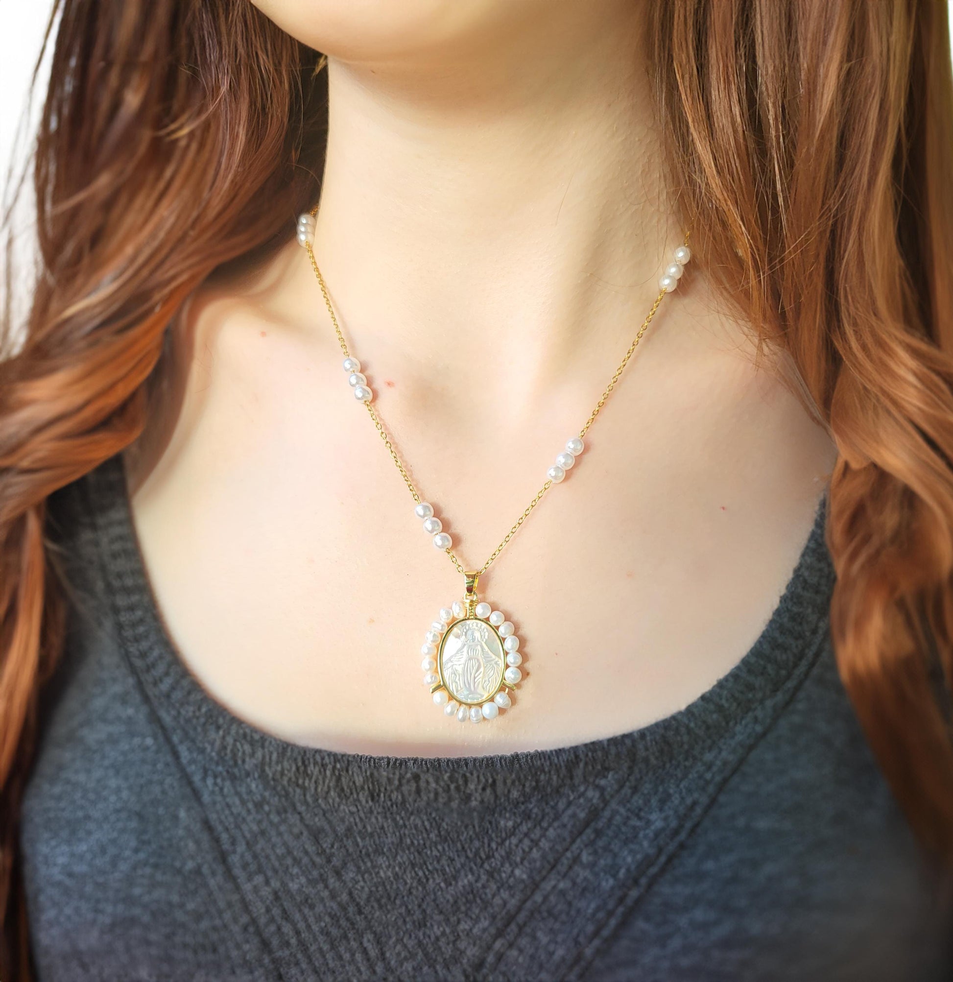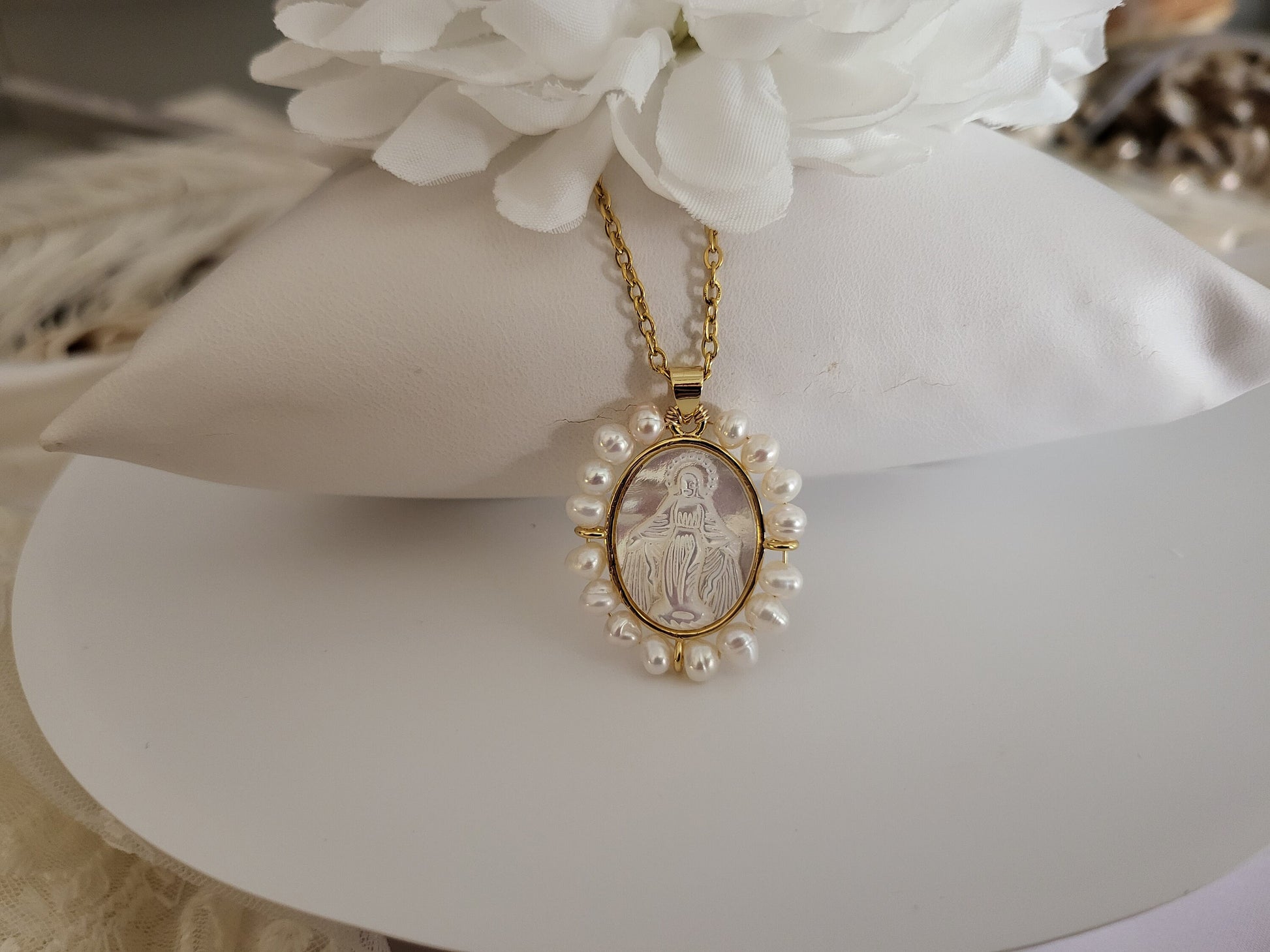 Gold Filled Mother of Pearl Virgin Mary Necklace, Gift For Mom.
