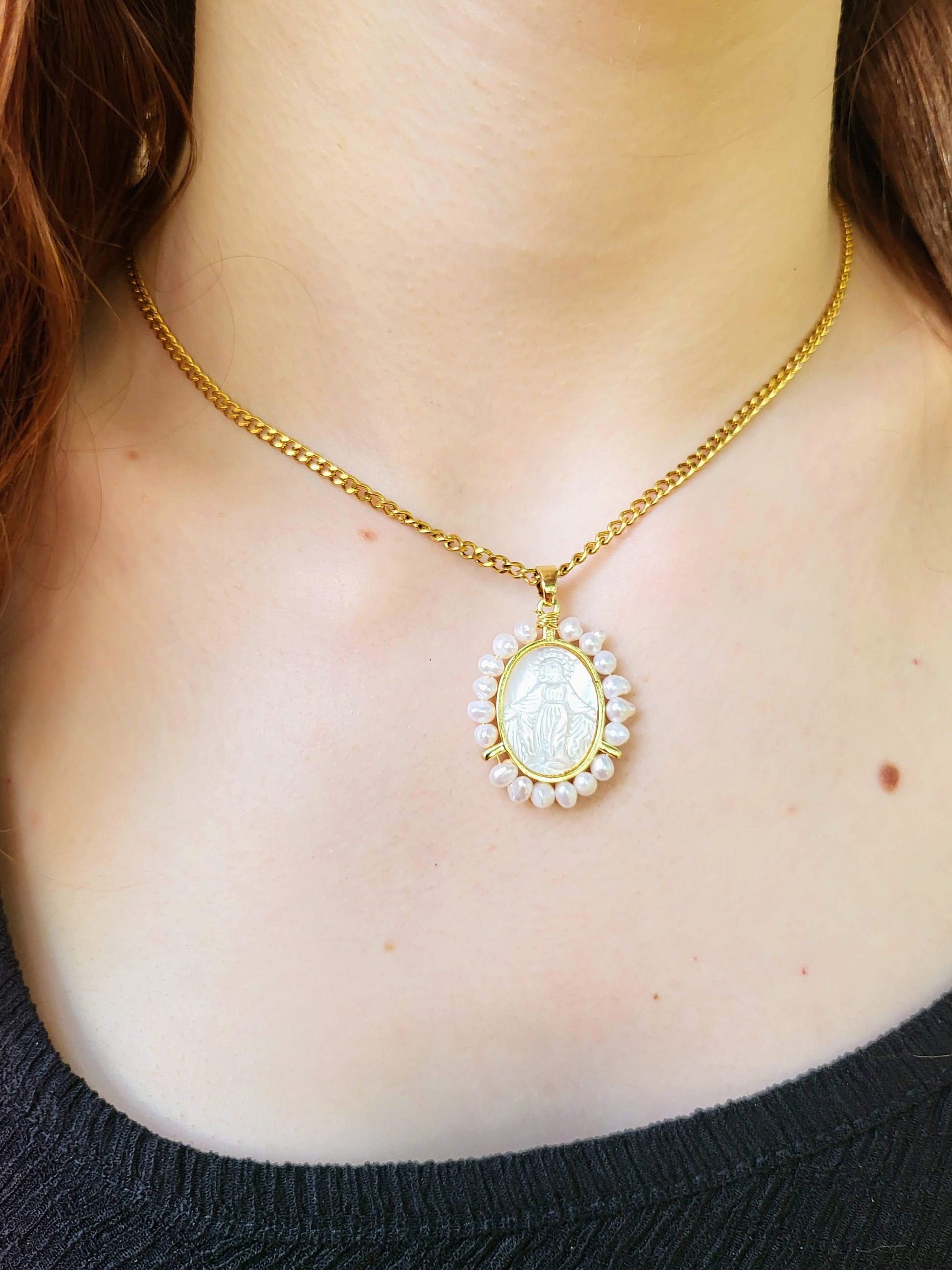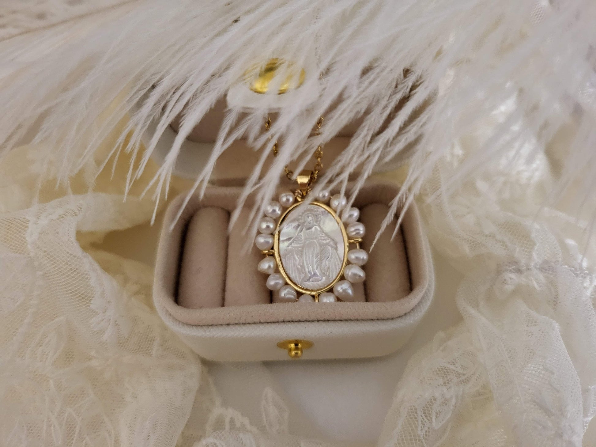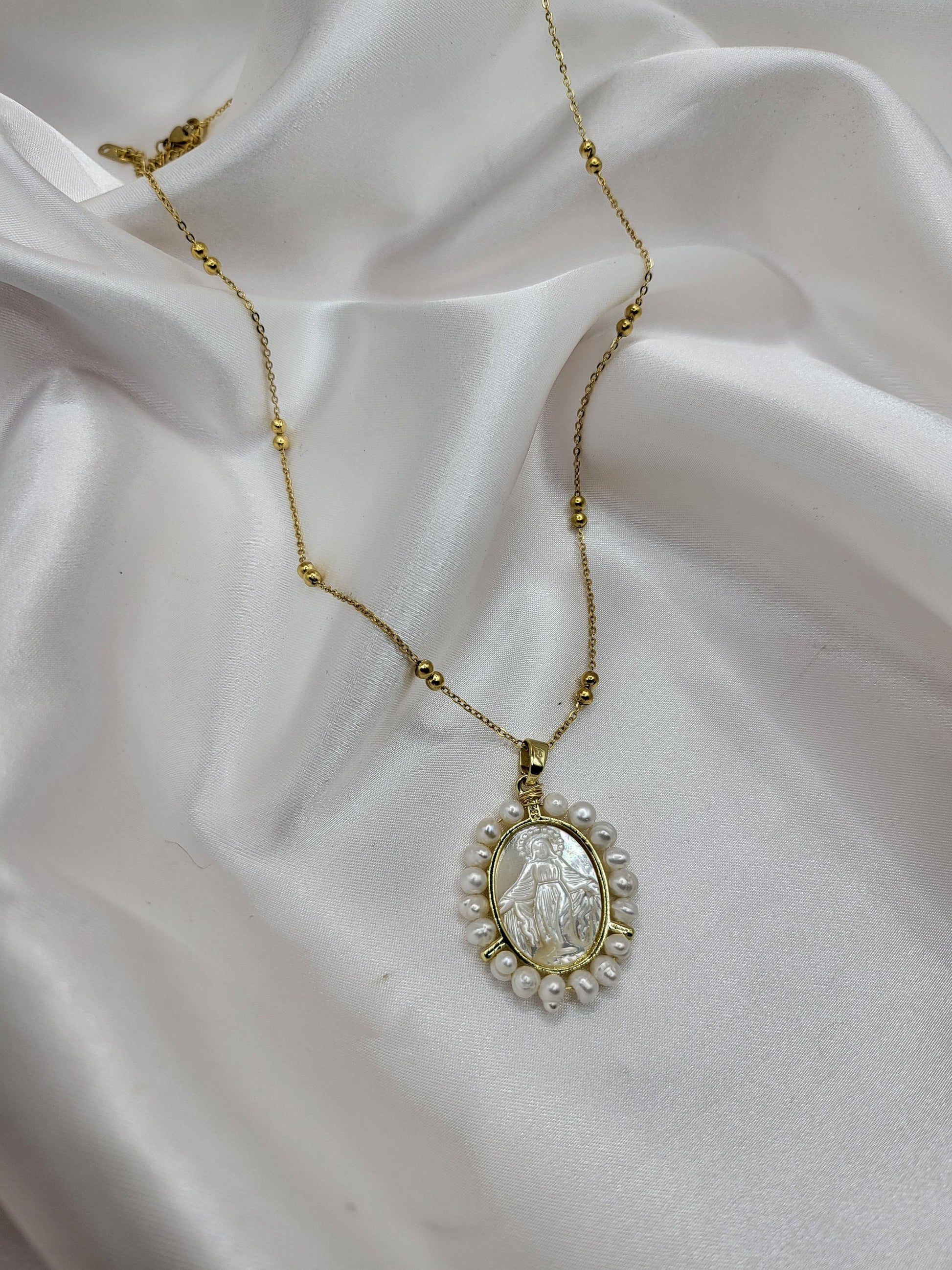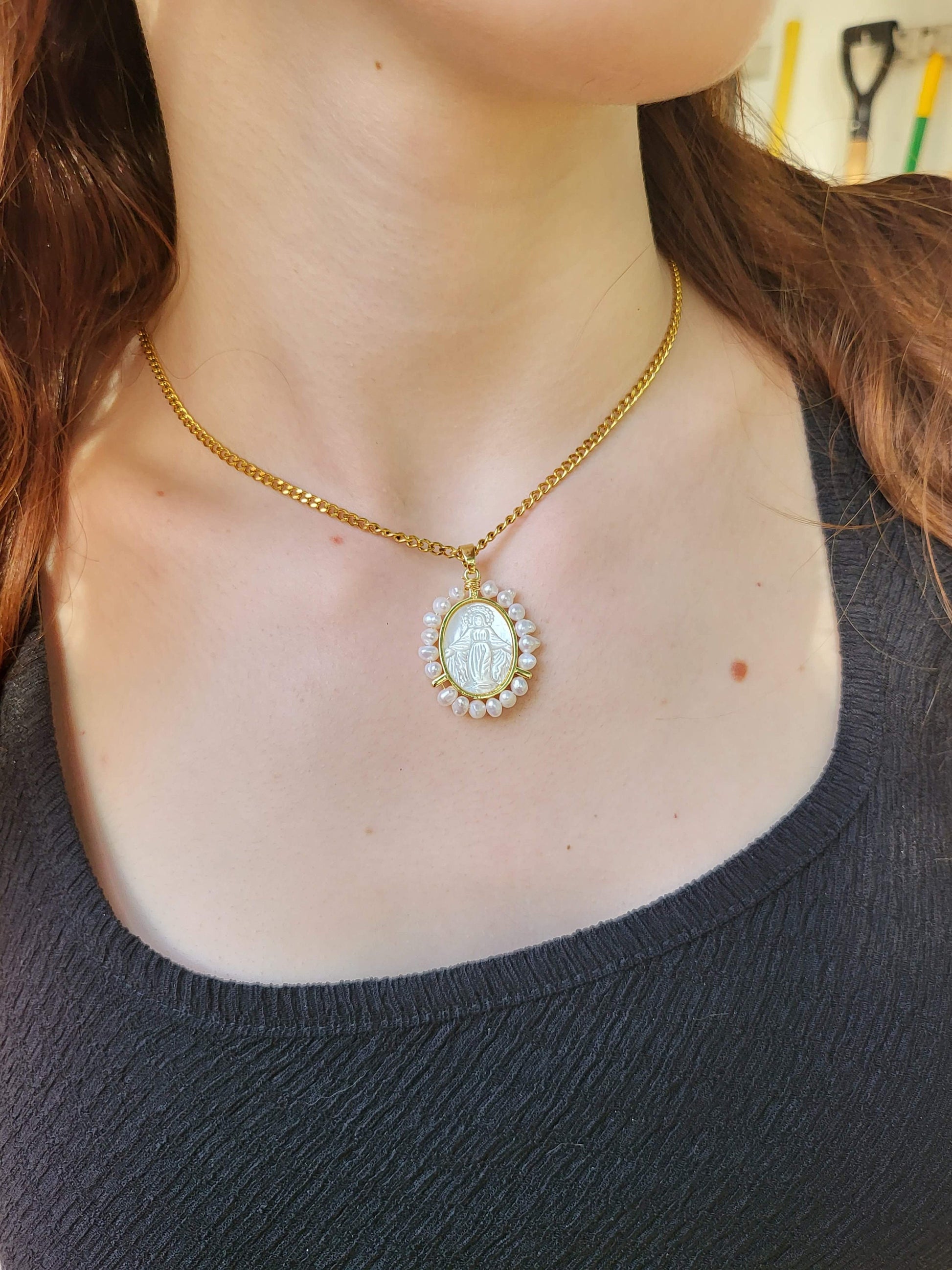 Gold Filled Mother of Pearl Virgin Mary Necklace, Gift For Mom.