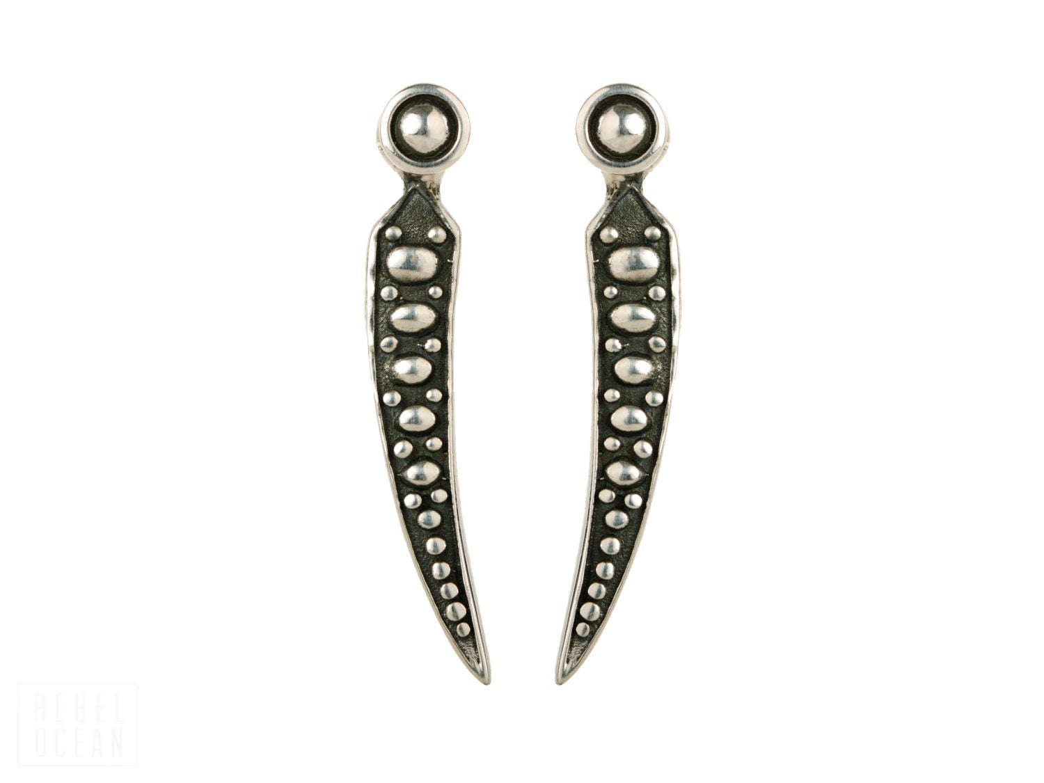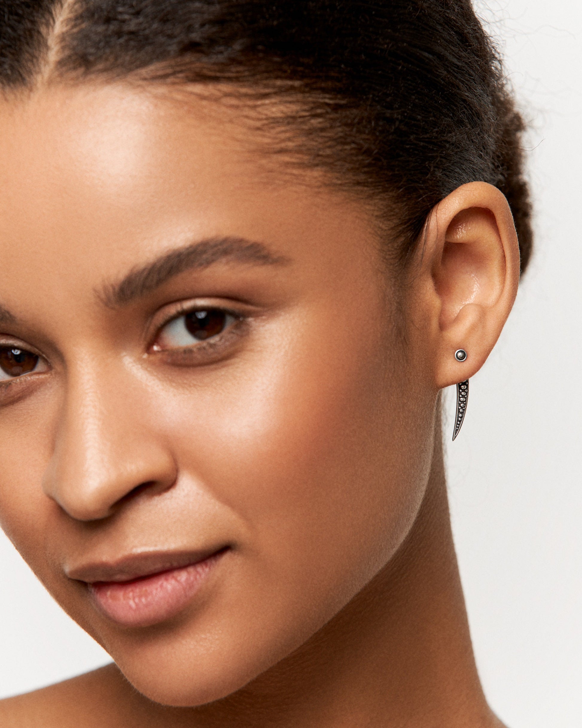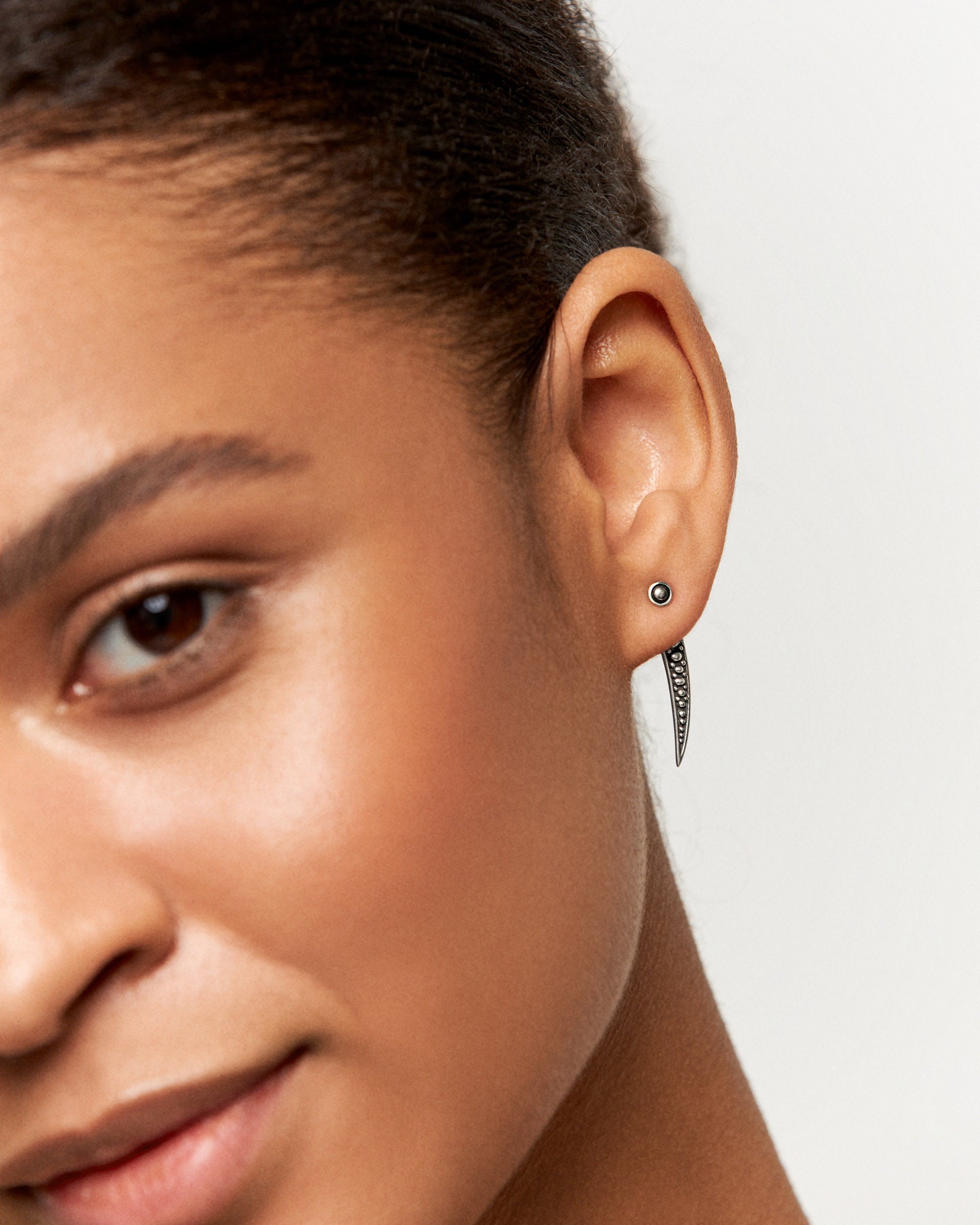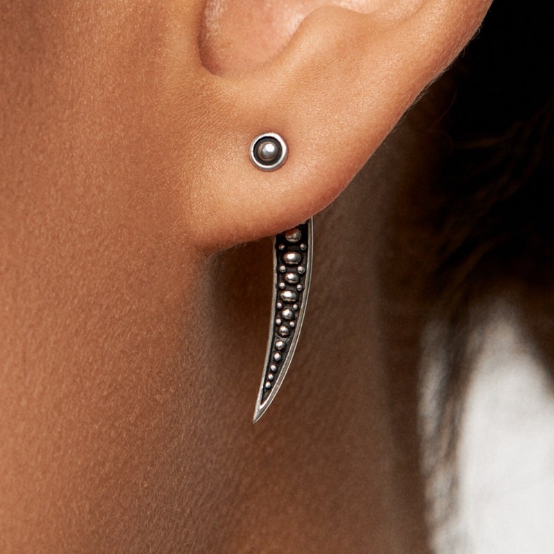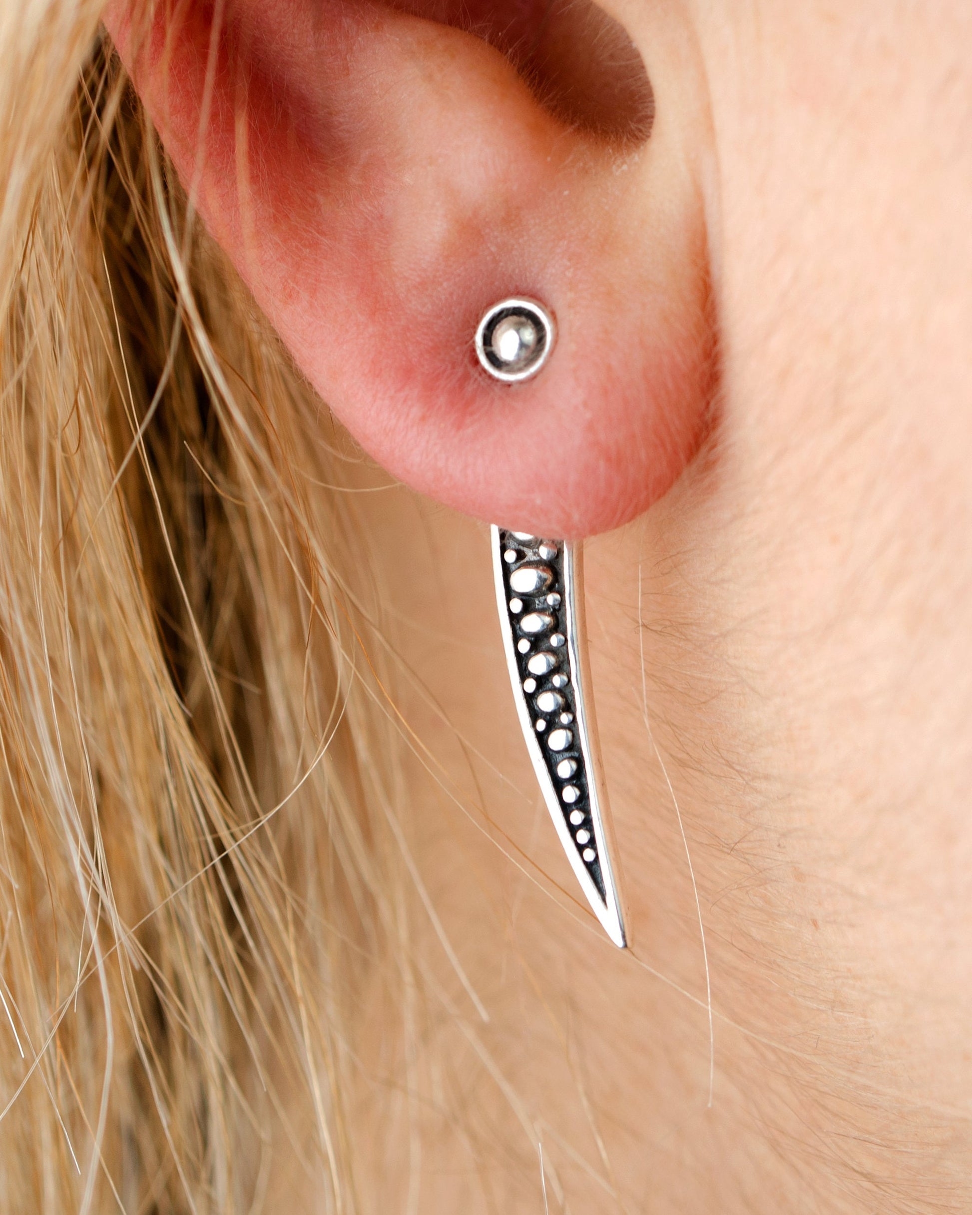 Dark Silver Claw Ear Jacket earrings cast in solid Sterling Silver 925, finished with black oxide and hand-shiny polish. The Earring measures 1" (26mm) long. Moon dot stud earring can also be worn separately.