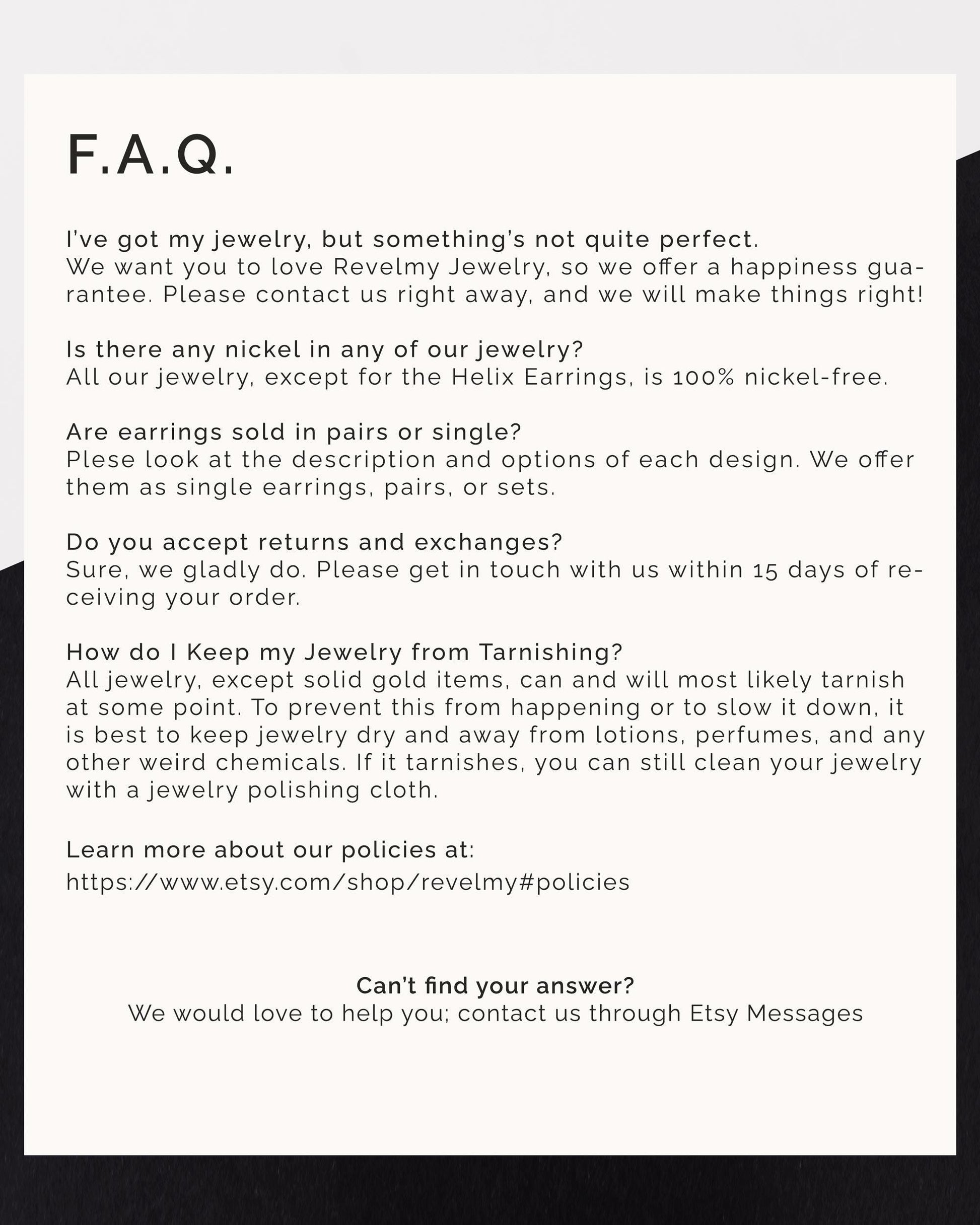 All our pieces are packed in Jewelry Boxes. It will make the perfect moment for yourself or the ones you Love! If certain pieces are intended as gifts, please leave us a note or mark your order as a Gift at check out. No receipt or invoice will be included with your jewelry.