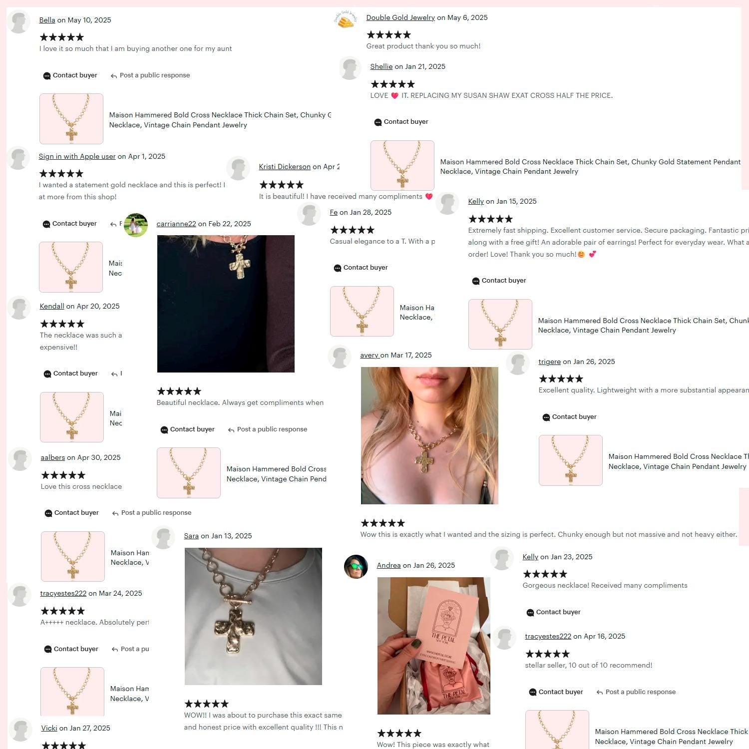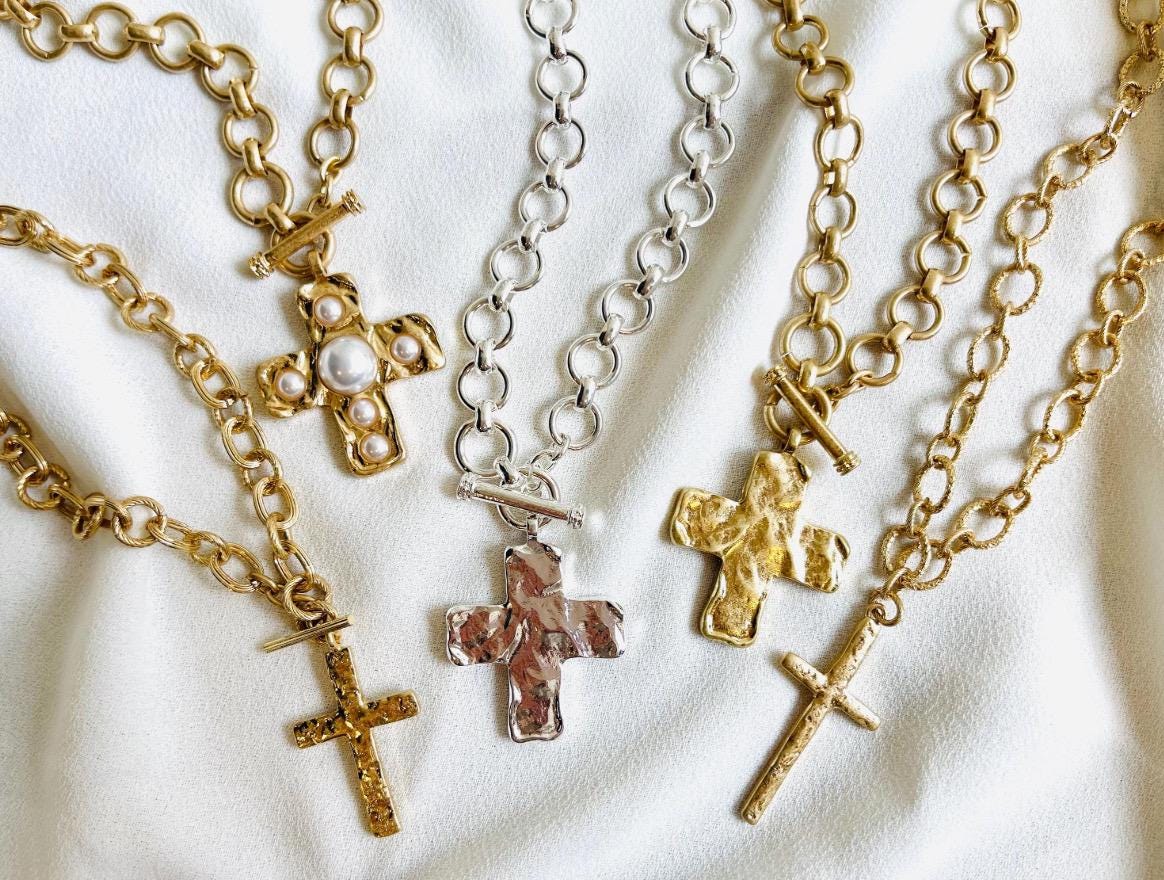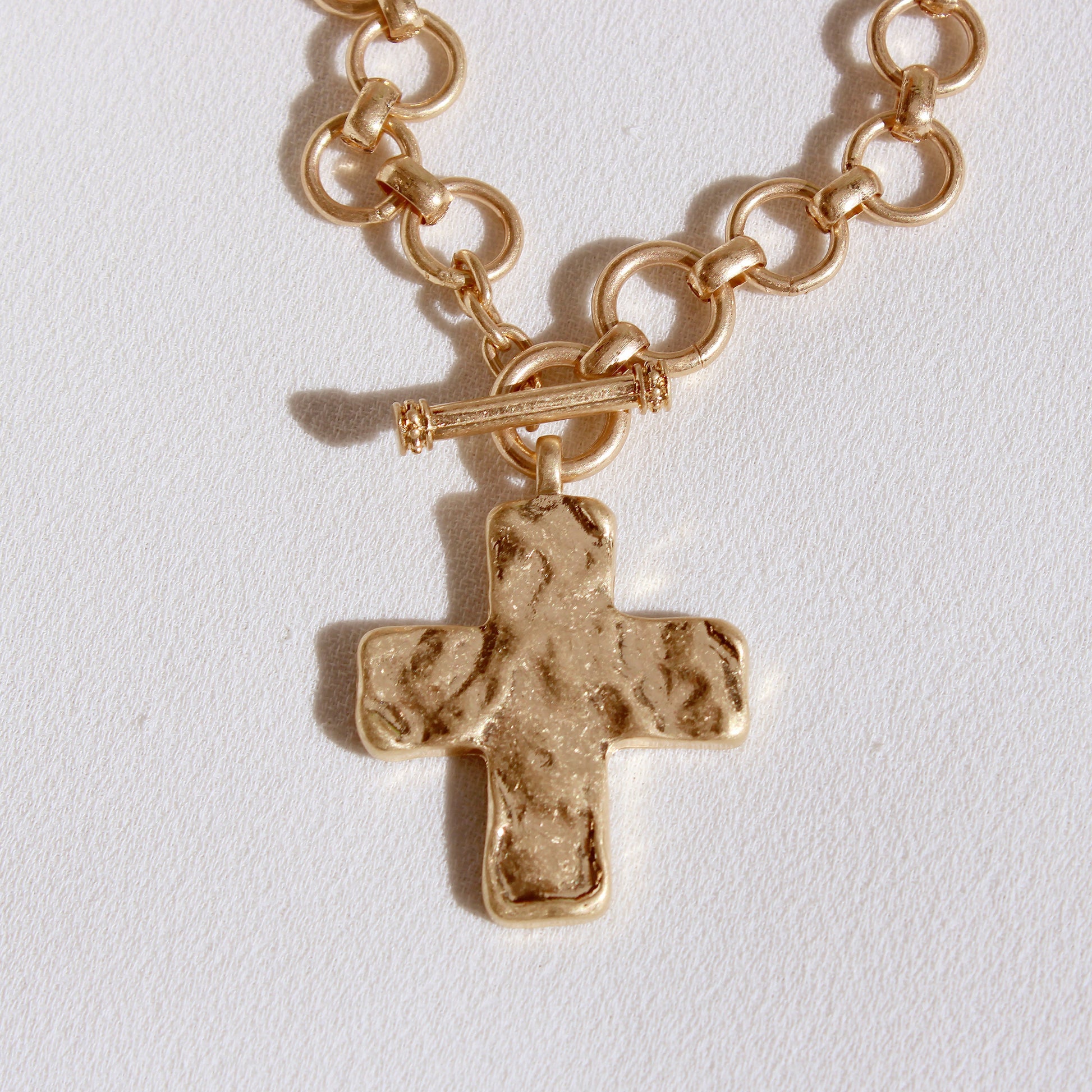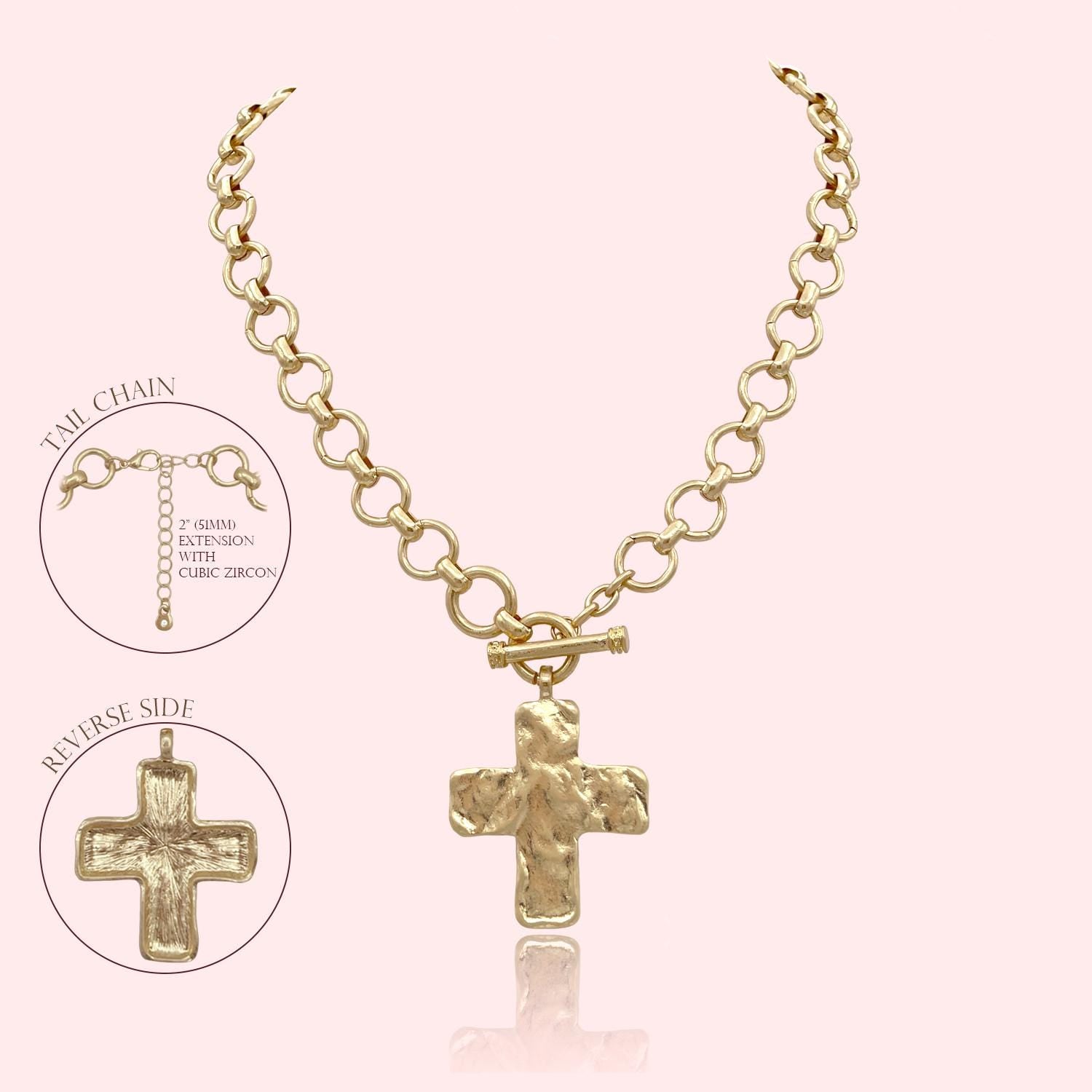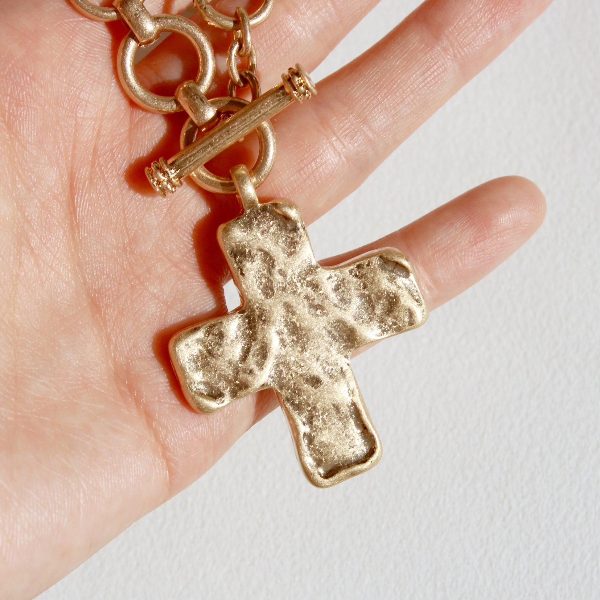 Hammered Bold Cross Necklace Thick Chain Set, Chunky Cross Statement Pendant Toggle Necklace, Handmade Toggle Hammered TextureCross Necklace