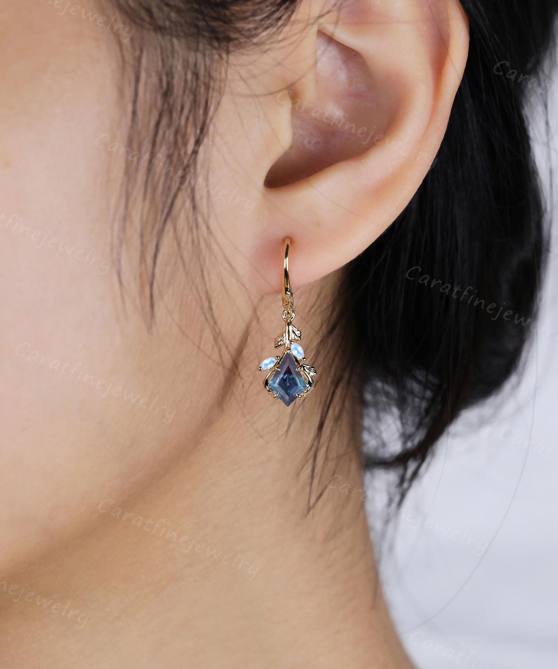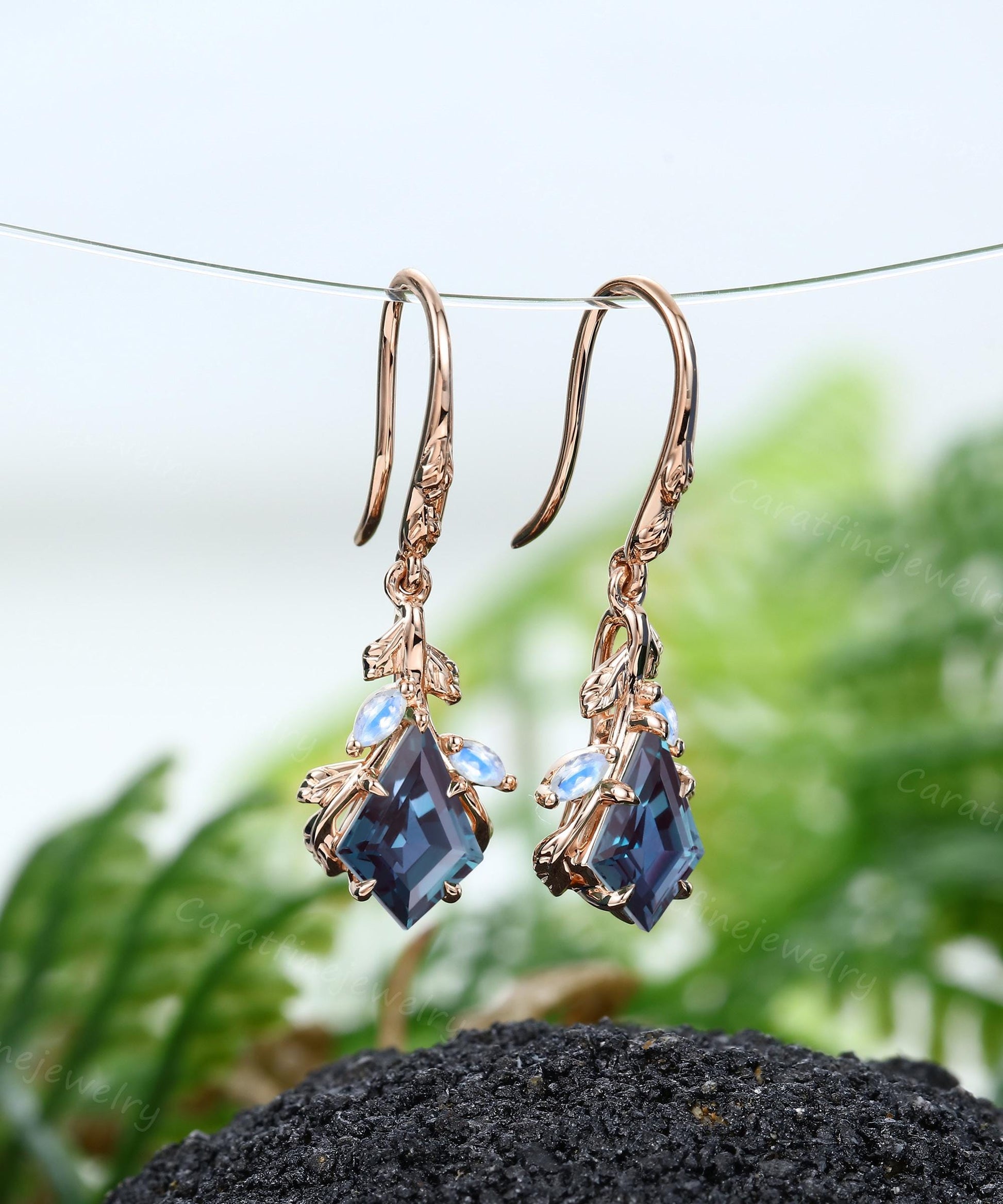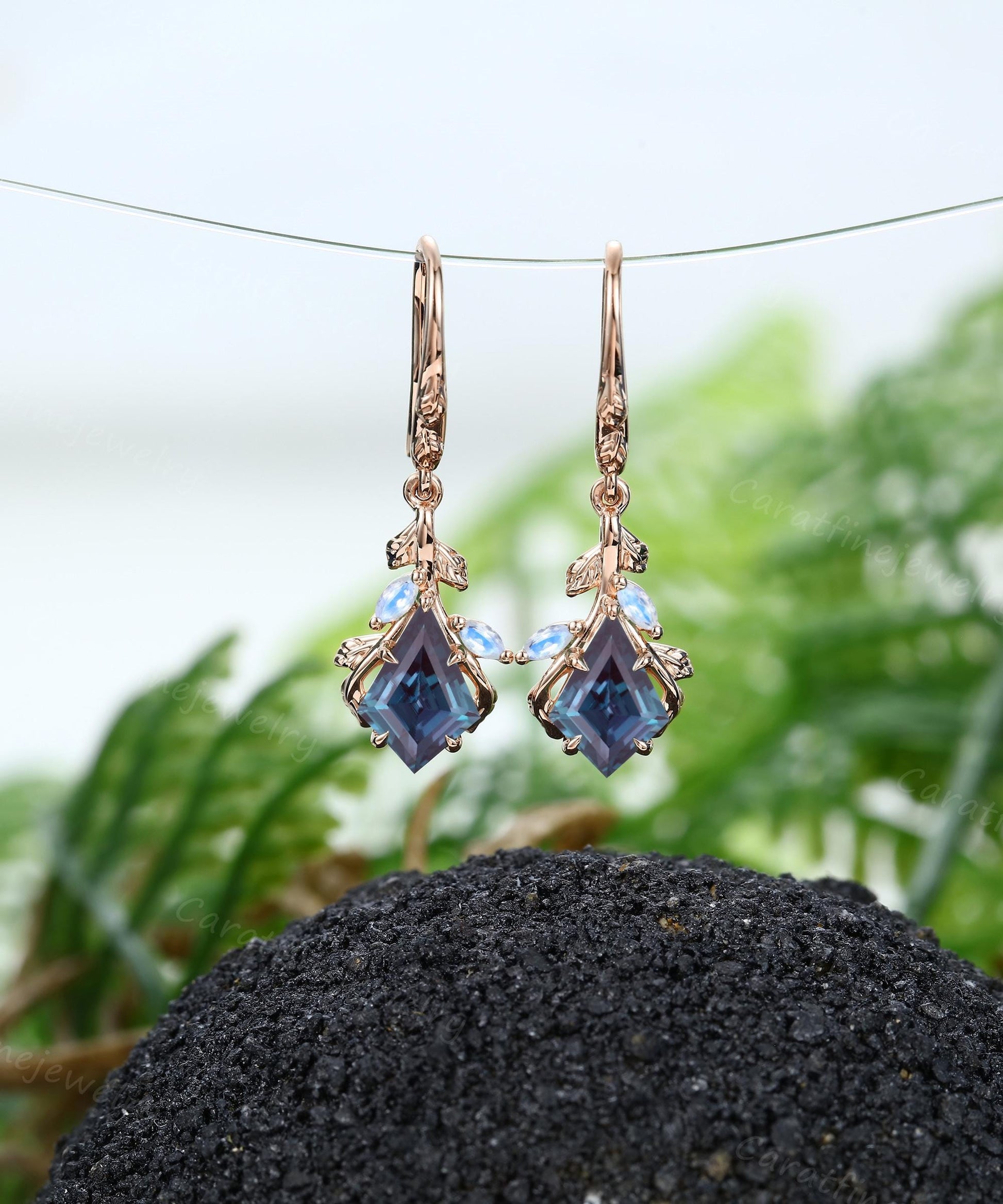 Kite cut Alexandrite Earrings Rose gold Leaf Nature Inspired earring Moonstone Earrings Bridal Jewelry promise gift June birthstone for her