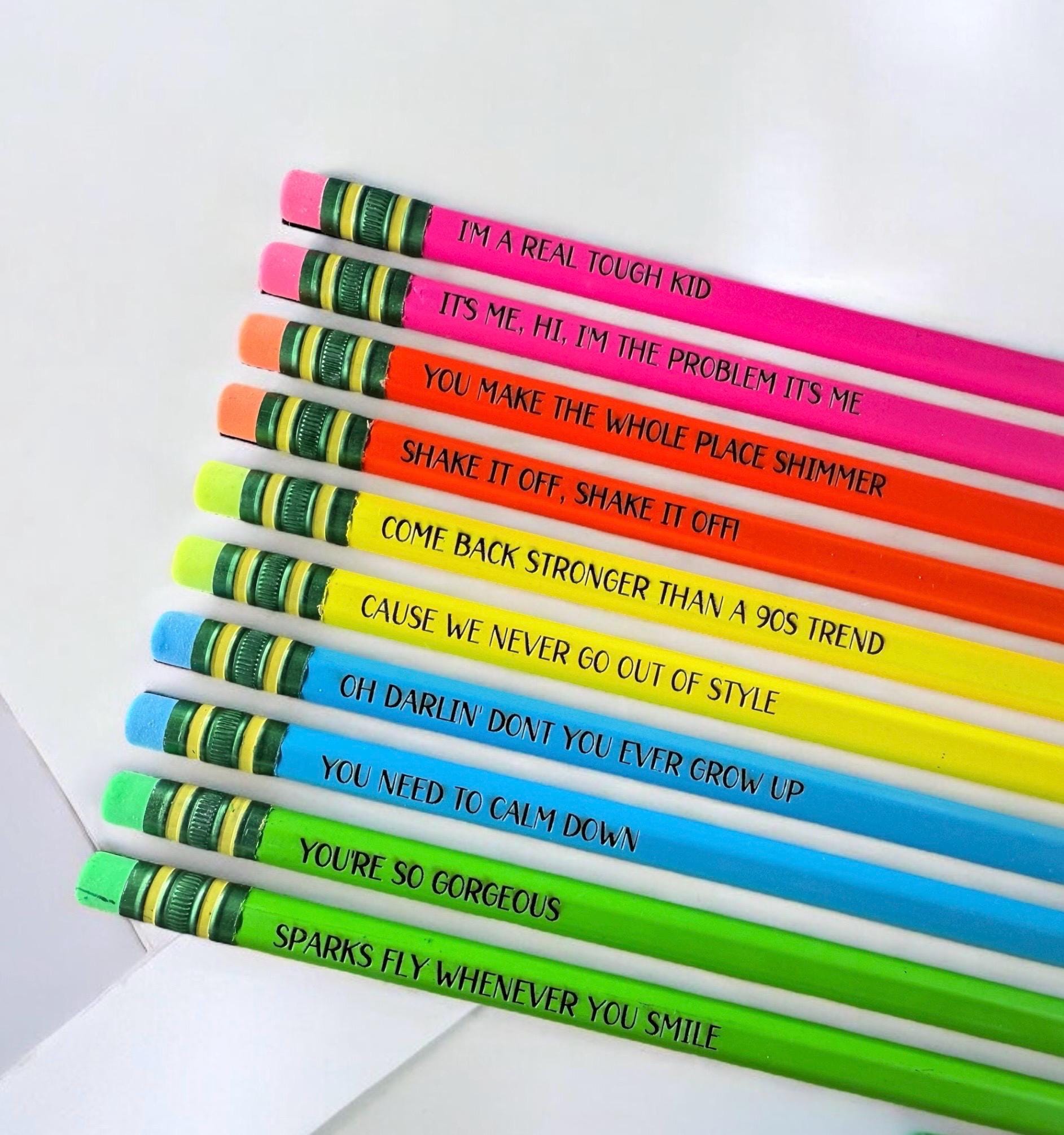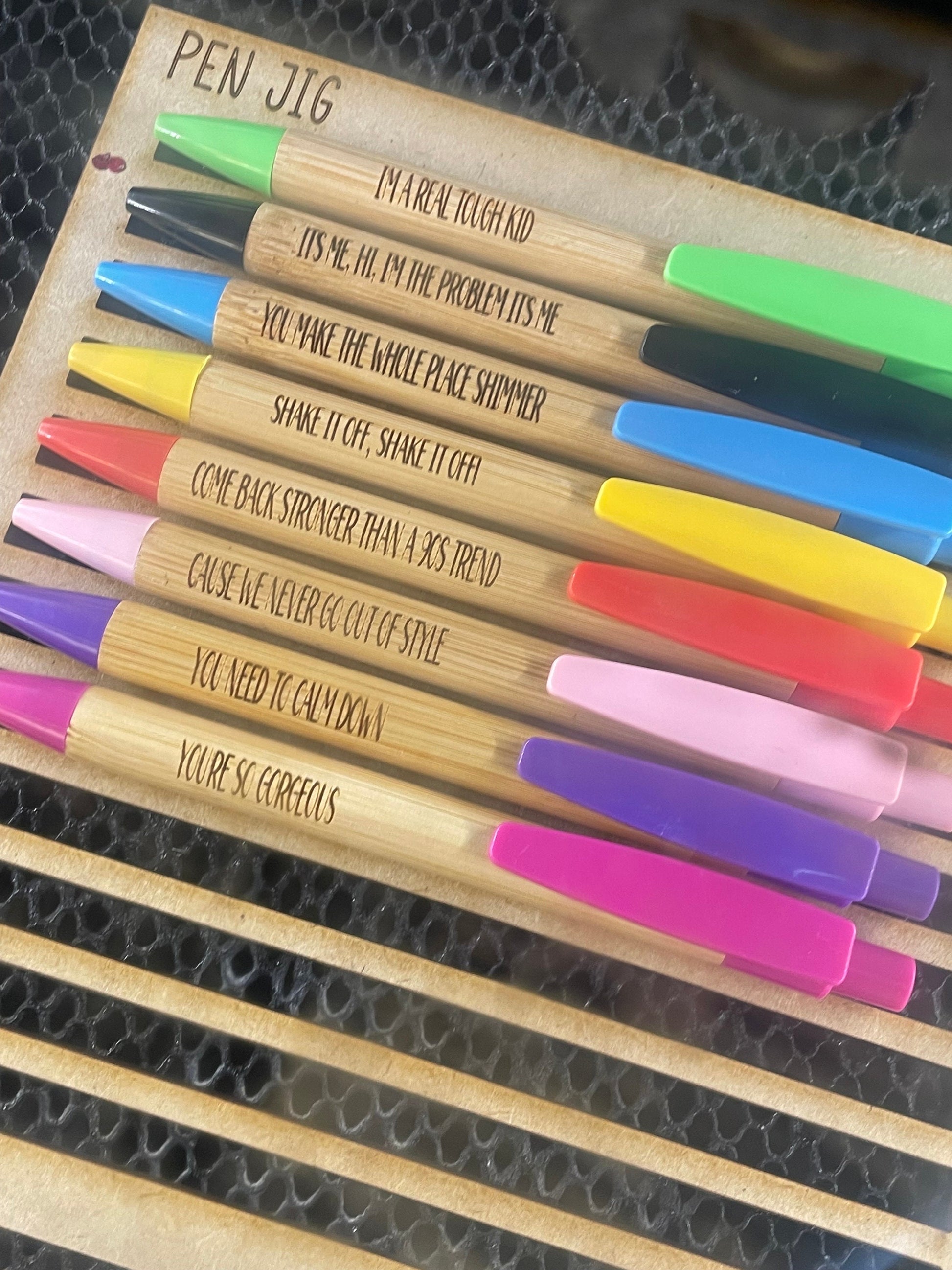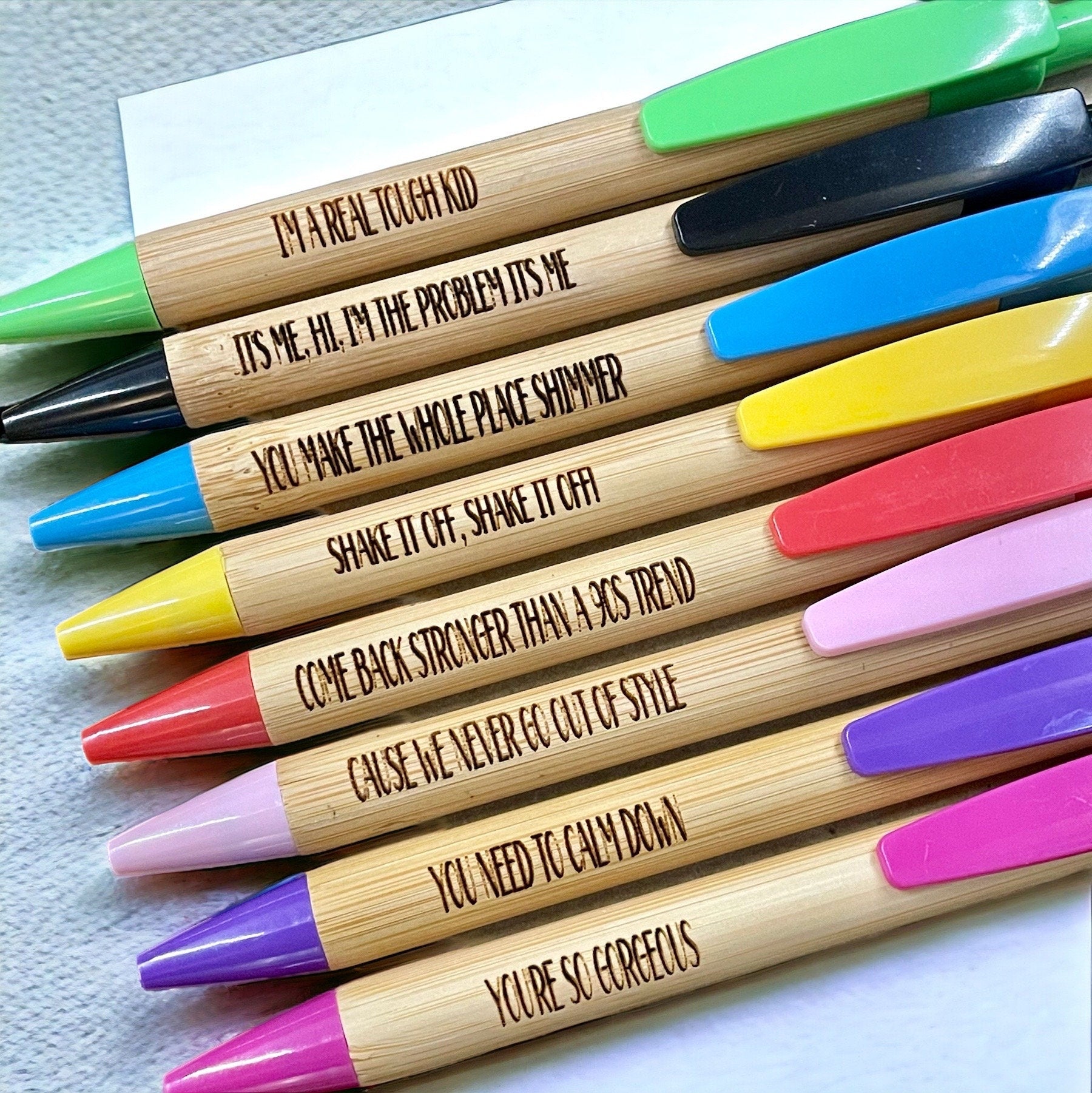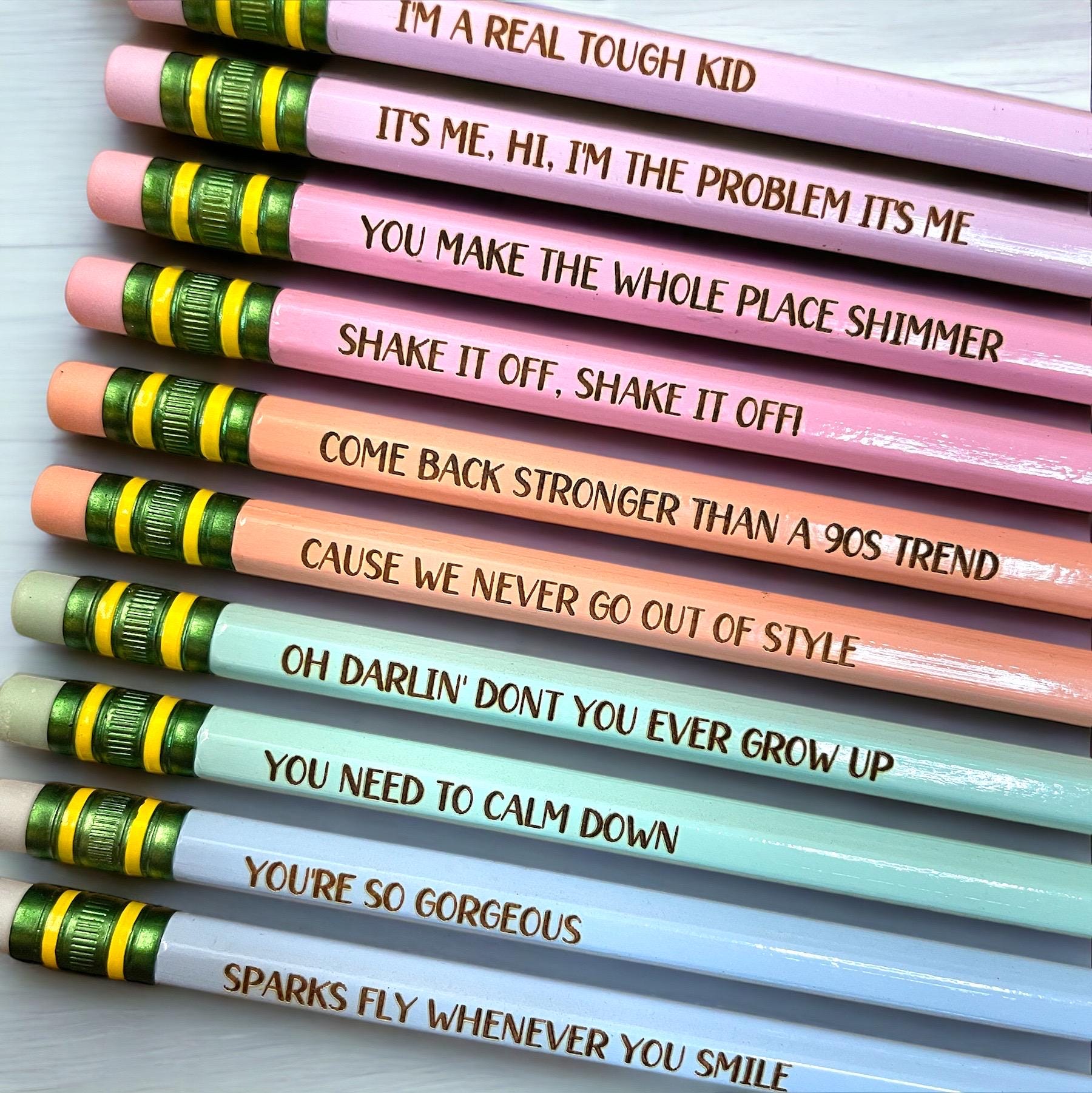 This listing is for a set of 10 laser engraved pastel pencils with assorted song lyrics as shown. OR a set of 8 colored bamboo/ plastic engraved ink pens. Each set is made to order. Pencils are presharpened Ticonderoga brand. Pens write in black ink.