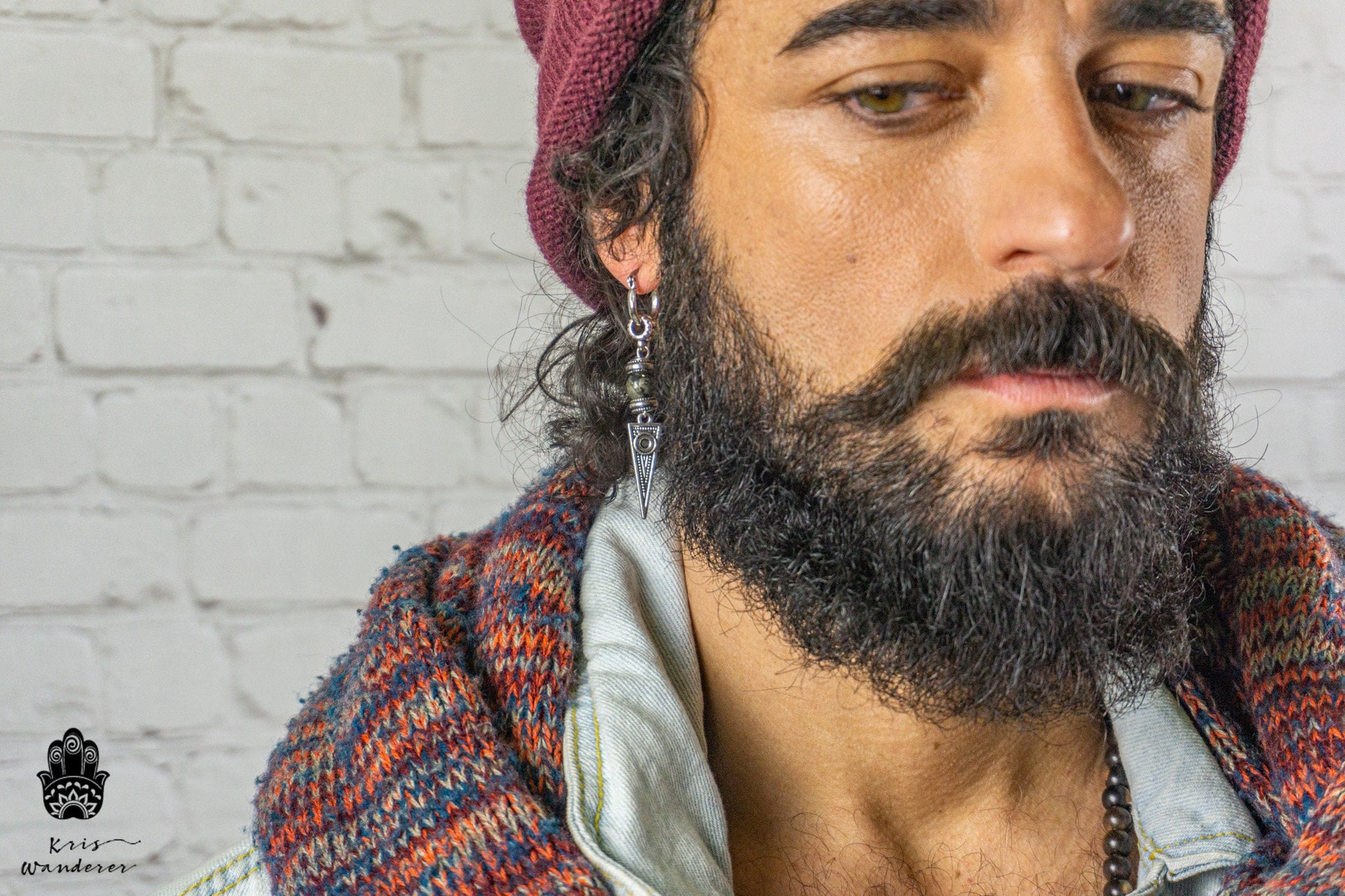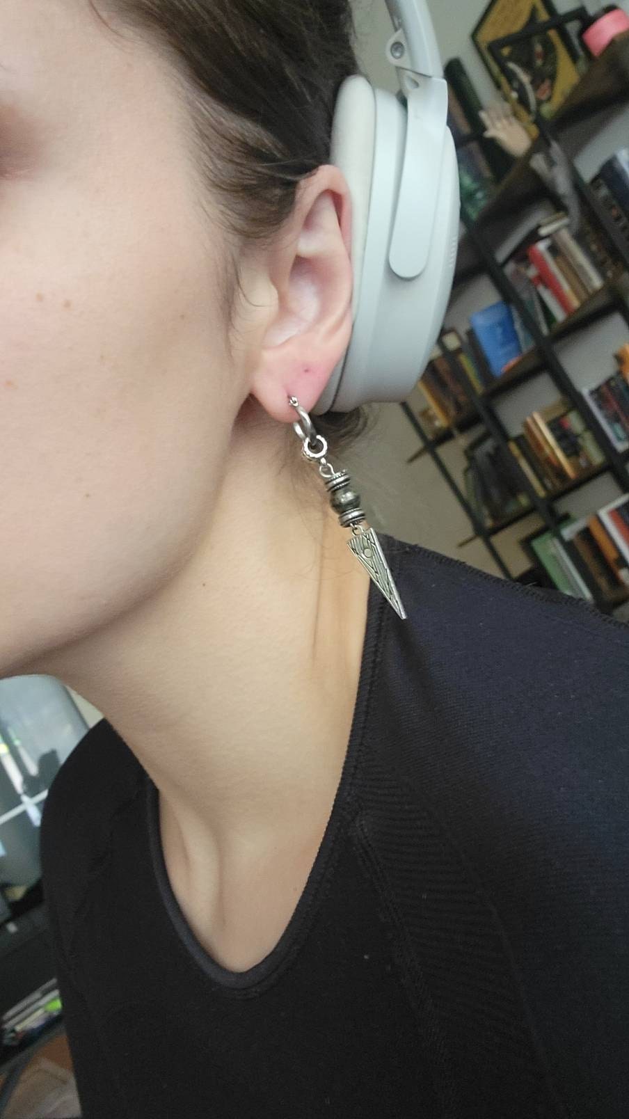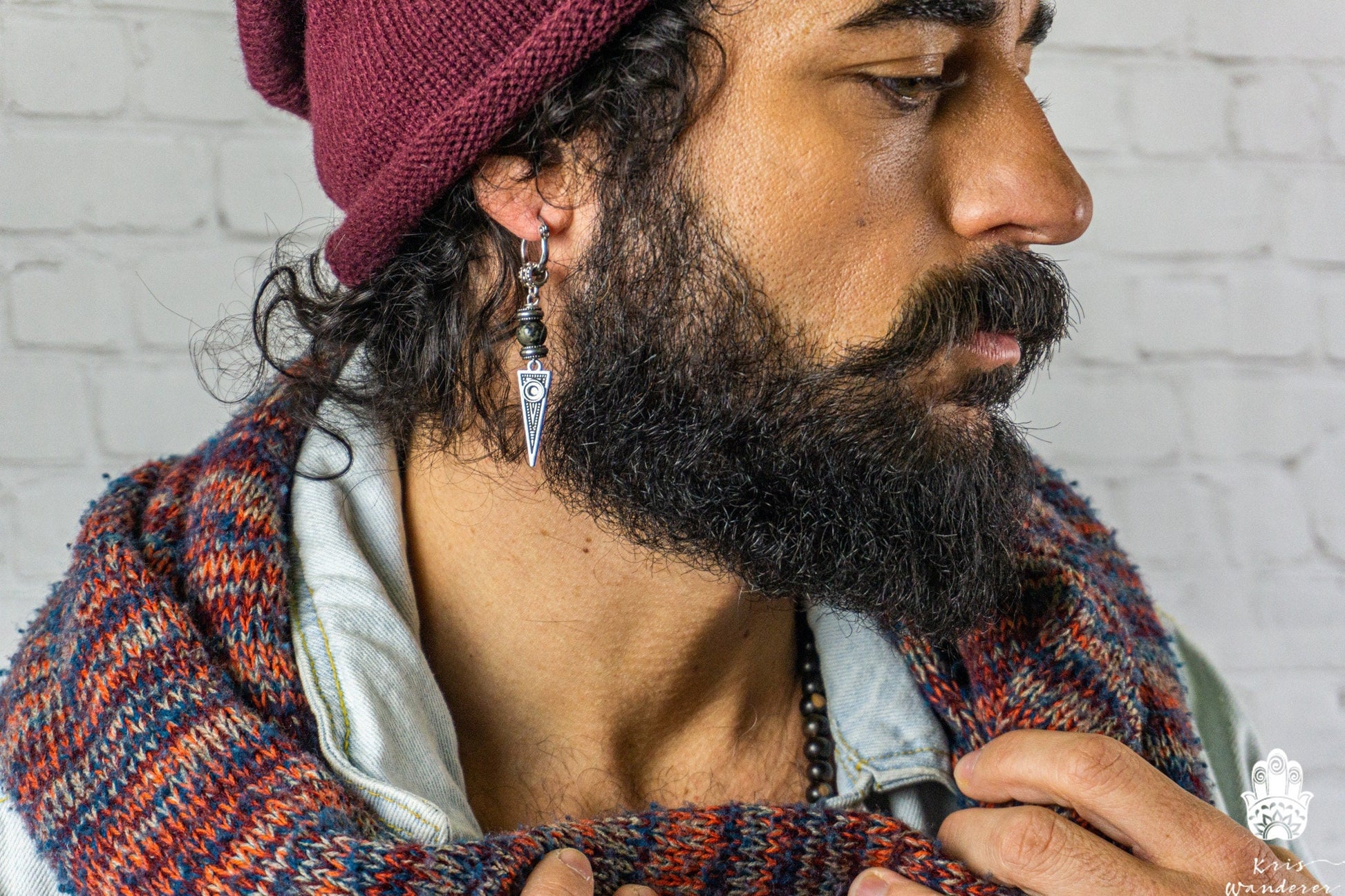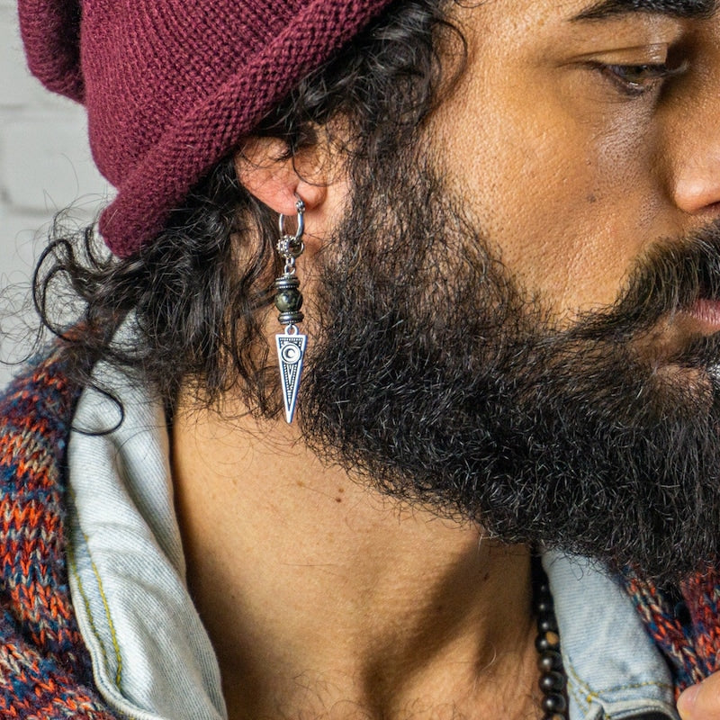 Long Dangle Triangle Gemstone Mens Earring- Stainless Steel Drop Earring For Men- Beaded Modern Pirate Hoop Earring- Silver Spike Earring
