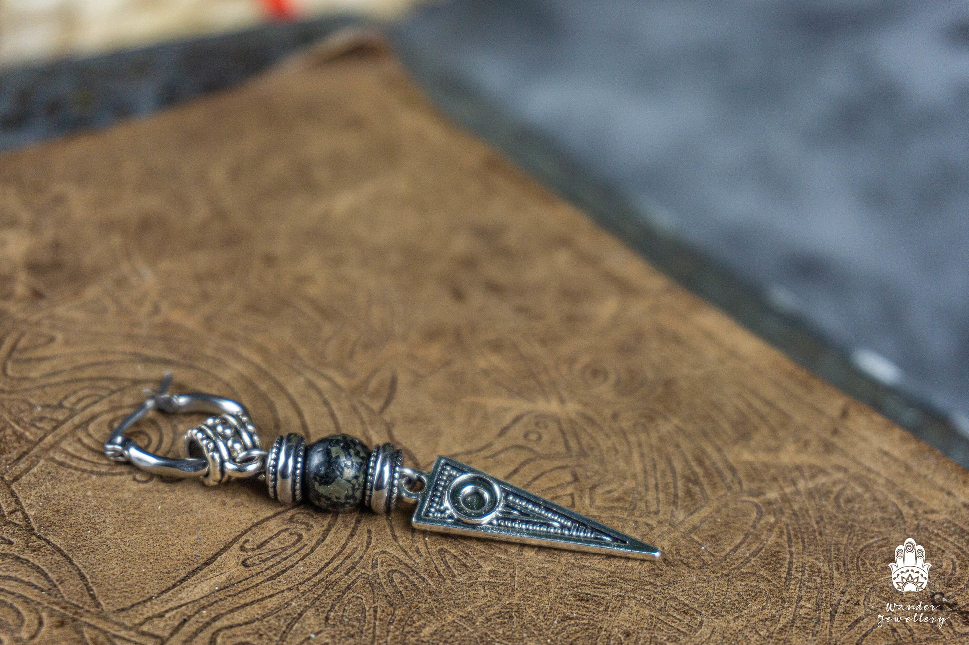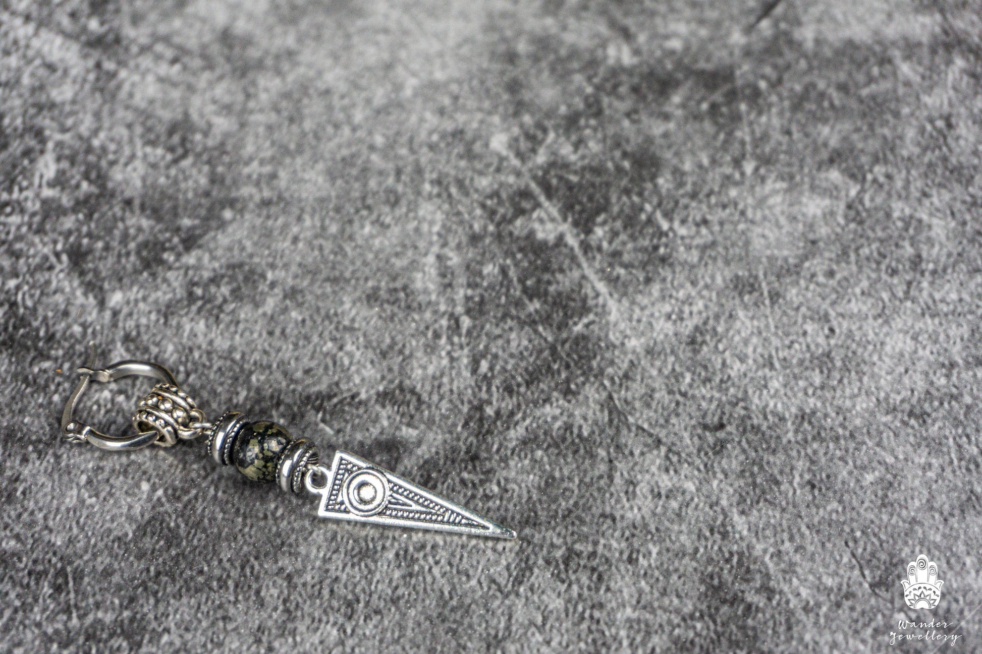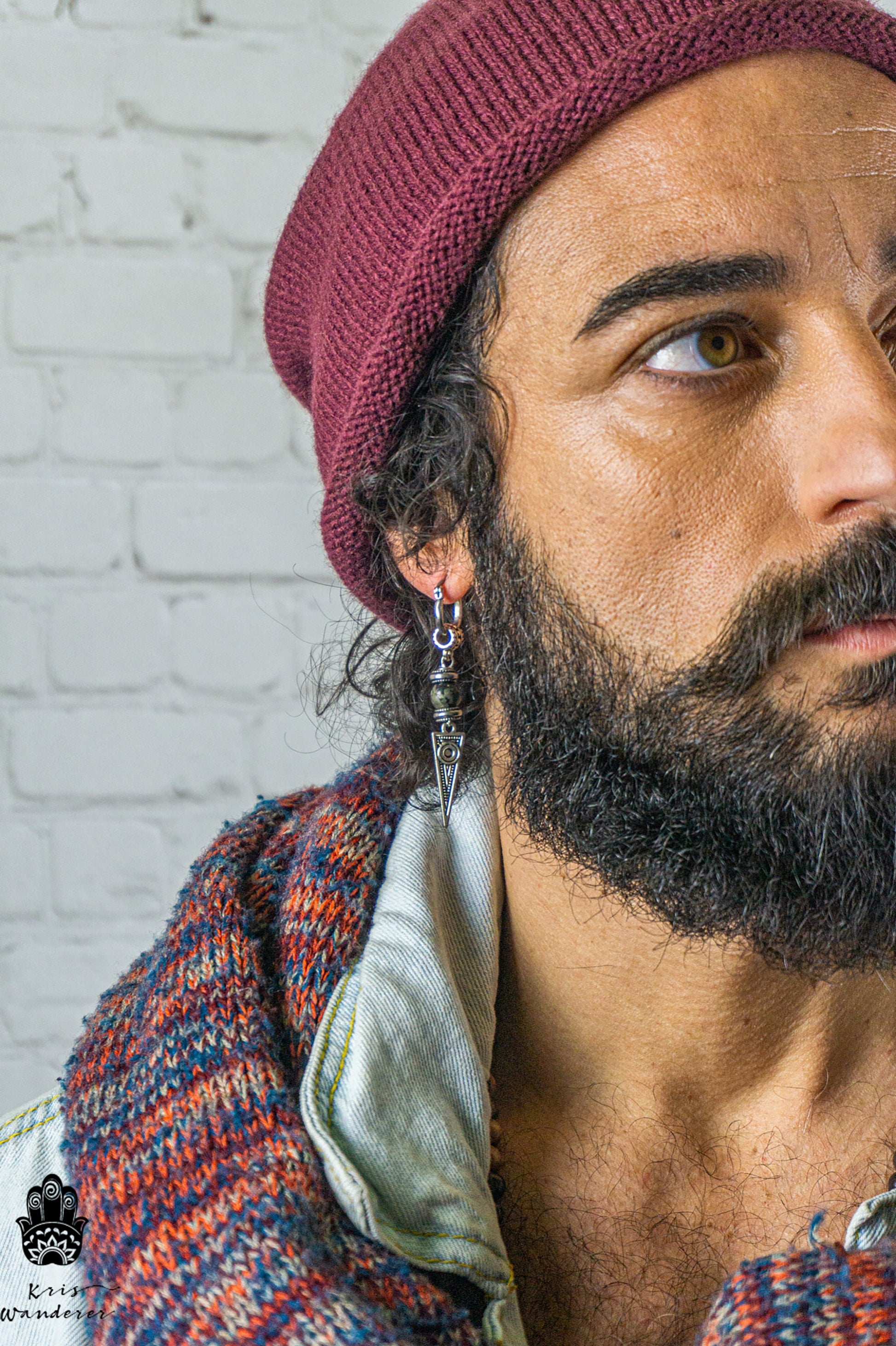 Long Dangle Triangle Gemstone Mens Earring- Stainless Steel Drop Earring For Men- Beaded Modern Pirate Hoop Earring- Silver Spike Earring