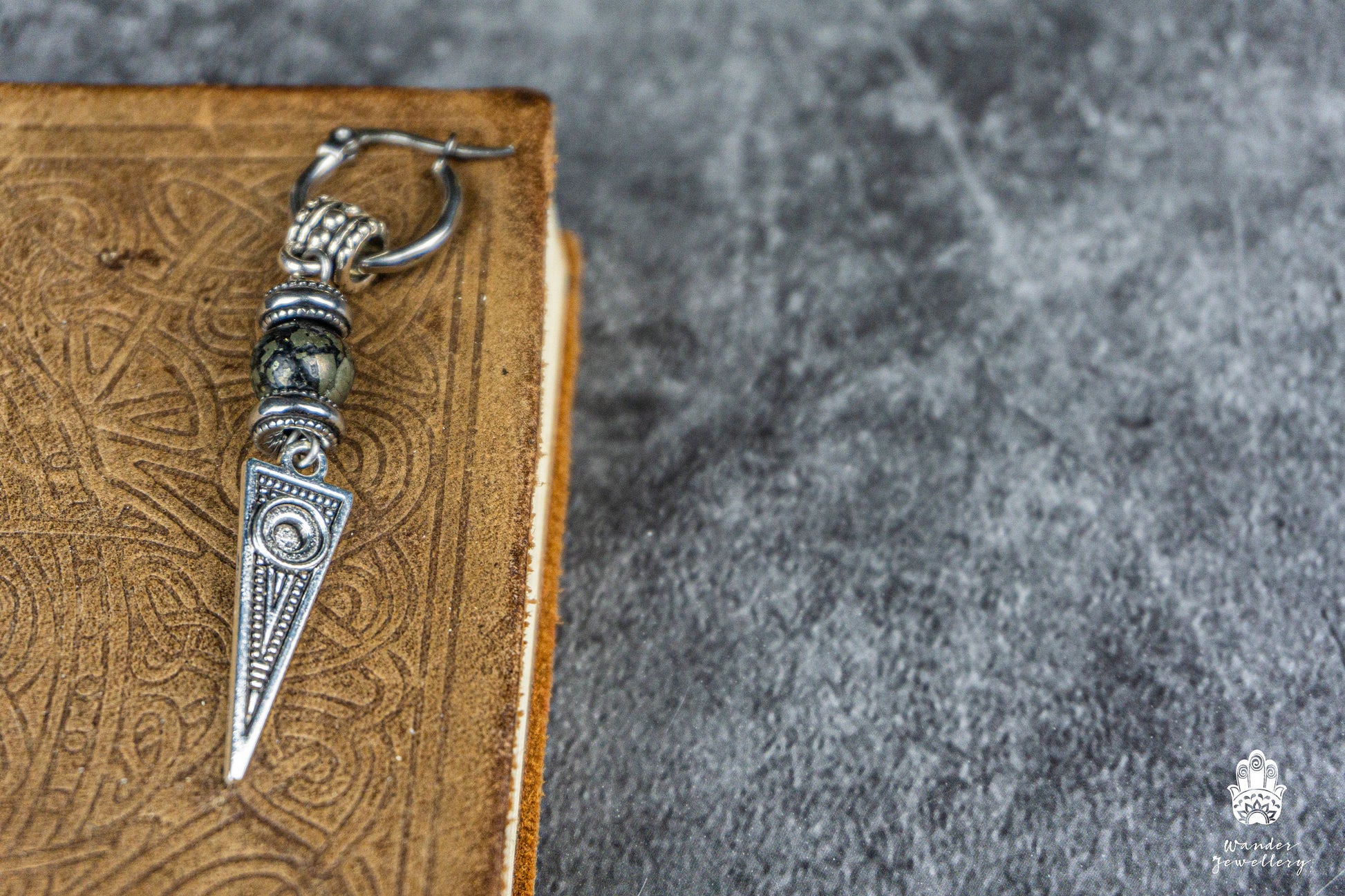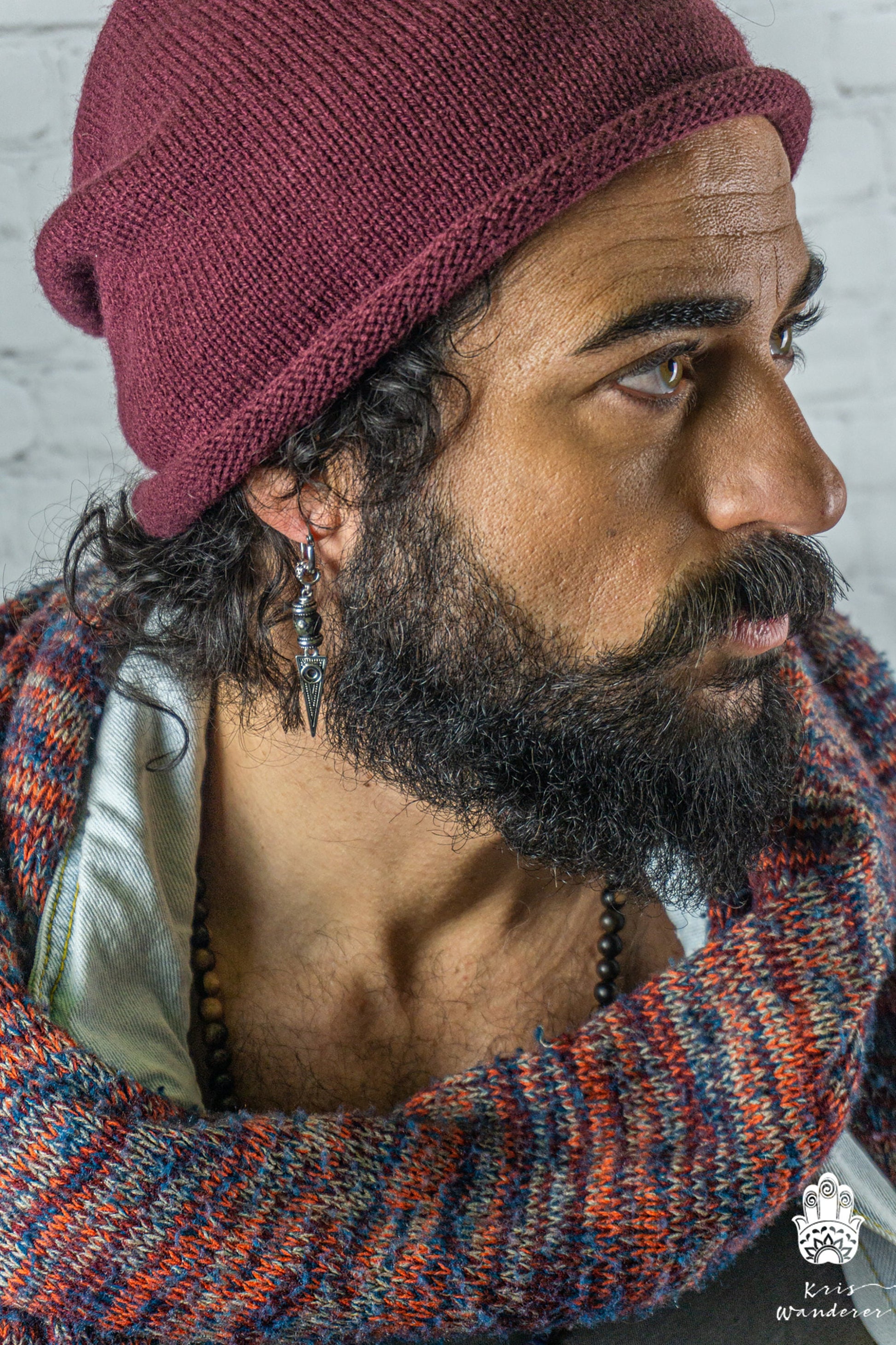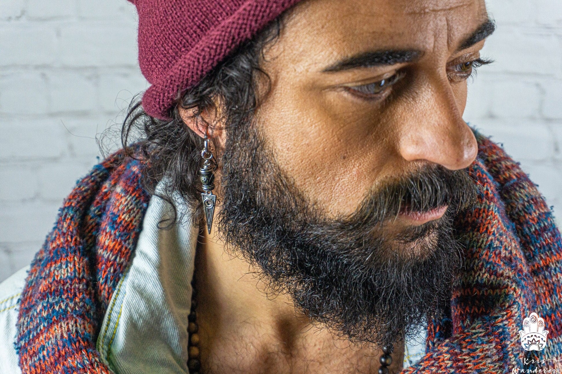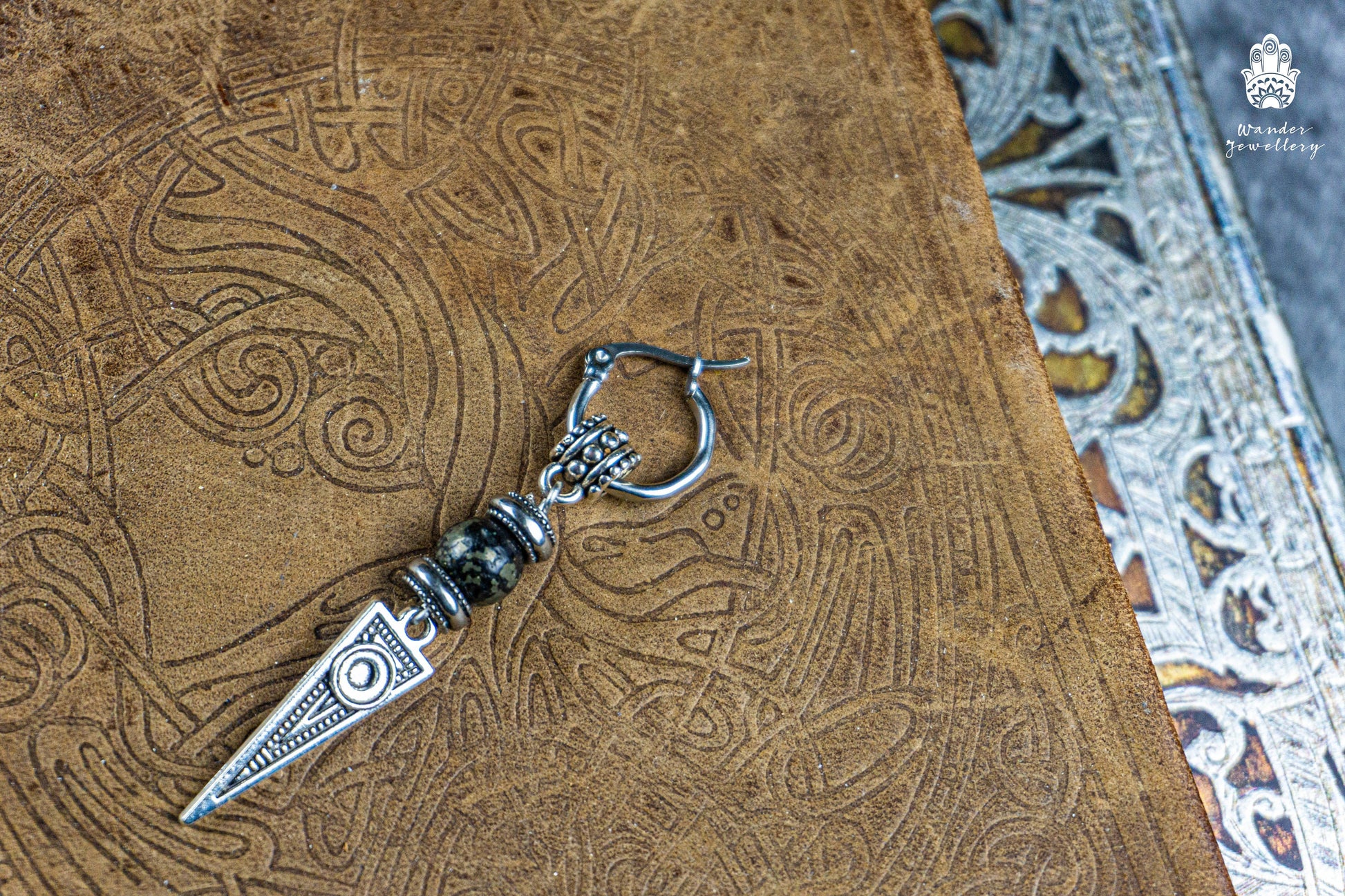 Long Dangle Triangle Gemstone Mens Earring- Stainless Steel Drop Earring For Men- Beaded Modern Pirate Hoop Earring- Silver Spike Earring