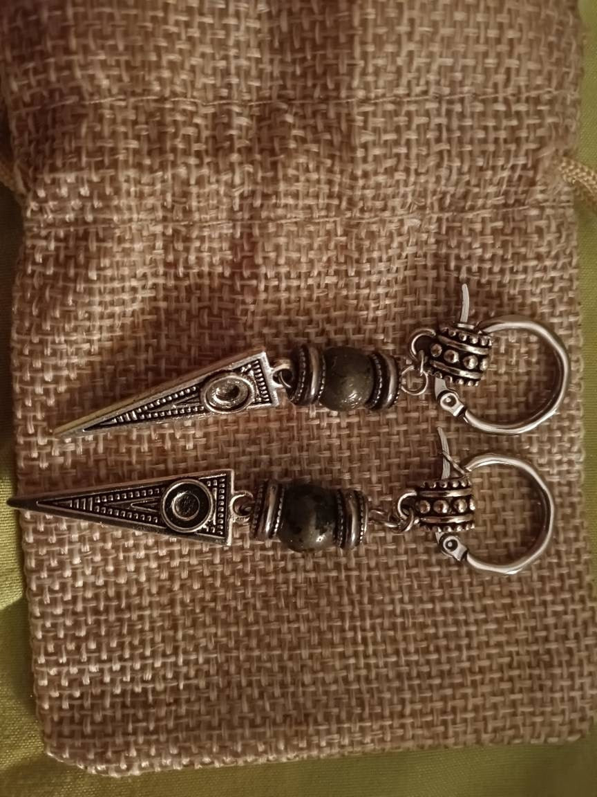 Beautiful Modern long dangle silver triangle earring with an 8mm natural Pyrite gemstone bead.
