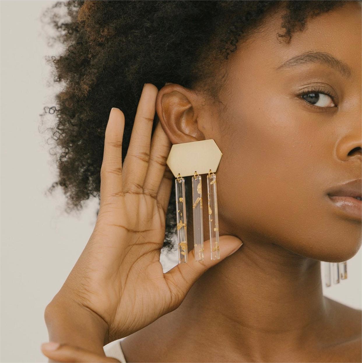 Minimalist Earrings Clear Acrylic Golden Brass Neutral Simplistic Casual Clip on Earrings, Valentine's Day Earrings, Contemporary Jewelry