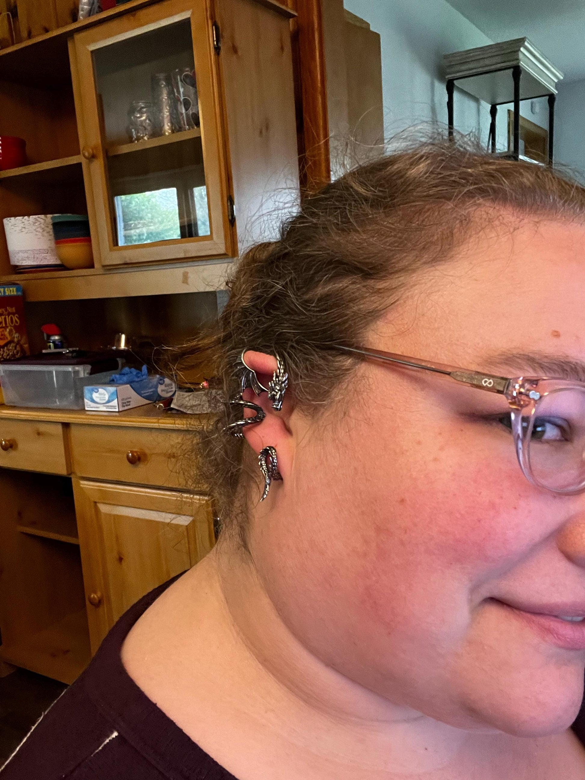 This gothic-inspired ear wrap features a unique dragon shape for a bold and edgy look. This versatile piece is a must-have for any jewelry collection. Unleash your inner fire with this unisex accessory.