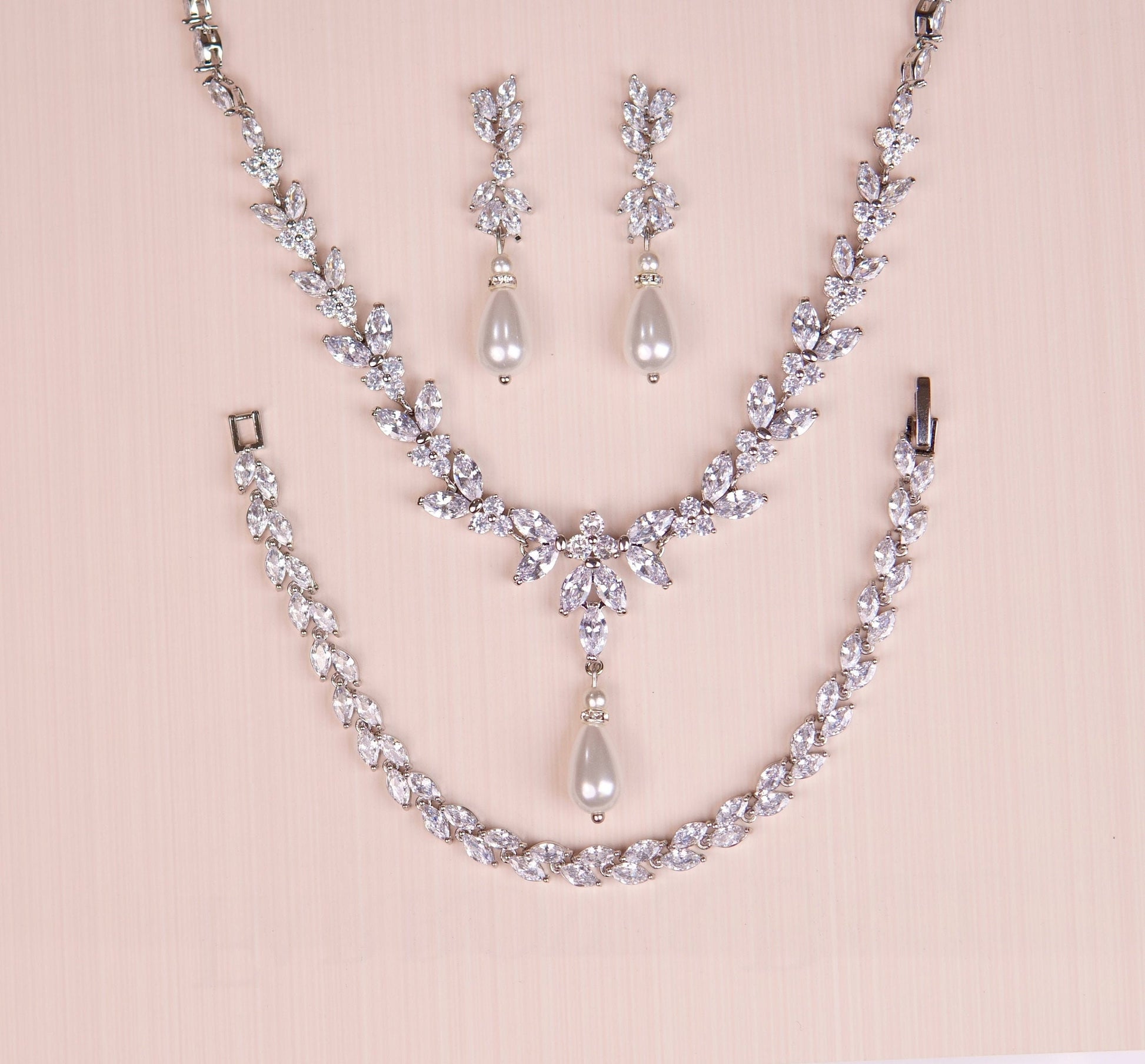 Pearl bridal jewelry set: necklace, bracelet and earrings.