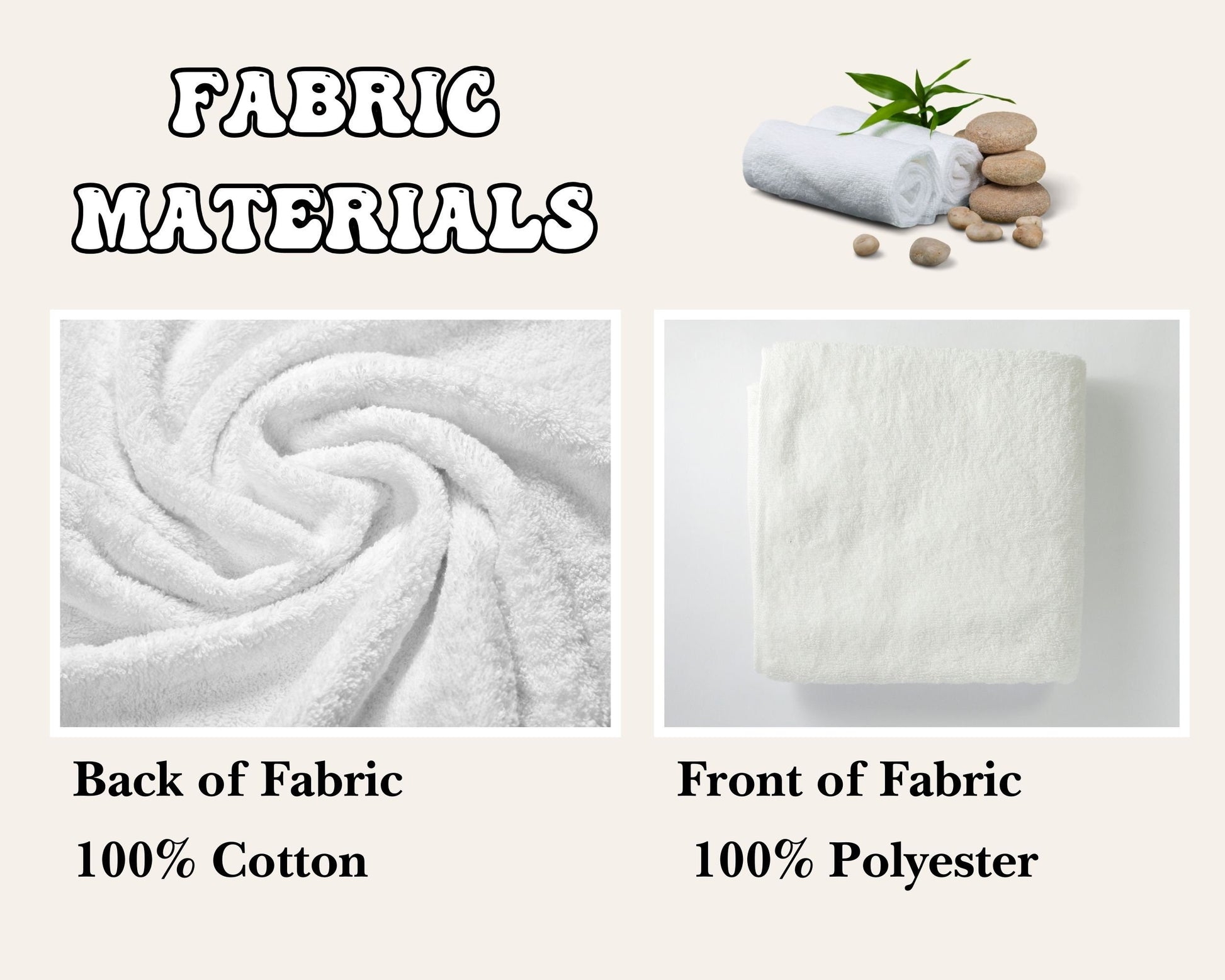 Print side of towels are 100% POLYESTER. Non print side (solid white) is 100% COTTON.