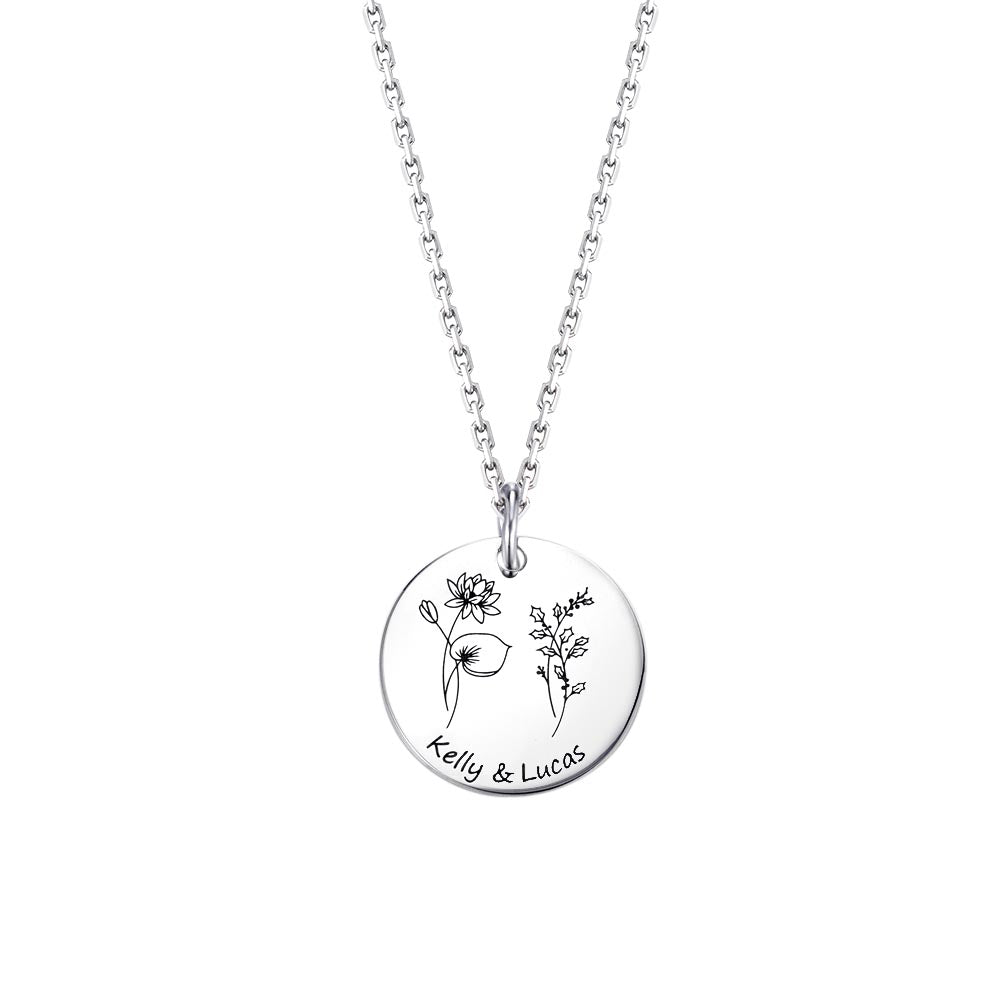 Personalized Engraving - The Custom Name Birth Flower Engraved Pendant Necklace is a unique and sentimental piece featuring 1-3 intricately engraved birth flowers. Customize it with name(s) for a truly personal touch that celebrates individuality.