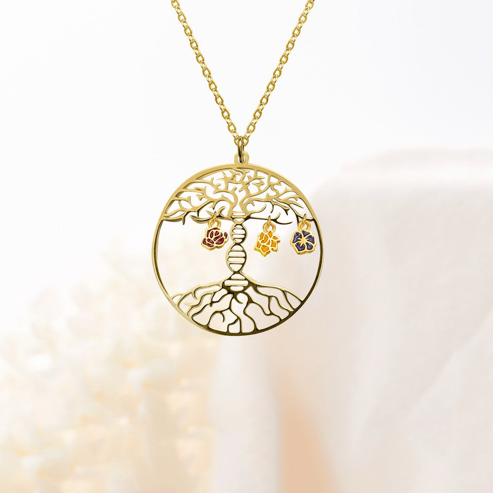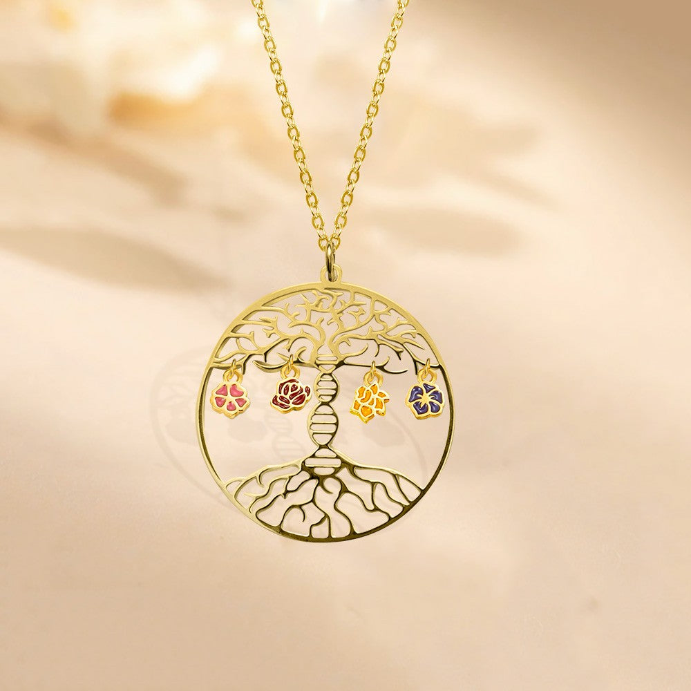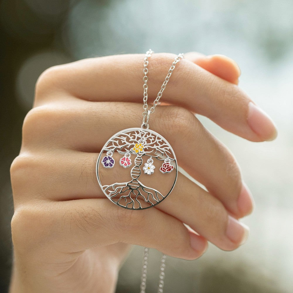 Personalized DNA Tree of Life Necklace with Birth Month Flowers, Family DNA Jewelry, Double Helix Biology Jewelry for Grandma/Mom/Her