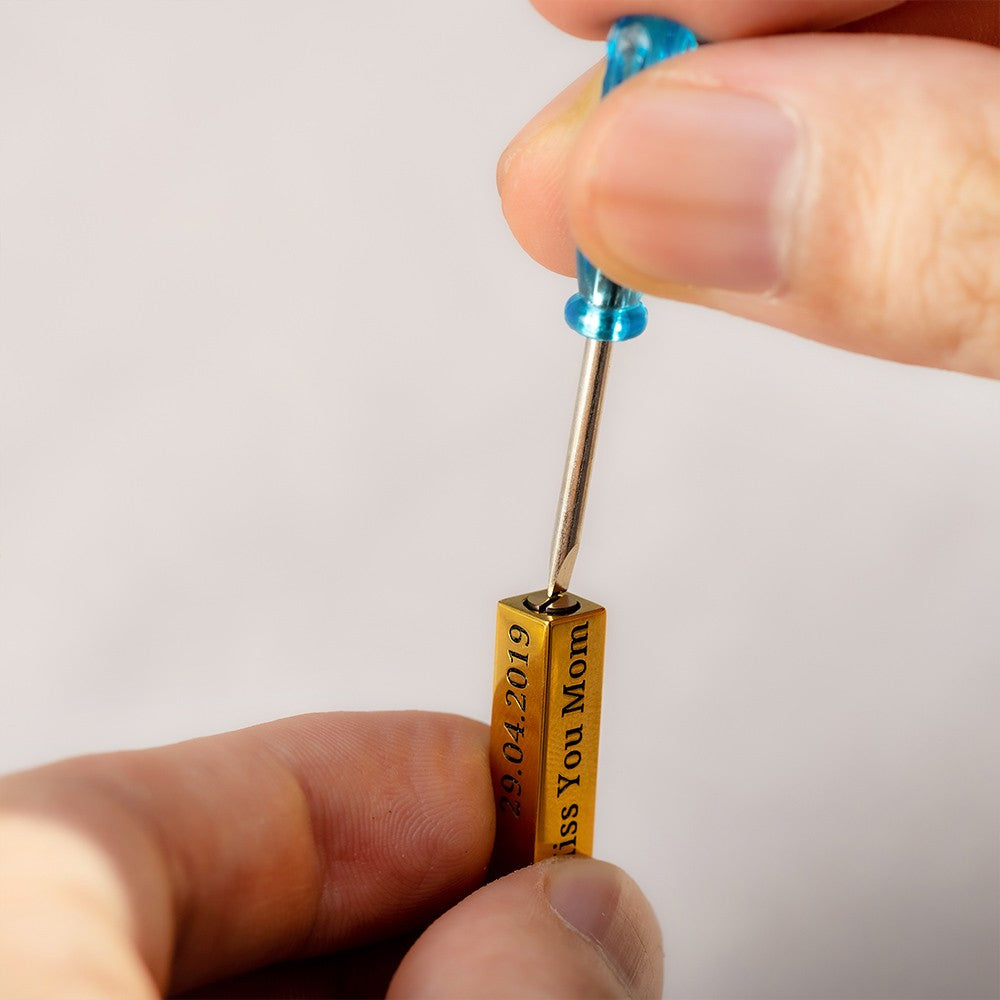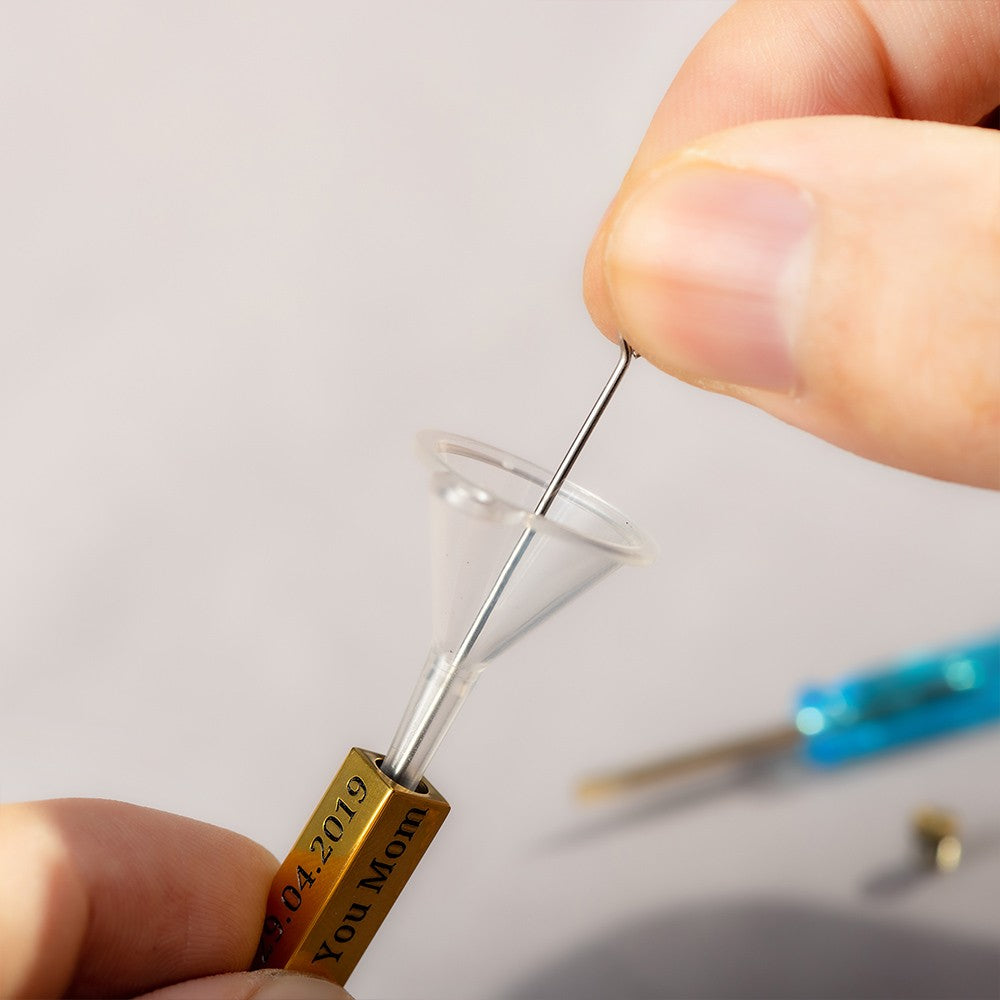 How To Use - To fill the pendant, you just unscrew the cap and use the mini urn to fill a small amount of sand into the bar. It is recommended that you put a drop of glue on the end of the screw before tightening it to ensure the screw stays sealed forever.