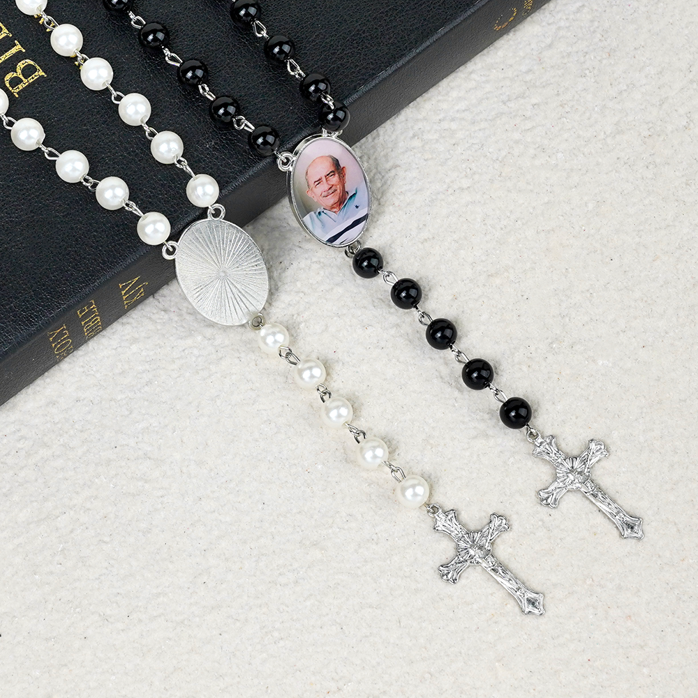 Custom Photo Rosary Beads Necklace - This rosary beads necklace offers personalization, allowing you to add a photo to the pendant. It combines the spiritual significance of a rosary with the sentimental value of a cherished photograph, creating a unique and meaningful piece. It serves as a visual reminder of faith and spirituality, while also honoring a special person or memory captured in the photo.