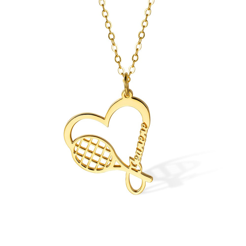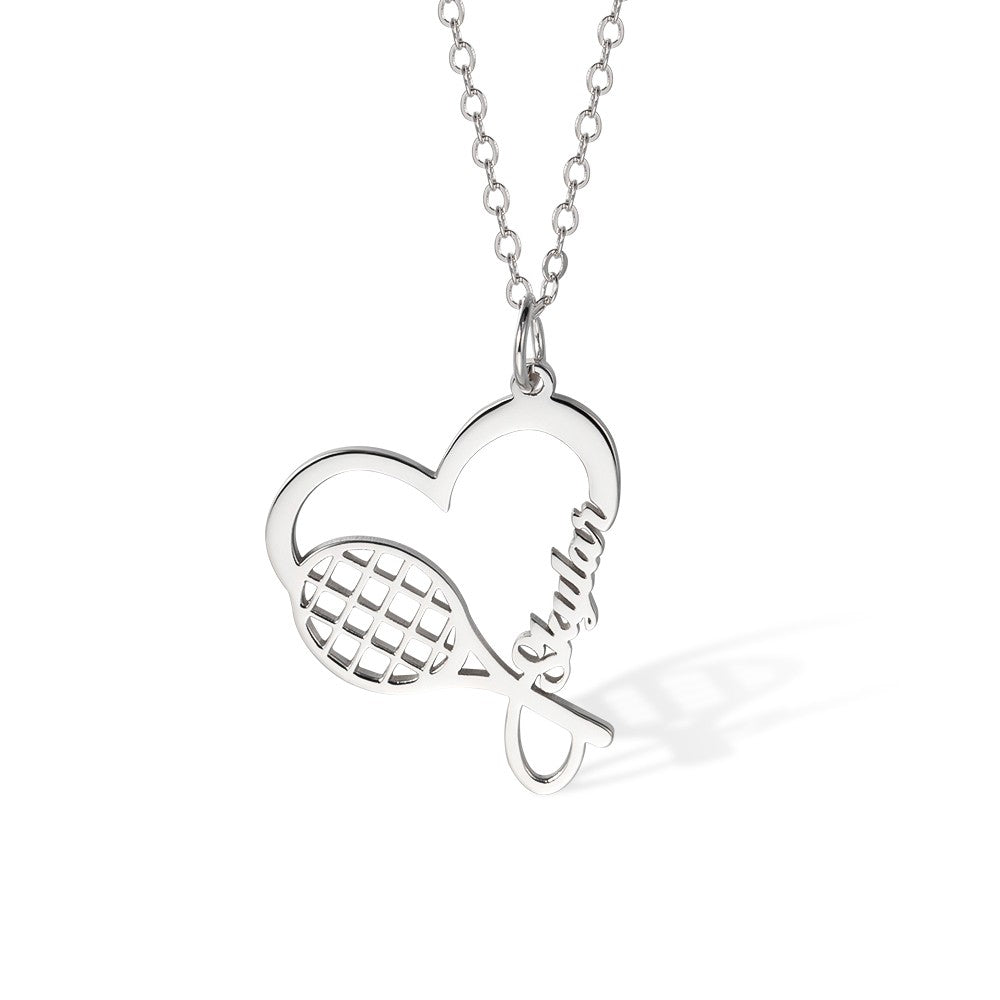 Personalized Name Tennis Racket Necklace, Silver Tennis Necklace with Heart Charm, Sports Necklace, Birthday Gifts, Gifts for Athlete/Sport Lovers