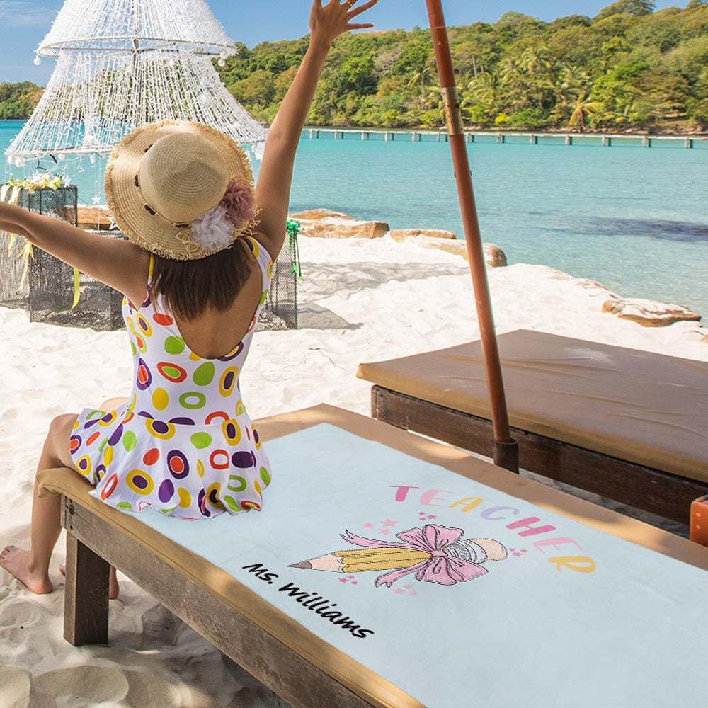 Teacher Gift - Surprise your favorite teacher with this personalized cute pink bow pencil beach towel. It's a thoughtful choice for Teacher's Day, Teacher Thanksgiving, or a Christmas gift to show gratitude.