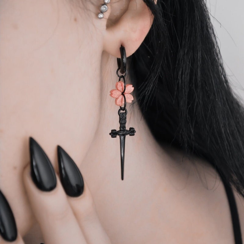 Sakura Blade Black Earrings | Cherry Blossom Sword Jewelry | Gothic Alt Earrings | Fantasy Floral Weapon Aesthetic | Stainless Steel