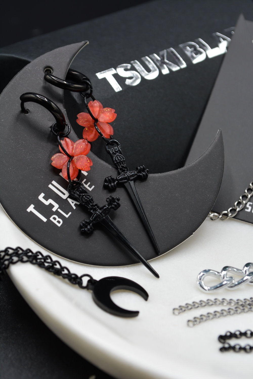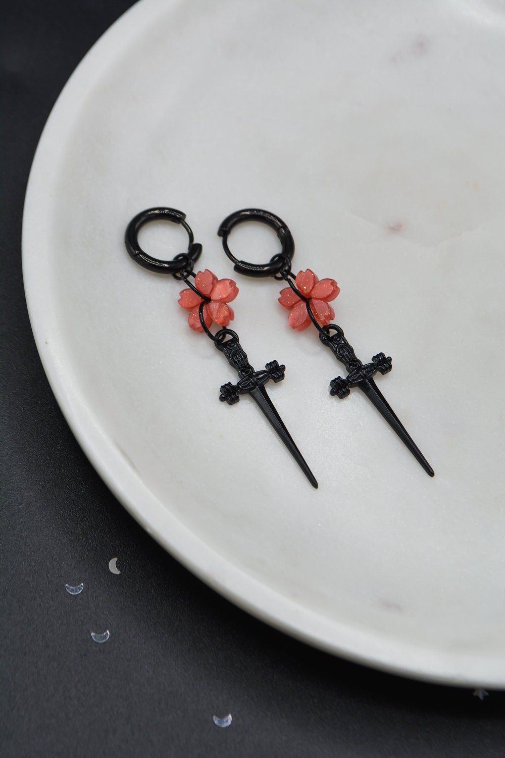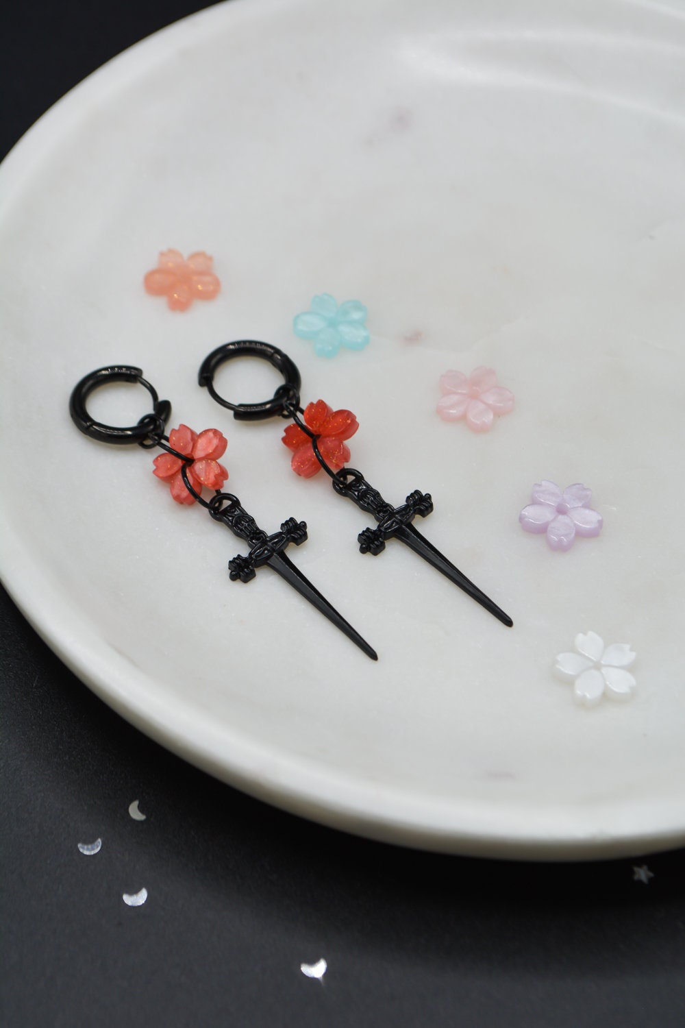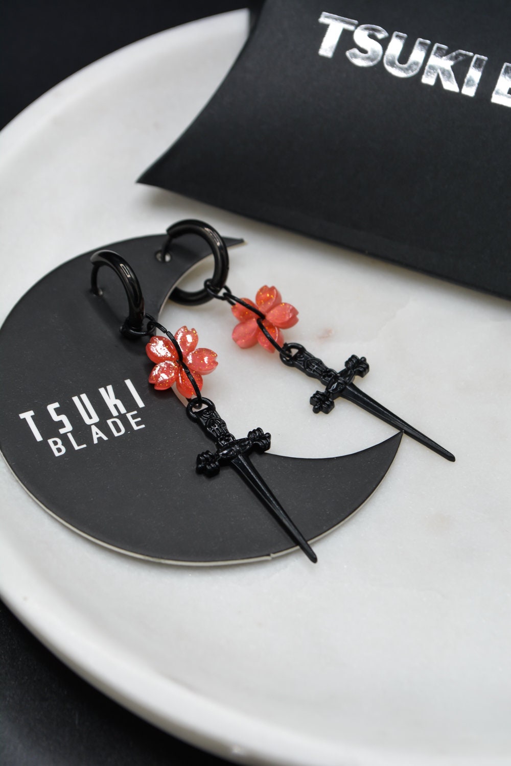 The perfect balance between ethereal and badass, fully black dagger blades finished to perfection with a cherry blossom pendant of your choice.