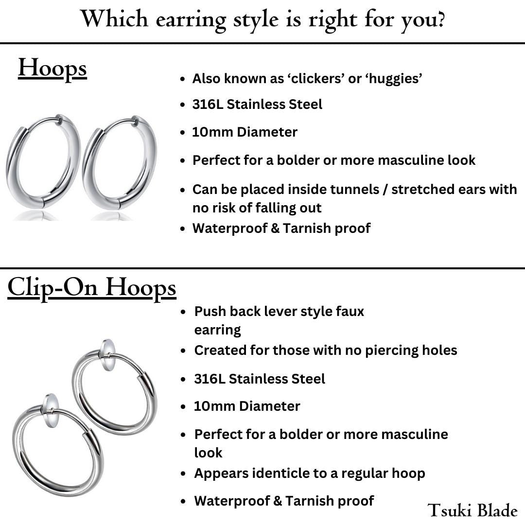 ★ 2 earring types available: Plated Stainless Steel hoops, or Plated Clip On Hoops.