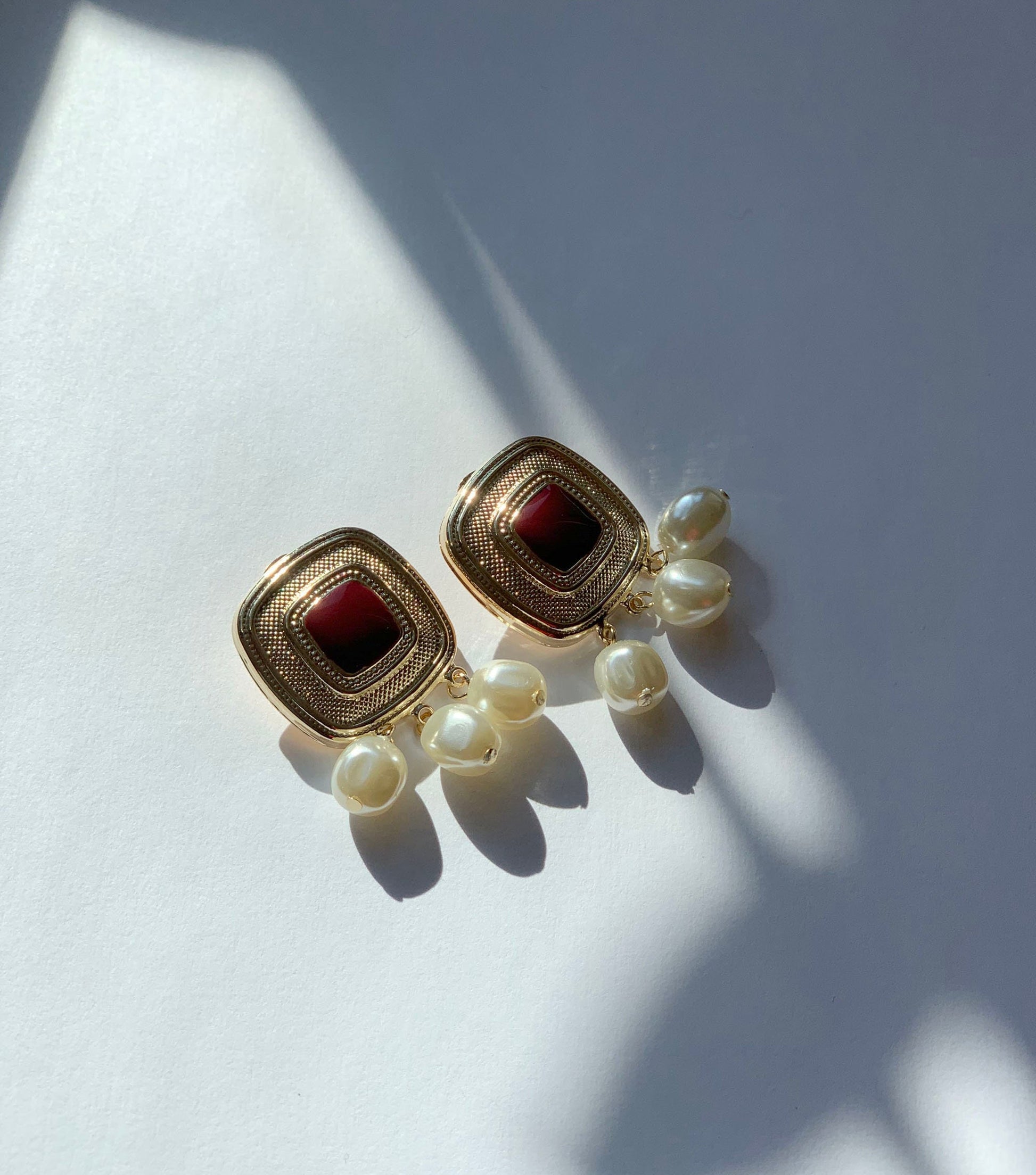 Square drop pearl earrings - Vintage style pearl earrings - Unique earrings - Pearl dangle earrings -Vintage gold earrings MK