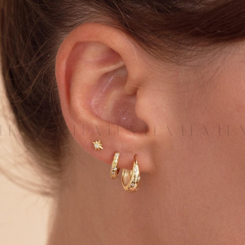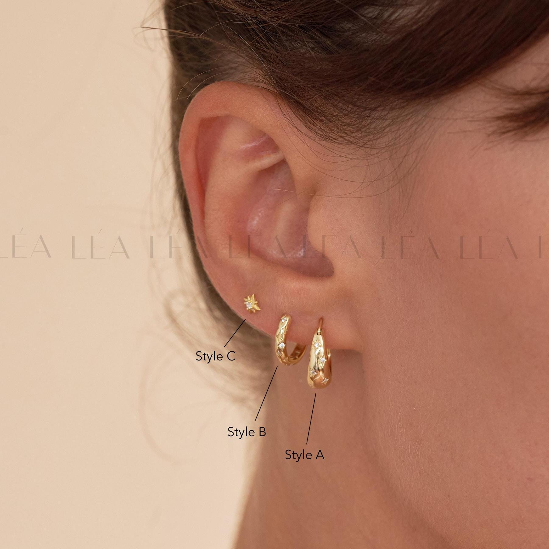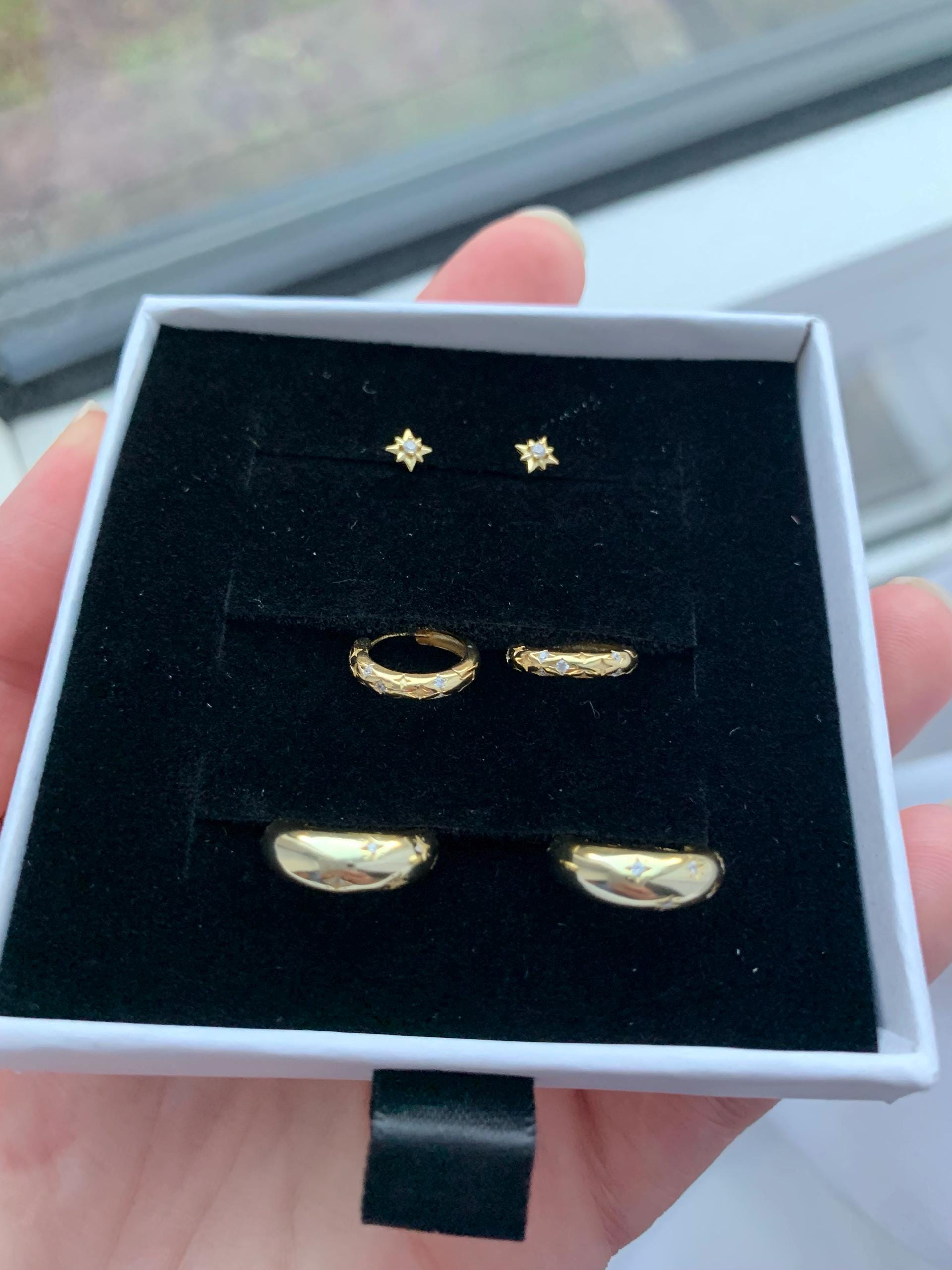 Enhance your style with our 18K Gold Earring Set, featuring three elegant designs perfect for any occasion. This set includes a tapered earring with CZ stars, a delicate starburst huggie hoop, and a dainty star stud, all crafted in luxurious gold. Each piece adds a touch of sophistication and versatility to your jewellery collection, making it an ideal gift or a chic addition to your own look. Whether worn together or separately, these earrings bring effortless elegance to any outfit.